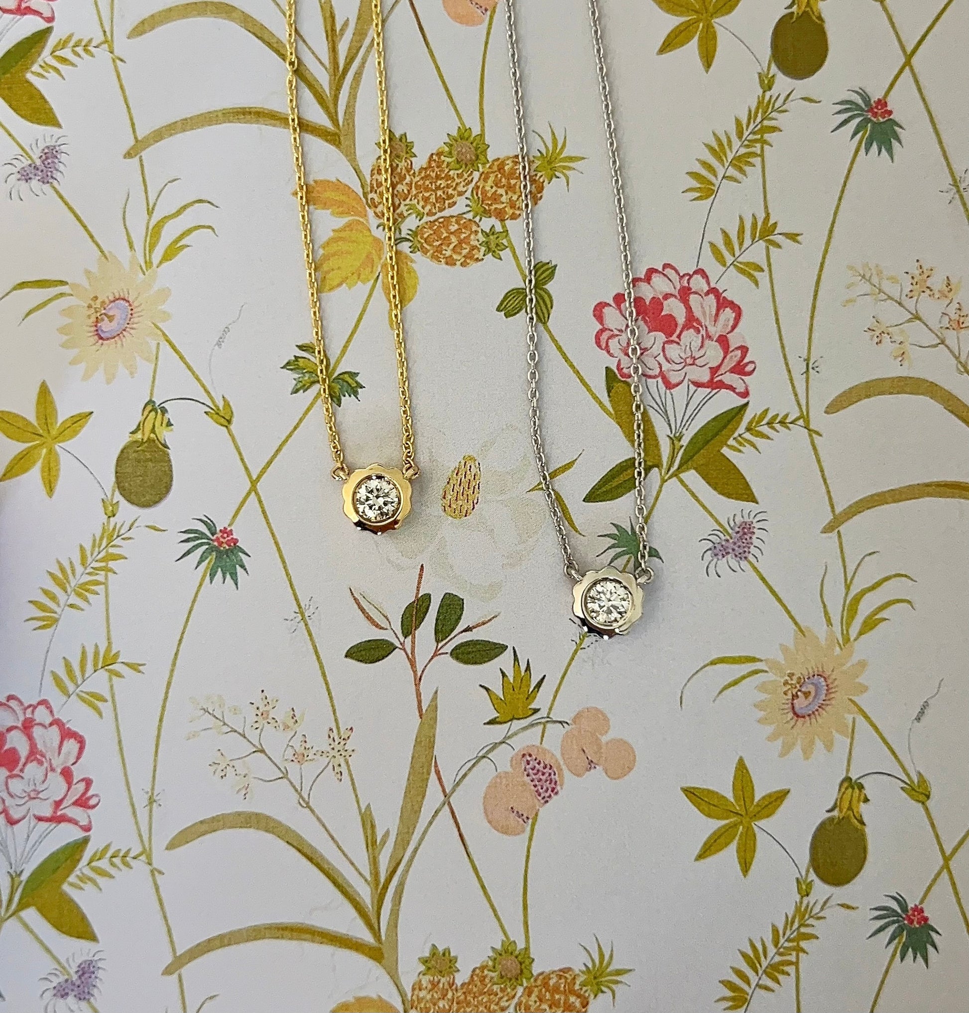 Elegant and versatile, the Scalloped Bezel Diamond Necklace features a sparkling diamond framed in our signature scalloped setting for a timeless look. Its adjustable bolo tie closure allows you to wear it from 16 to 10 inches, offering the perfect fit for any neckline and layering look.