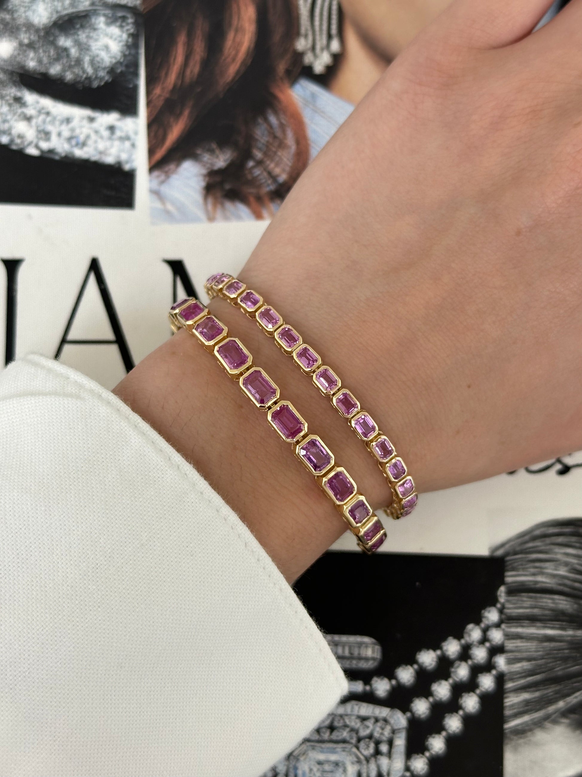 Featuring emerald-cut pink sapphires, this tennis bracelet is the ultimate statement piece. Designed for those who adore everything pink and feminine, it's a must-have accessory for the girly-girl in you.