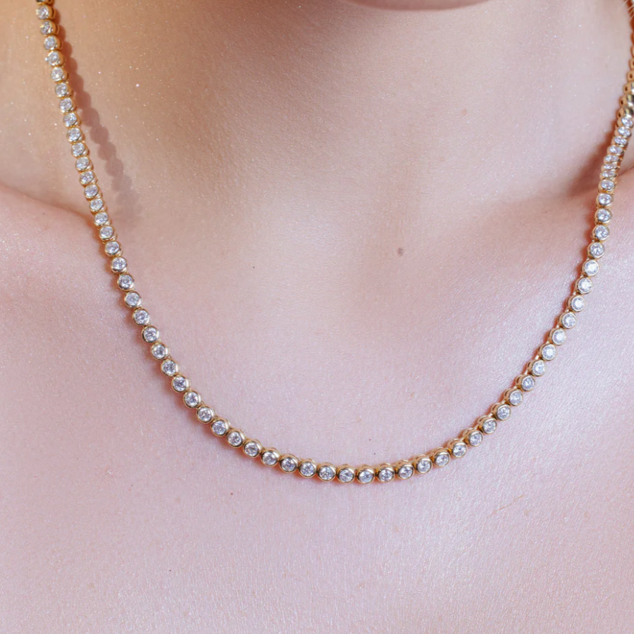 A classic tennis necklace for any occasion. The Diamond Tennis Choker features diamonds that sit right against the neck. We have worked hard to ensure this piece does not roll or flip, the diamonds sit upright. The perfect piece to start layering!