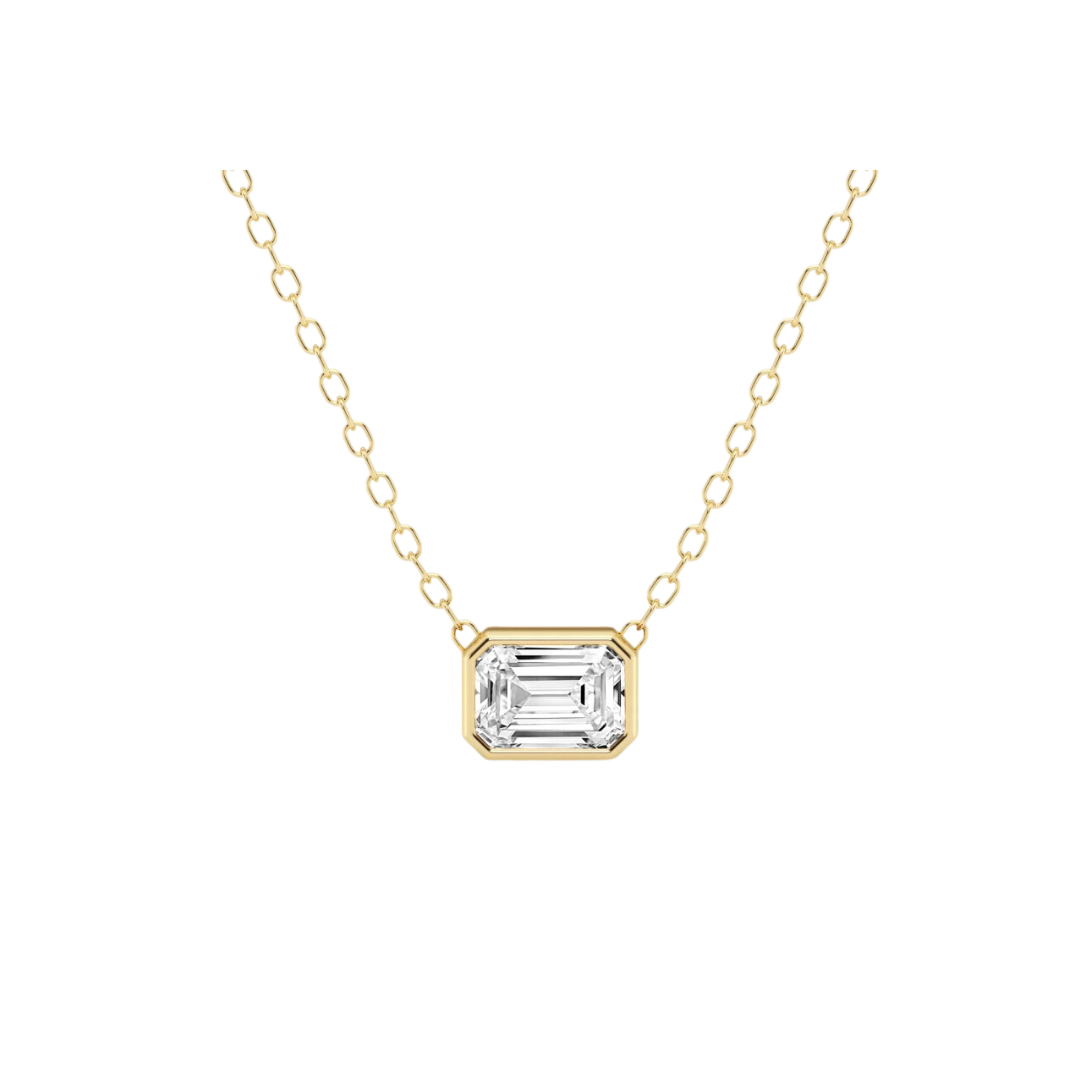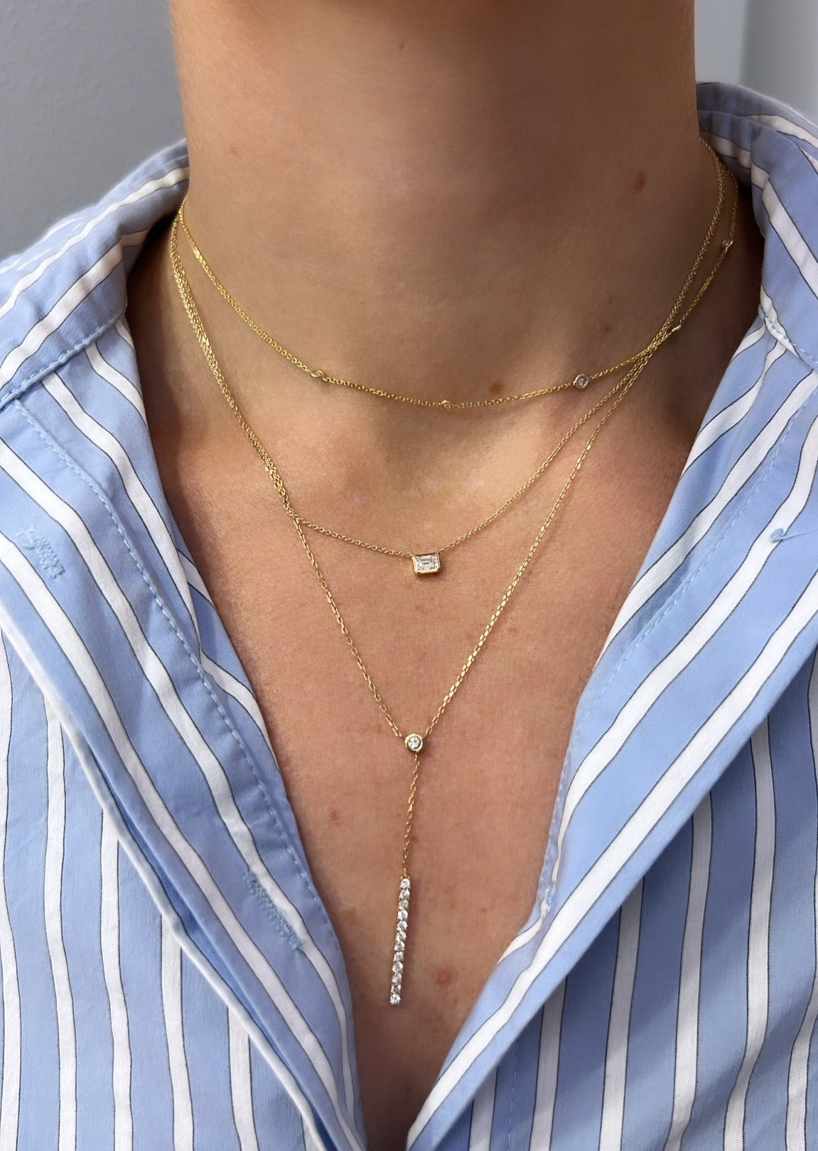 Sometimes, simple is best. There is nothing as classic and chic as a diamond layering necklace. A single emerald cut diamond wrapped in a 18 karat gold bezel setting hangs on an adjustable 18k gold cable chain for a look you'll never tire of. This understated minimal beauty will look gorgeous on its own and shine among your other HN layering necklaces.