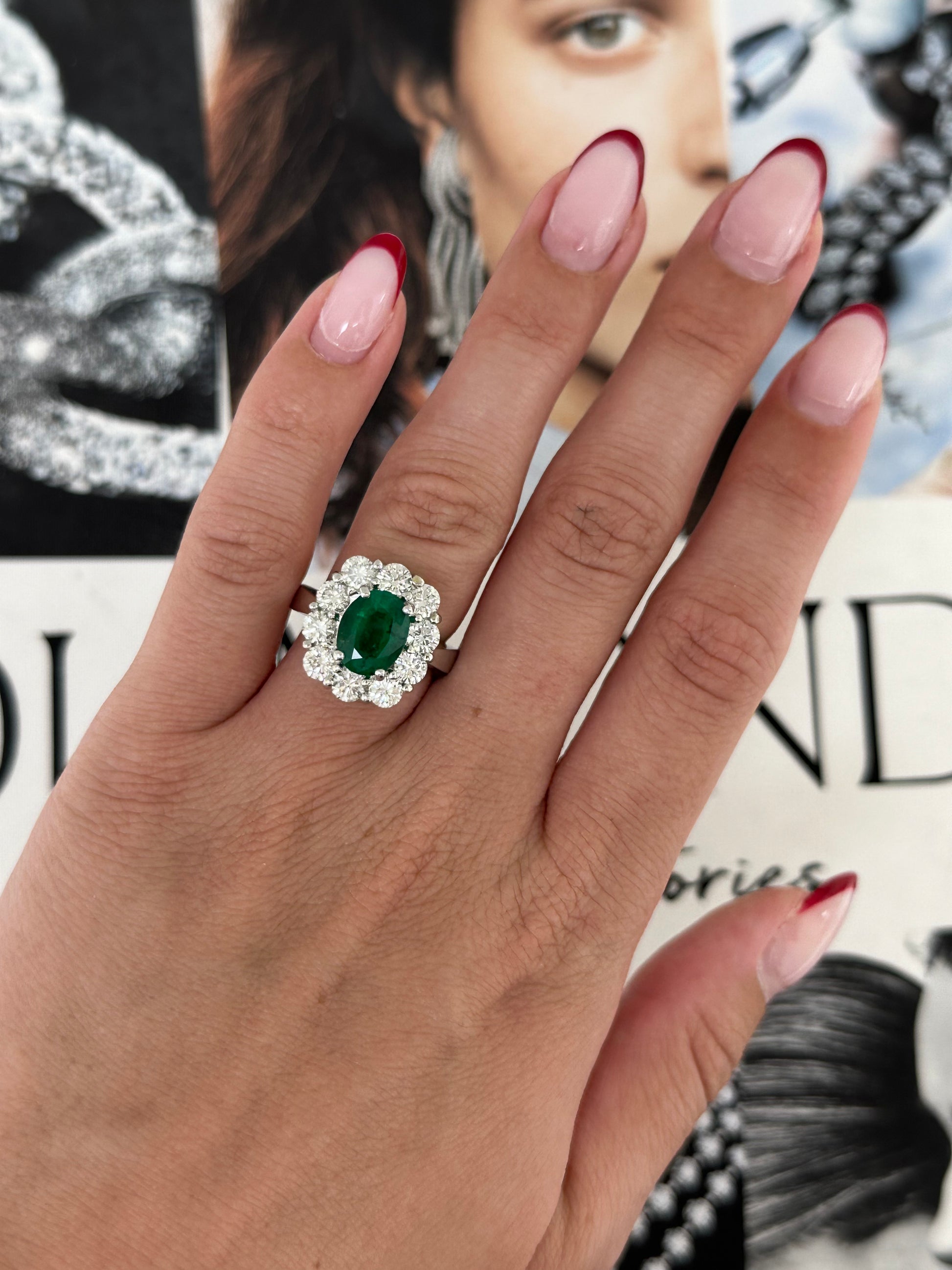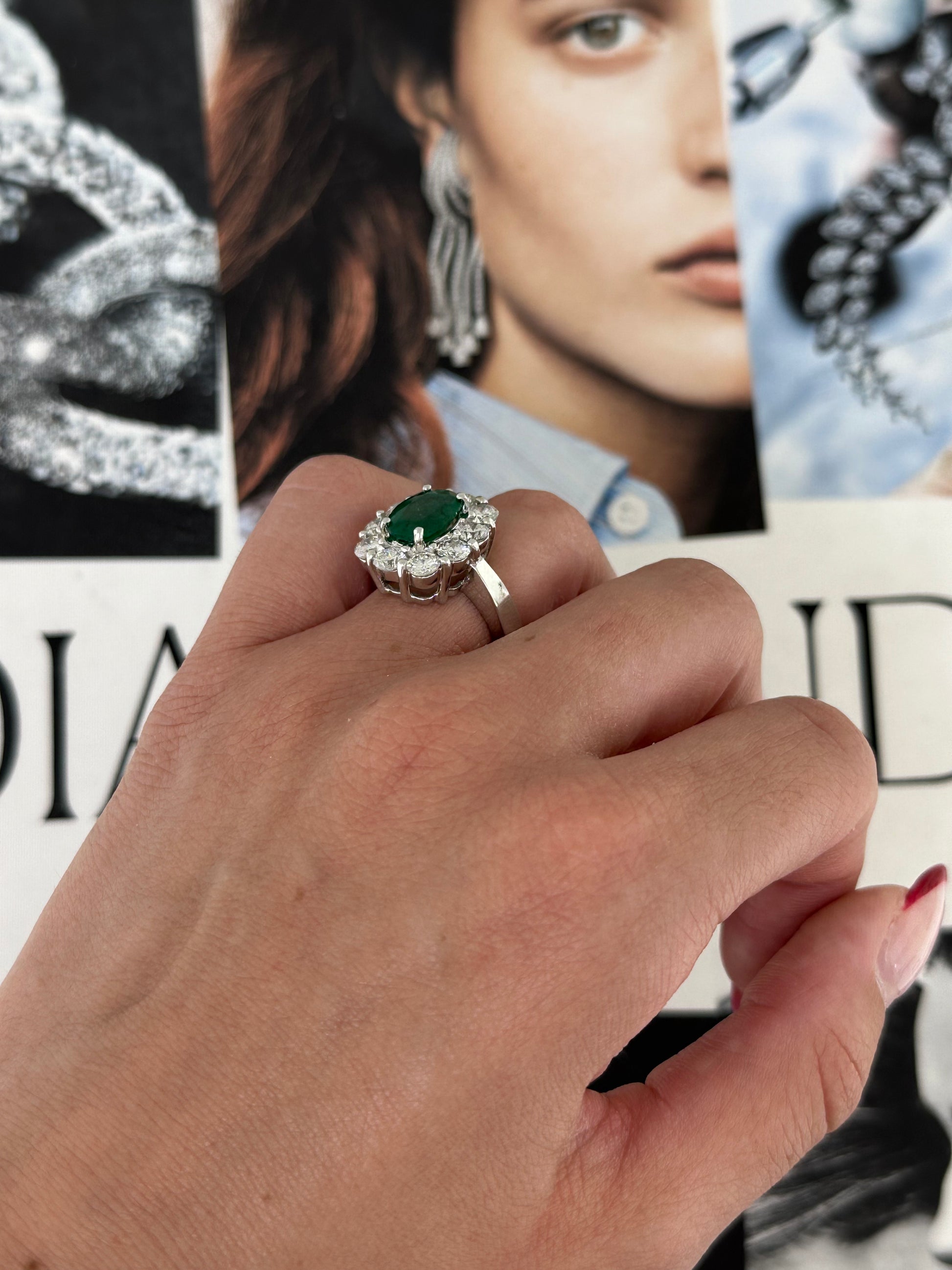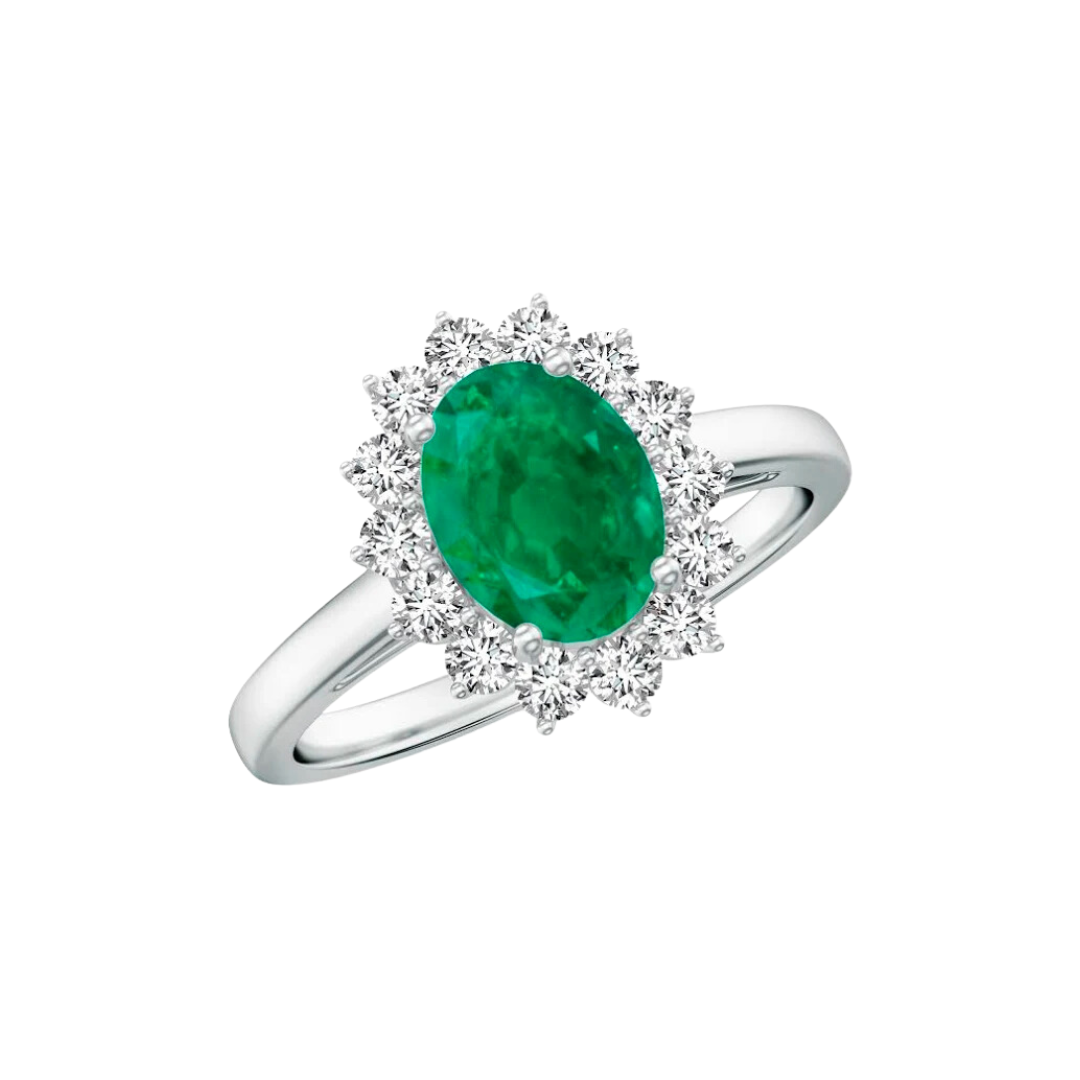 Presenting our oval emerald gemstone, embellished with a timeless diamond halo. This piece, inspired by the classic elegance of Princess Diana, effortlessly merges vintage charm with a modern flair, resulting in an exceptionally classy and sophisticated accessory.