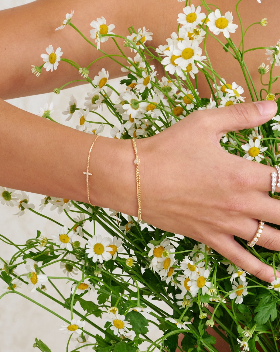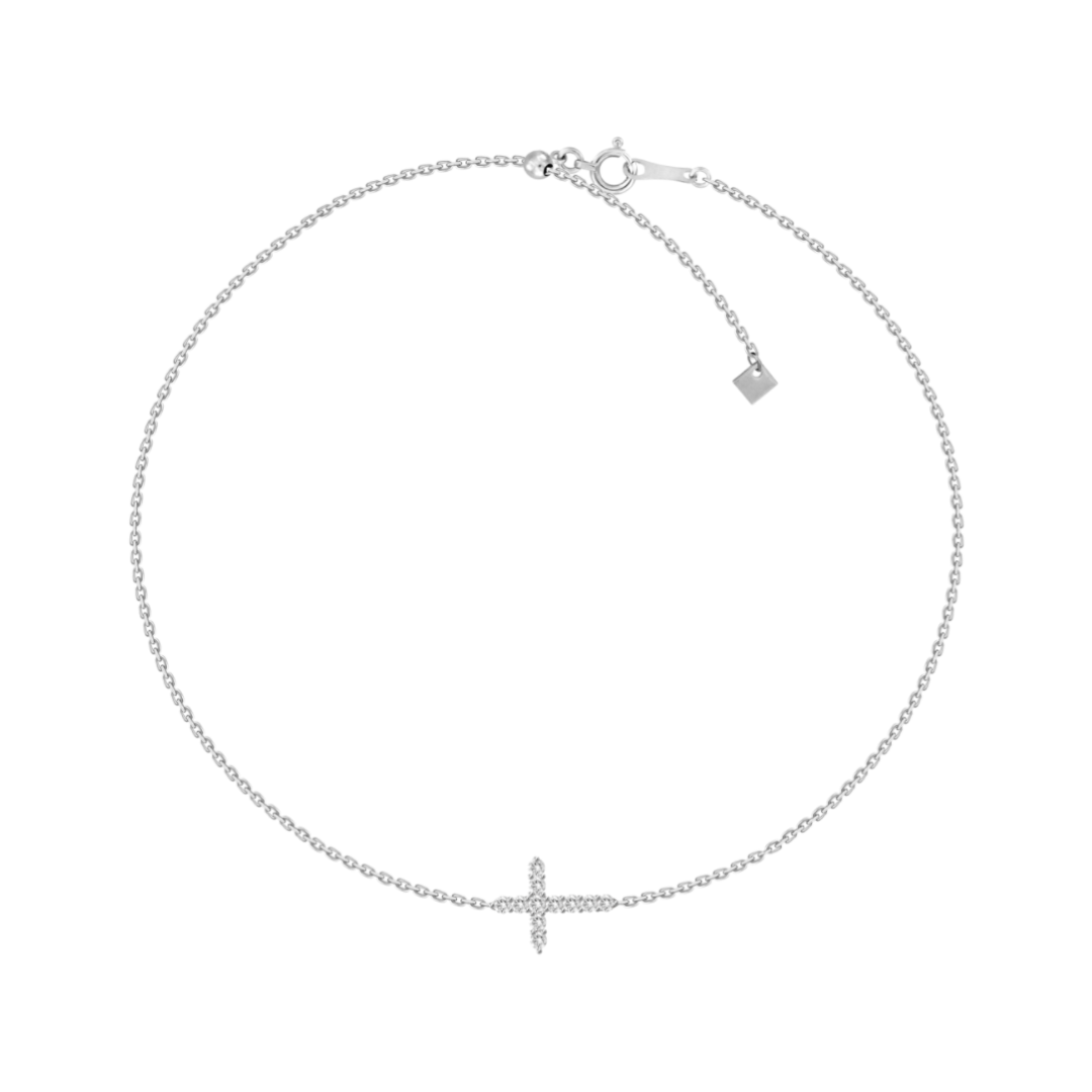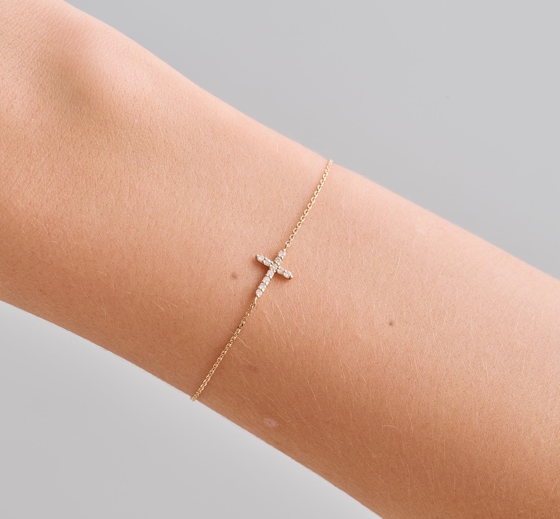 Diamond Cross attached to an 18k adjustable cable link chain. The perfect piece for you to wear yourself or give to that special someone. Delicate Diamond Cross makes a wonderful addition to your wrist stack.