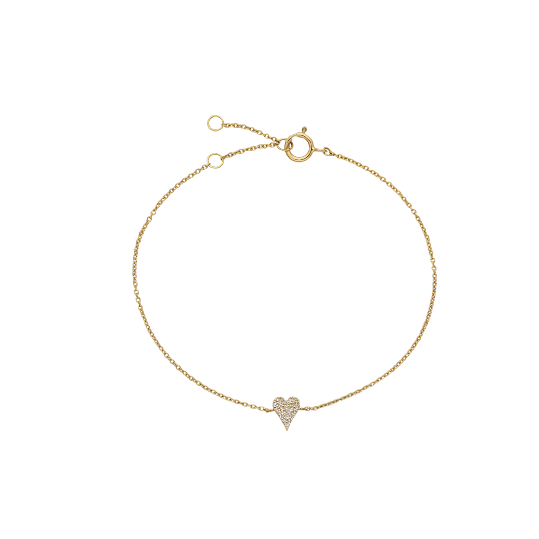 A delicate heart that holds boundless love within! This stunning pave diamond heart bracelet is set in 14k yellow gold, is featured on an adjustable 7-inch chain.