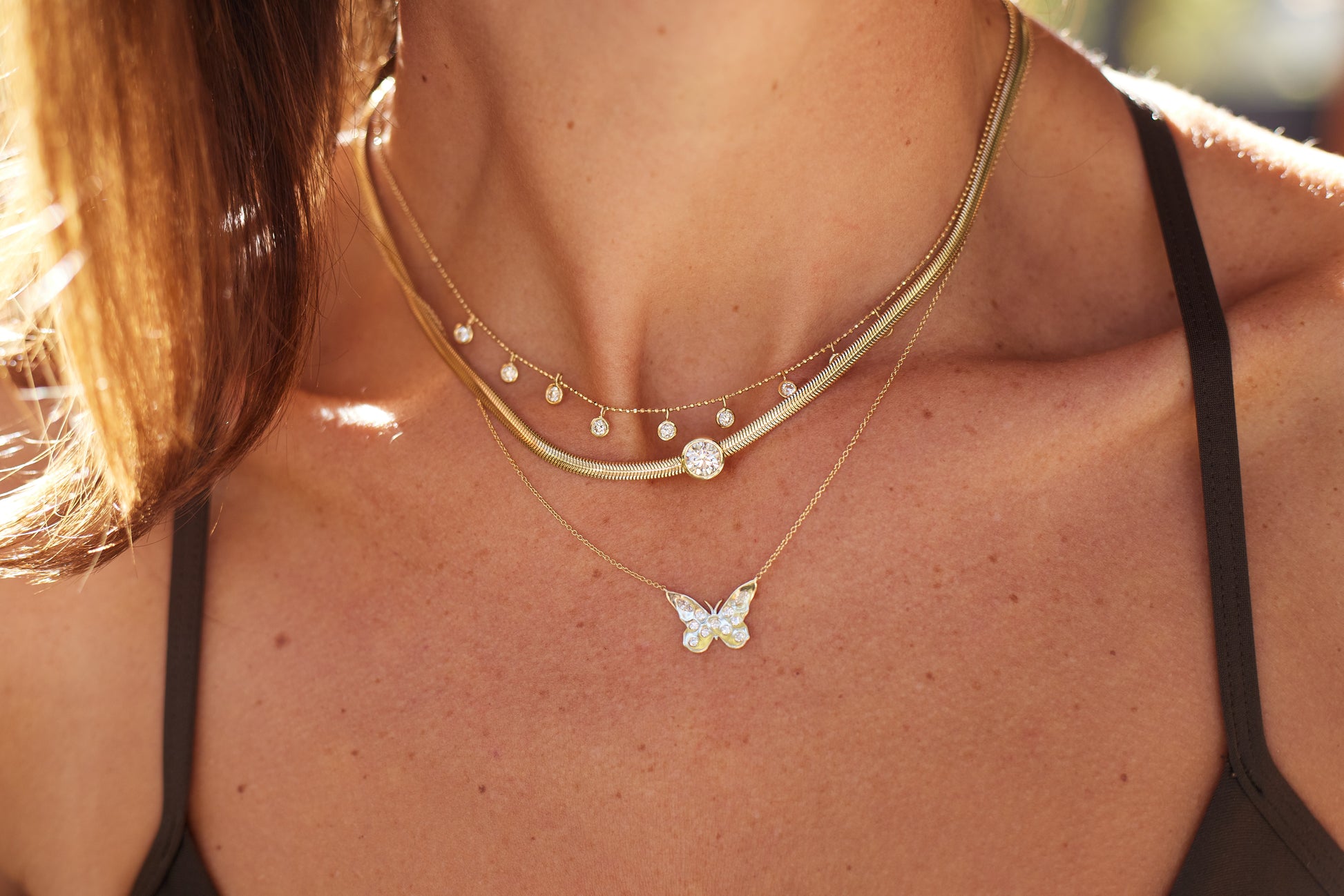 This Gold Herringbone Necklace features a bezel-set round diamond that lays directly in the middle of the necklace. A statement piece like no other!