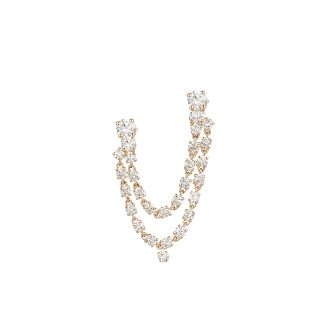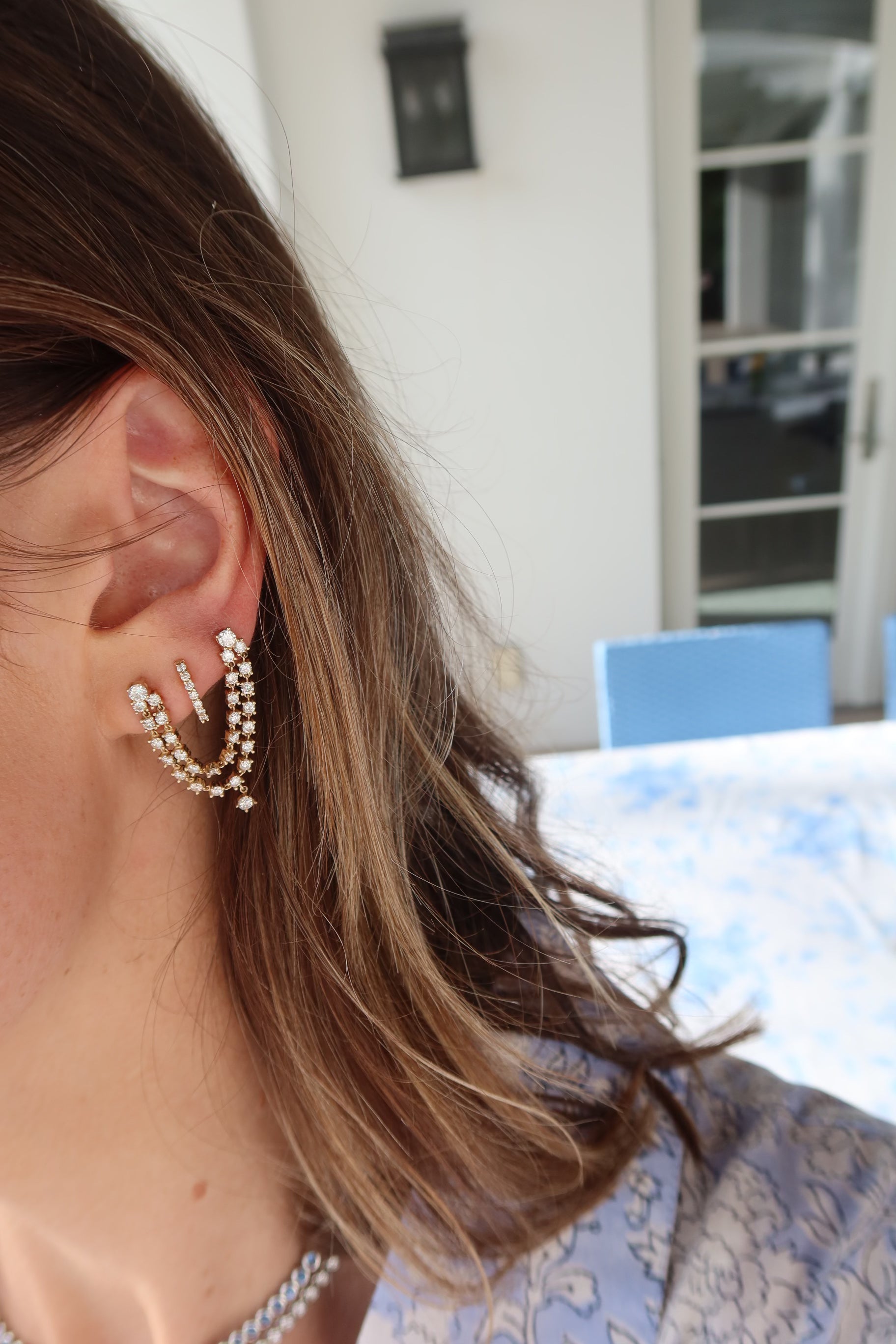 Join the trend of earring stacking with our eye-catching jump rope earring. Featuring two rows of mesmerizing diamonds cascading below the lobe, this earring redefines elegance. Its versatility allows for endless styling possibilities; wear it alone on one ear for a bold statement, or pair it with an assortment of mini studs on the other ear for a chic and dynamic look!