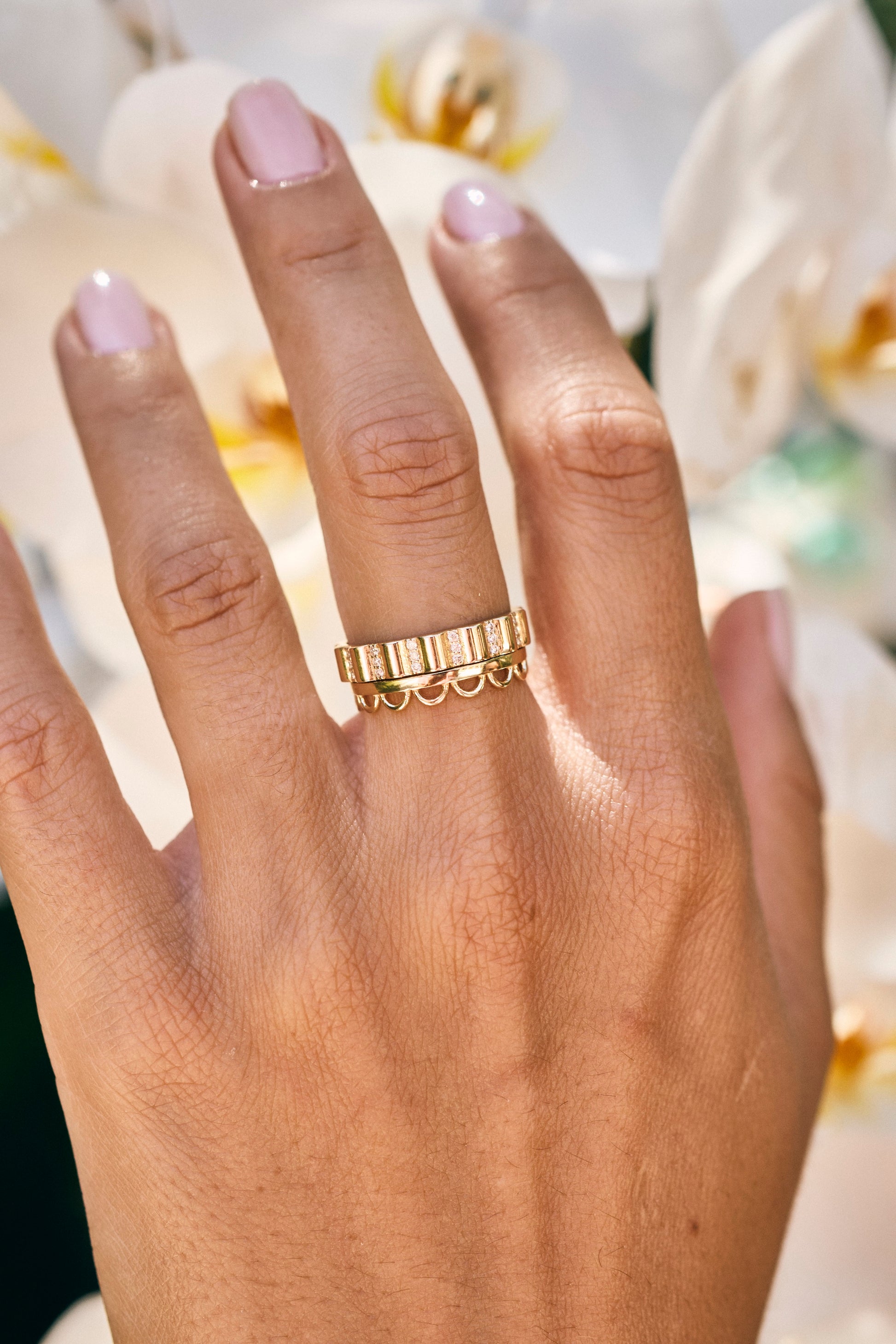 The Diamond Scallop Stacking Band features a delicate row of shimmering diamonds set in an elegant scalloped design, creating a timeless and feminine look. Perfect for stacking or wearing alone, this band adds a touch of sparkle and sophistication to any jewelry collection.