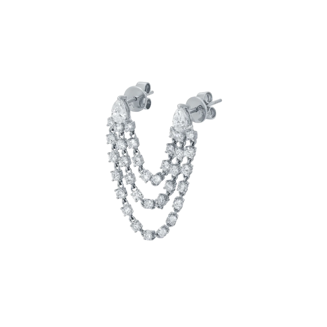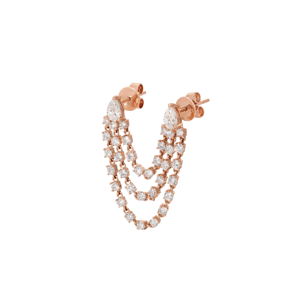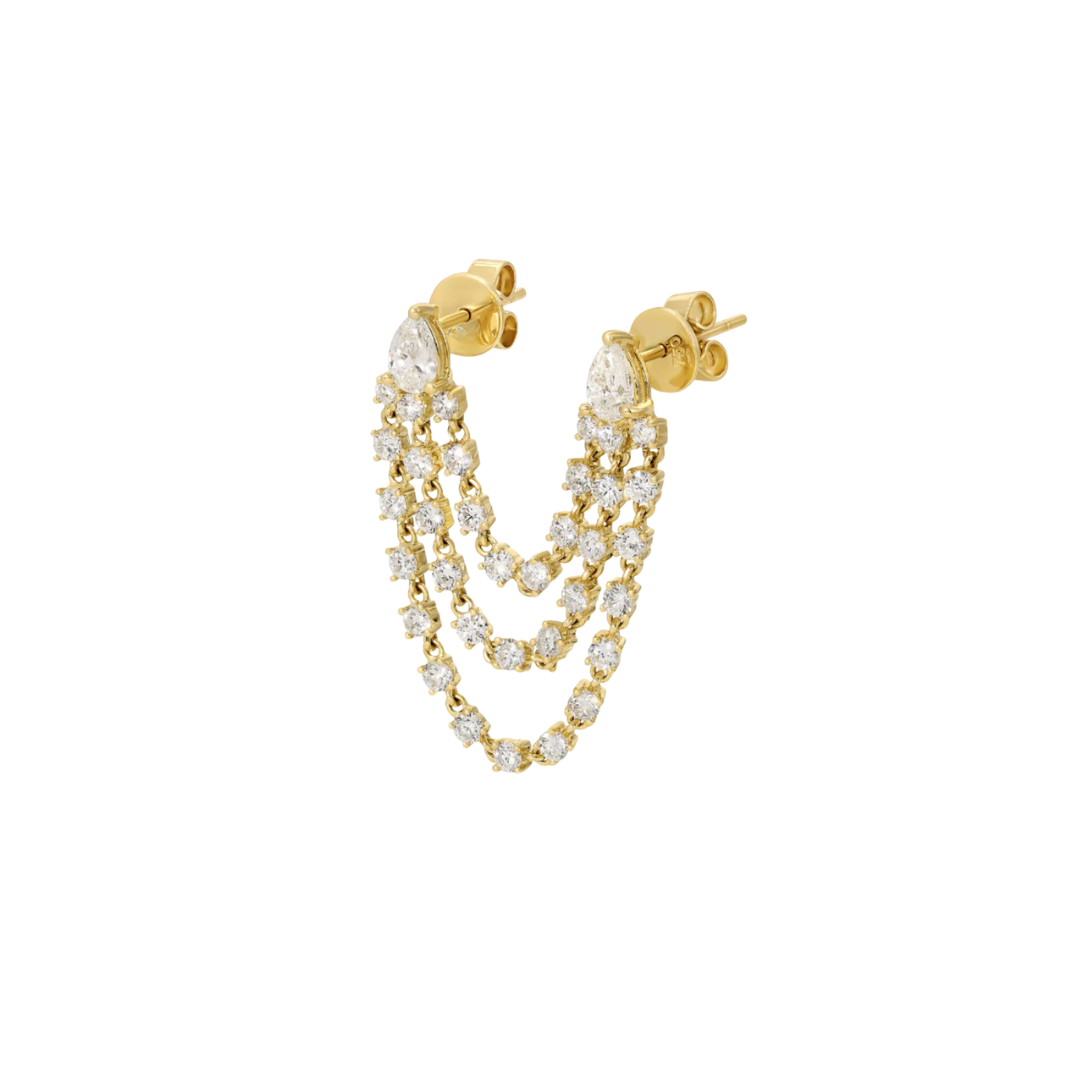 Take the earring stacking trend by storm with the ultimate jump rope earring. Featuring two pear shaped diamonds anchoring the earring and 3 rows of diamonds draping below the lobe. There are endless ways to style this single earring; we love it solo on one ear with a mixture of mini studs on the other!