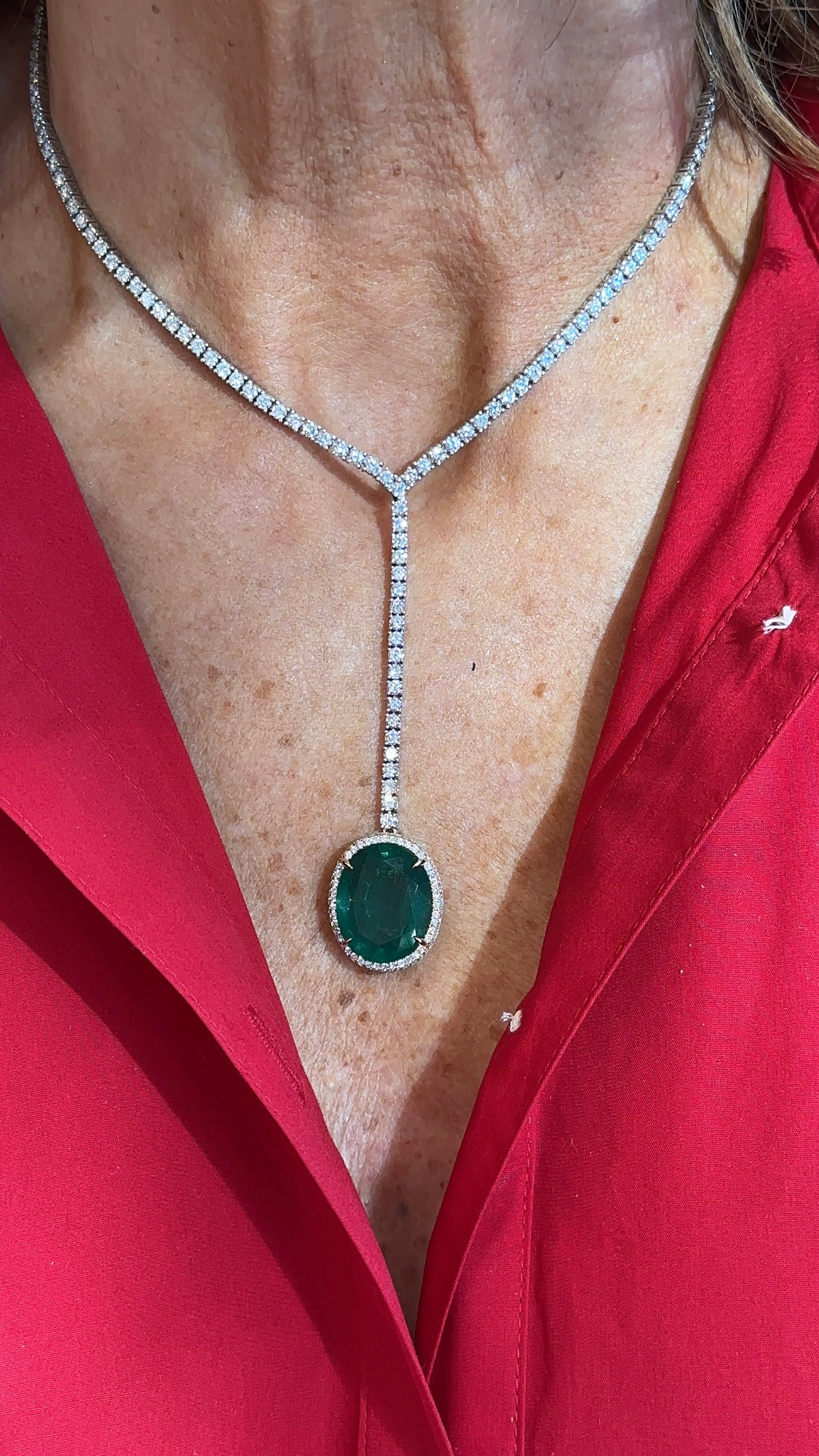 Elegant and captivating, this Emerald and Diamond Necklace features a sleek diamond tennis chain that gracefully descends into a Y-shaped drop, showcasing a stunning oval emerald framed in a halo of brilliant diamonds. The vibrant green center stone creates a striking contrast against the shimmering diamond line, offering refined sophistication and dramatic elegance.