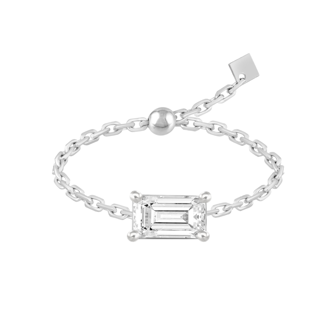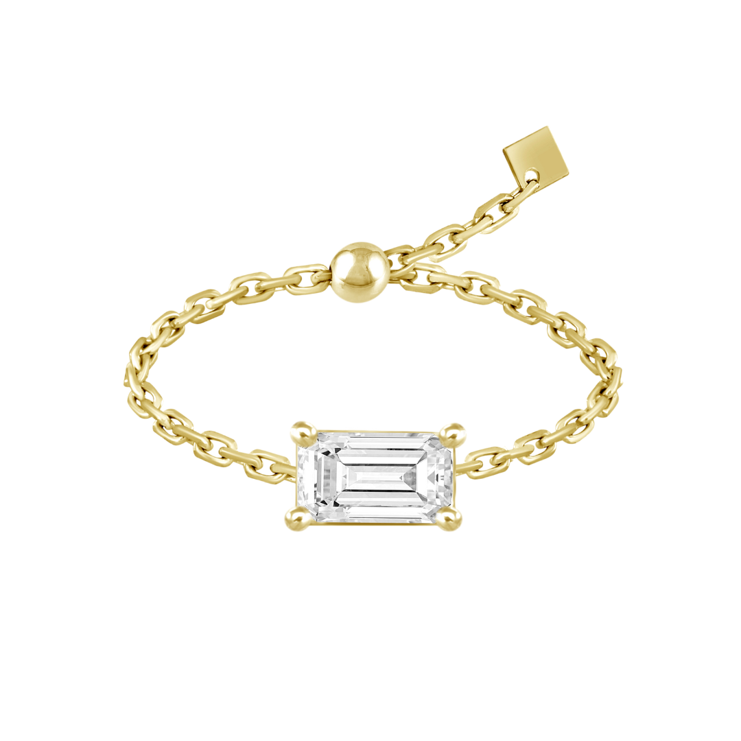 An Emerald Chain Ring with an adjustable clasp that allows you to wear on any finger - pinkie, middle, ring, index, thumb. We are using a 0.30ct Emerald brilliant Diamond. This ring is the finishing touch to your stacking collection and a piece you won't ever want to take off.