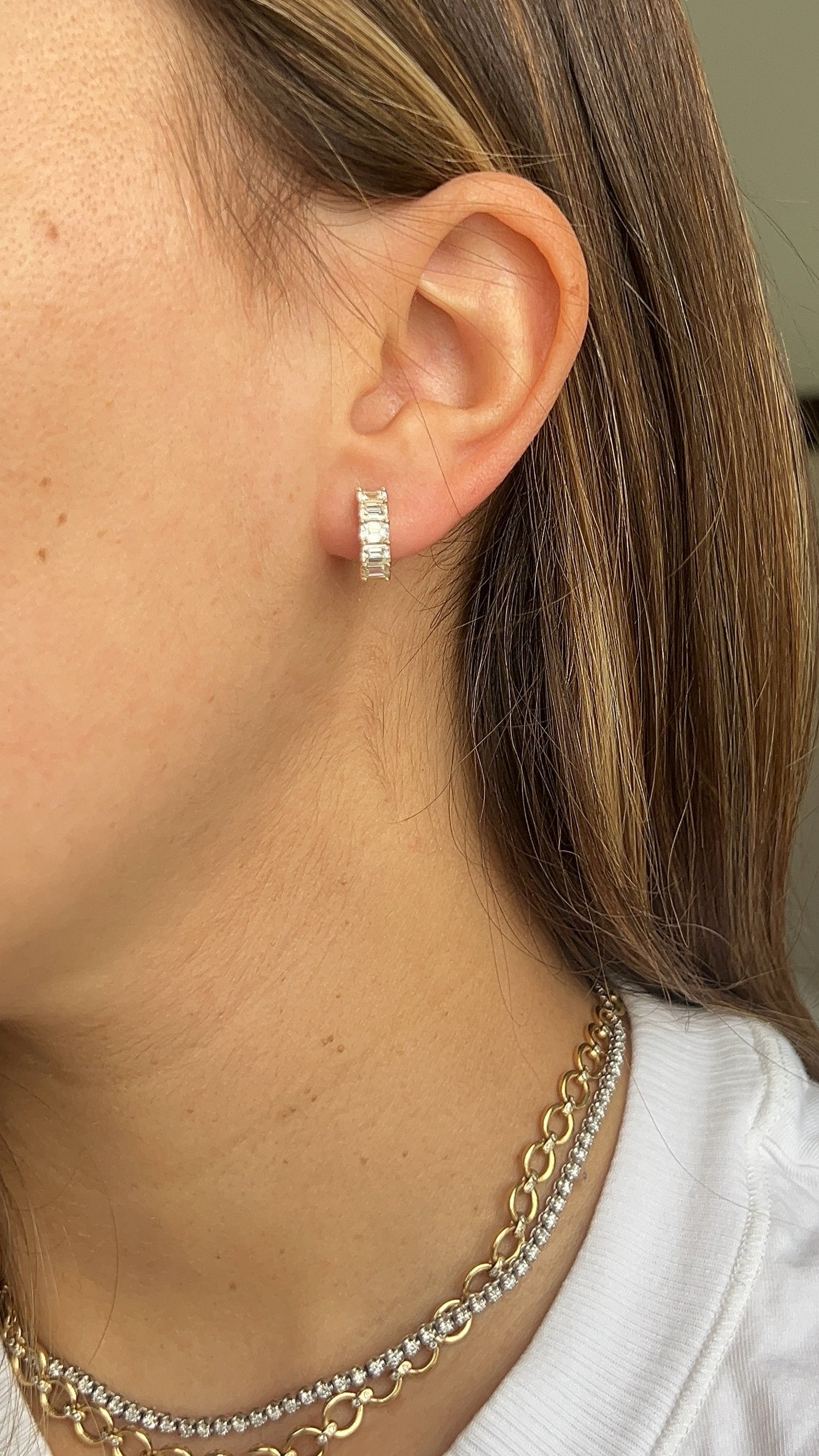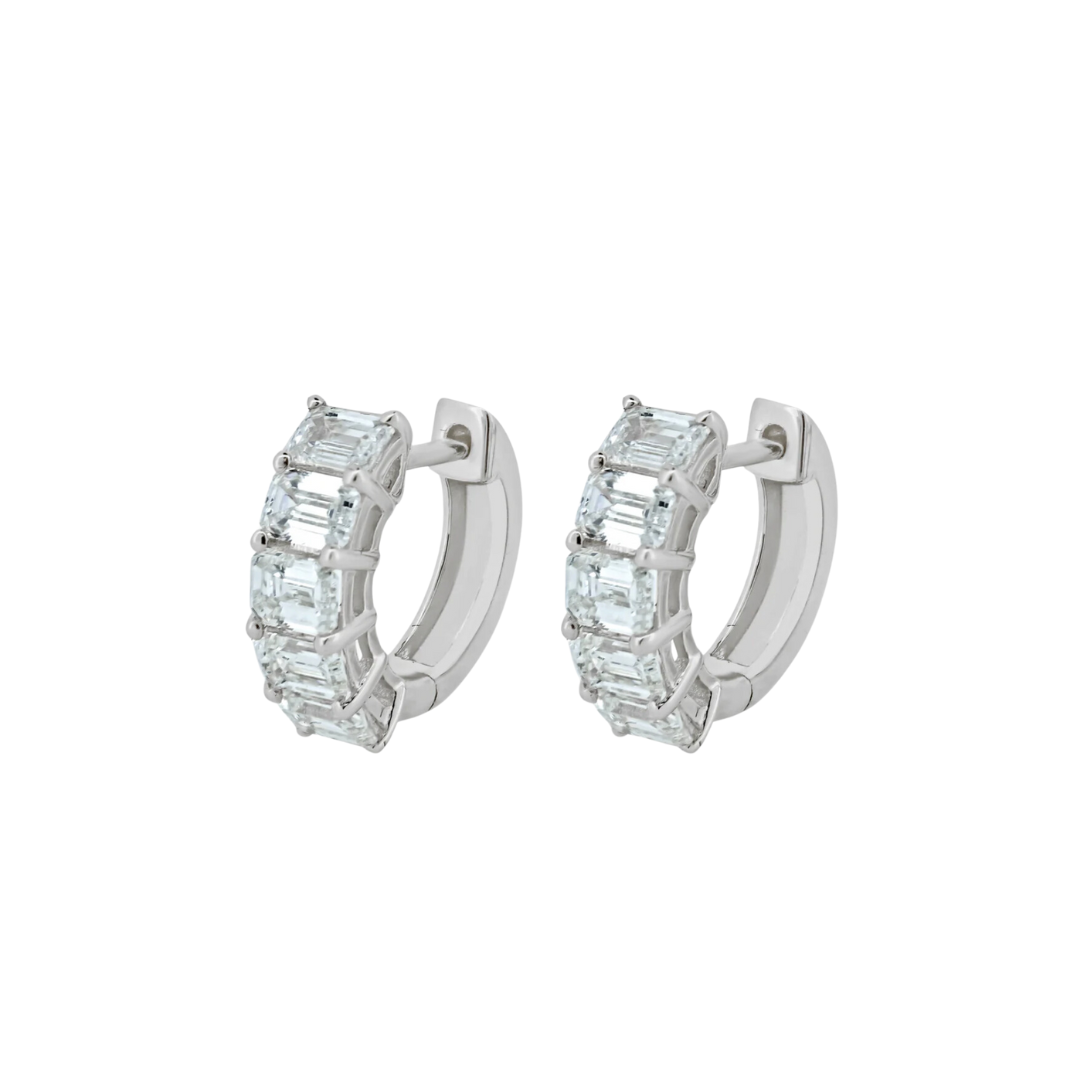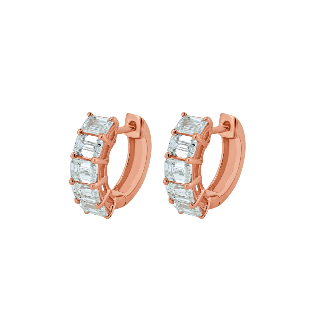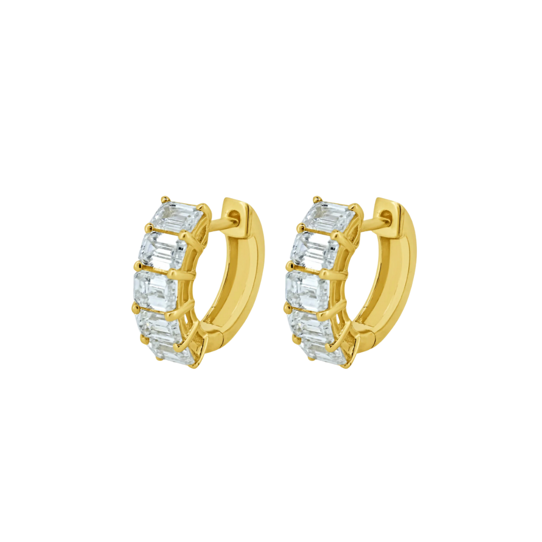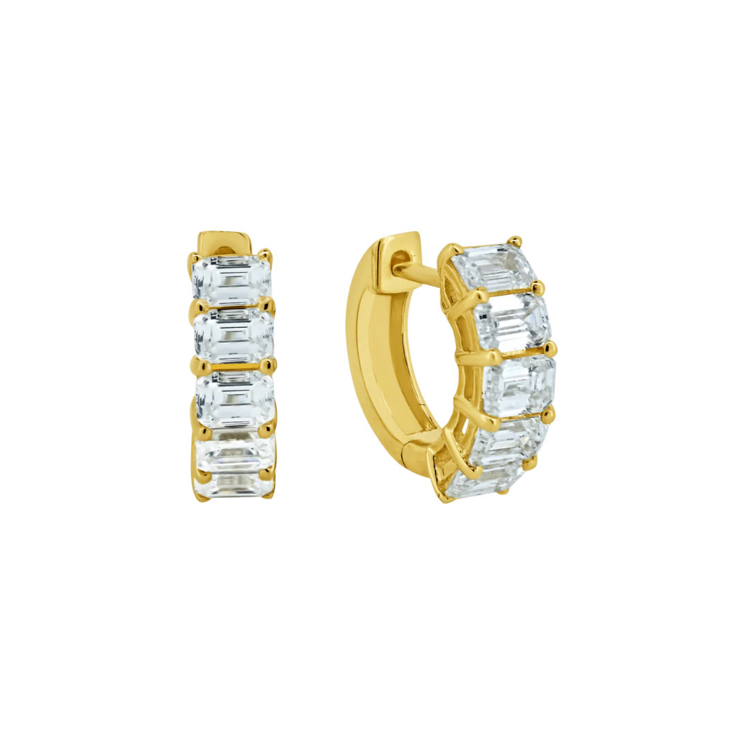 The Emerald Cut Diamond Huggies are a sophisticated take on classic hoop earrings, featuring five stunning emerald-cut diamonds that offer a refined sparkle. Each diamond is encased in a sleek prong setting, showcasing their elegant, elongated shape for extra sparkle.