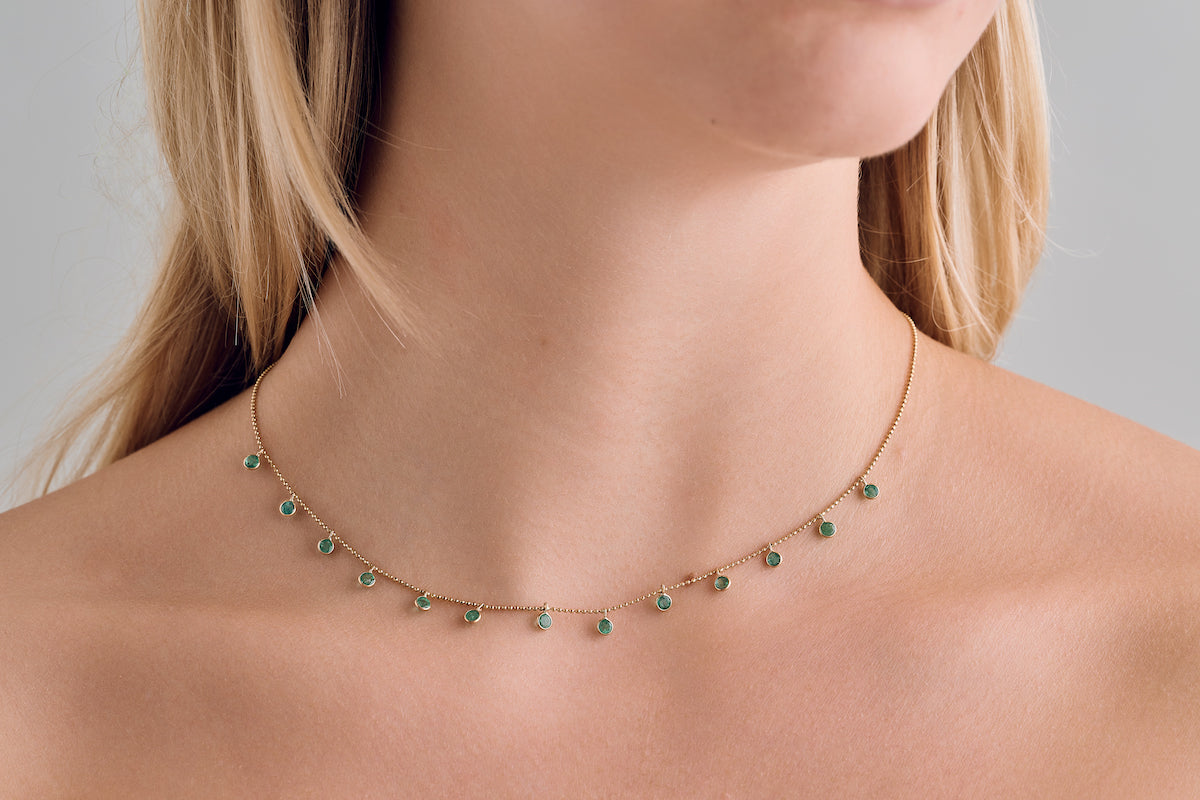 A new twist to our core Drop Station Necklace, the Green Emerald Drop Stations necklace is 14-karat gold fixed to an 18-inch delicate chain accompanied by 13 clear full emeralds. Each necklace is complimented with a diamond bezel crown pendant. A layering piece to leave on no matter the occasion.