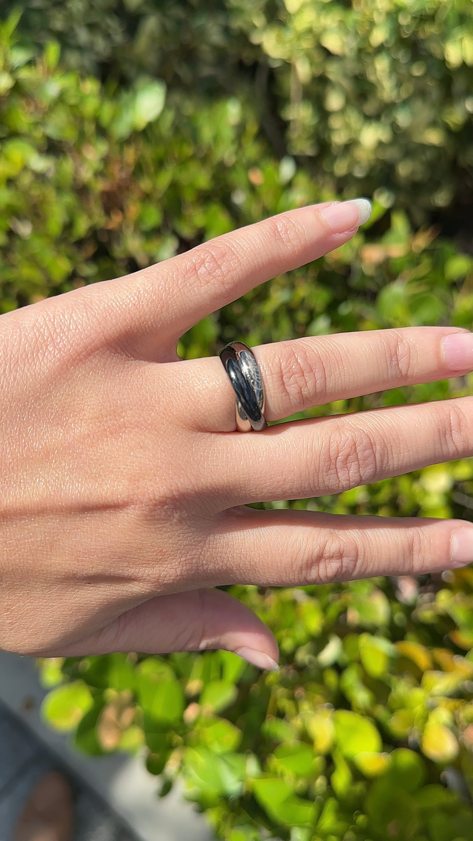 A striking estate Cartier Trinity ring featuring two polished white gold bands intertwined with a sleek black band. A modern take on the house’s iconic design.