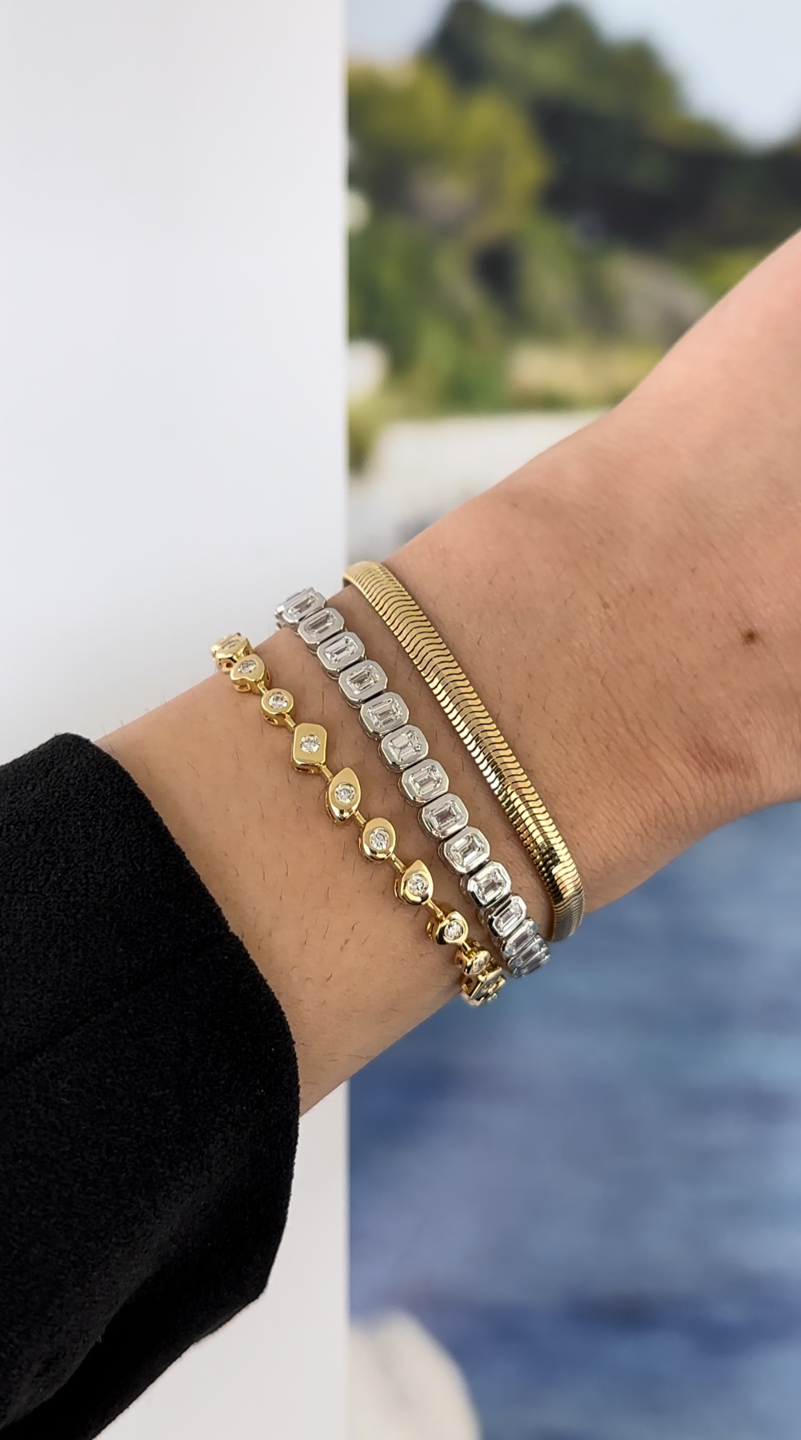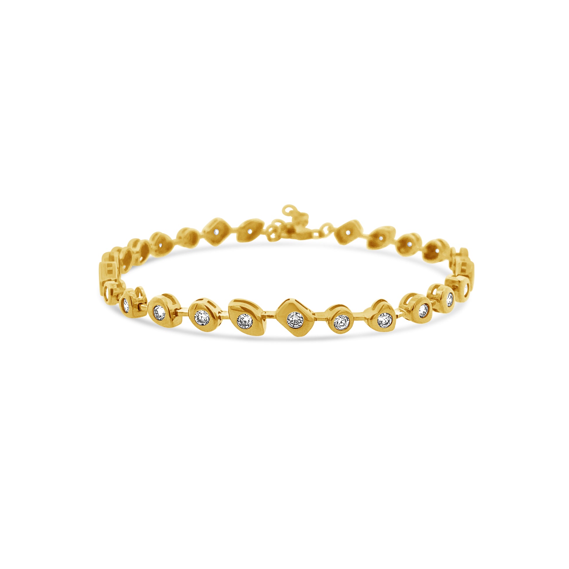 Not your average tennis bracelet. 14K gold is crafted into different shapes that hold round cut diamonds in this unique tennis bracelet.