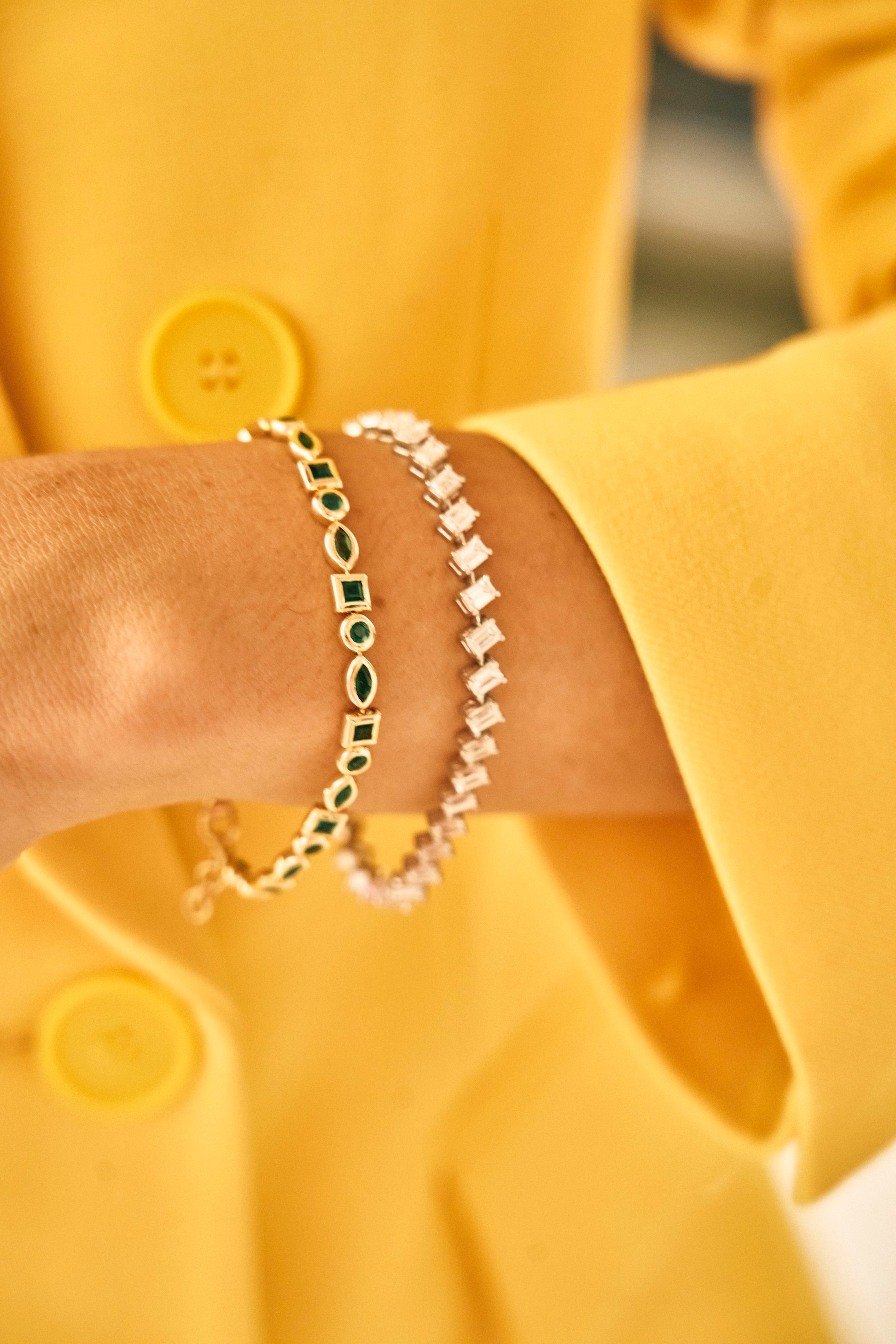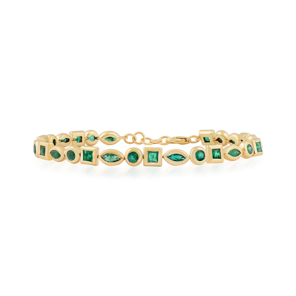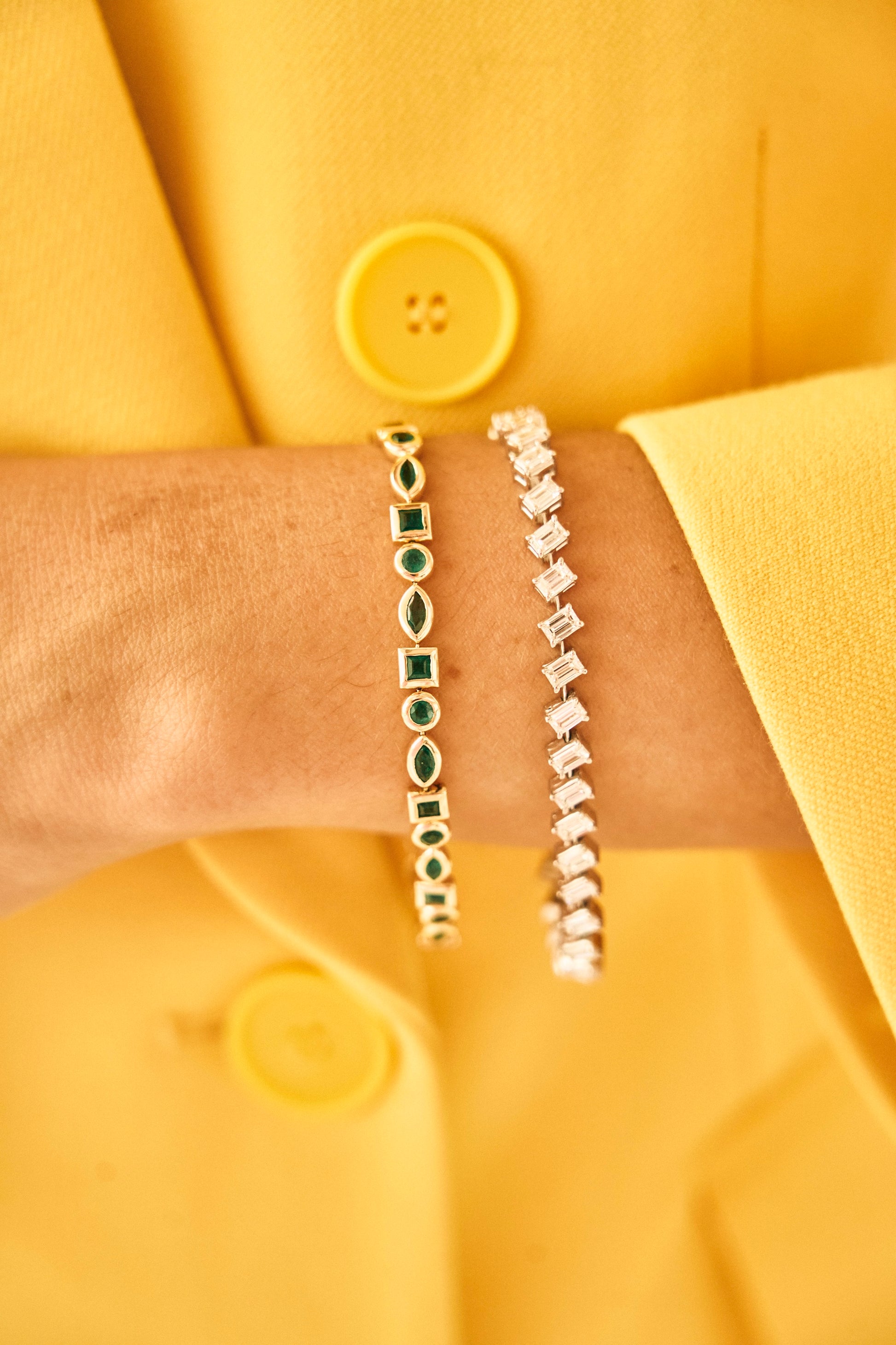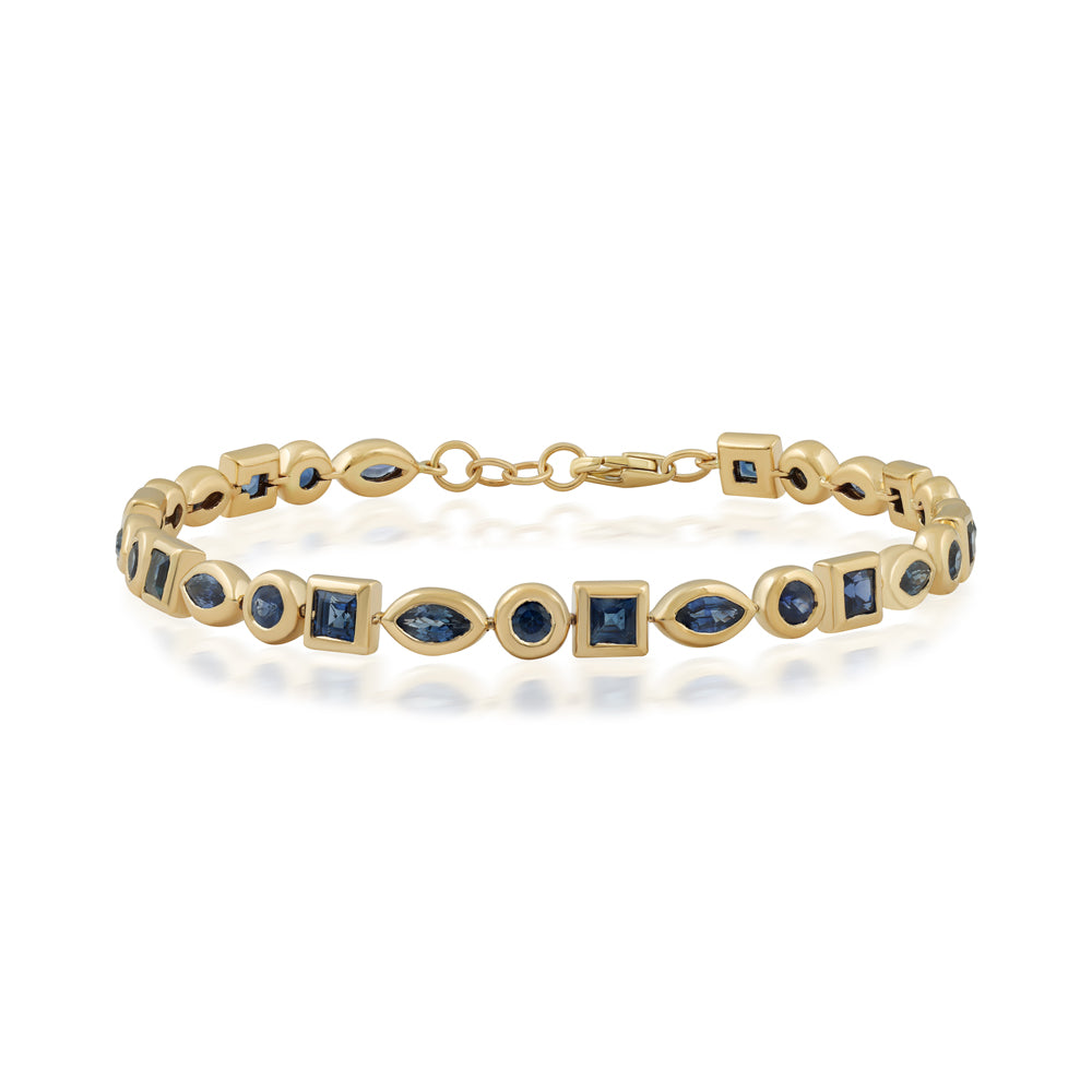 Not your average tennis bracelet- 14K gold is crafted into different shapes that hold fancy shape gemstones sin this unique tennis bracelet.