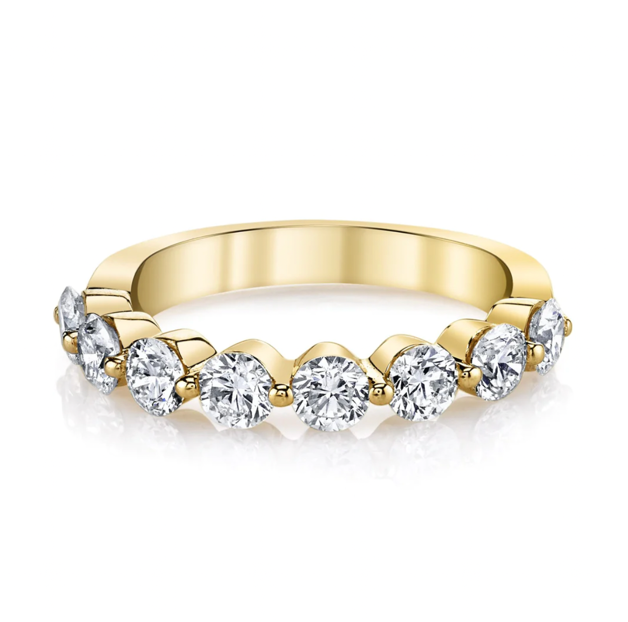 This classic and timeless band features round diamonds in a floating shared prong set band! With an invisible setting like this it makes it very appropriate for everyday wear especially if you're looking for an impact with the comfort factor.