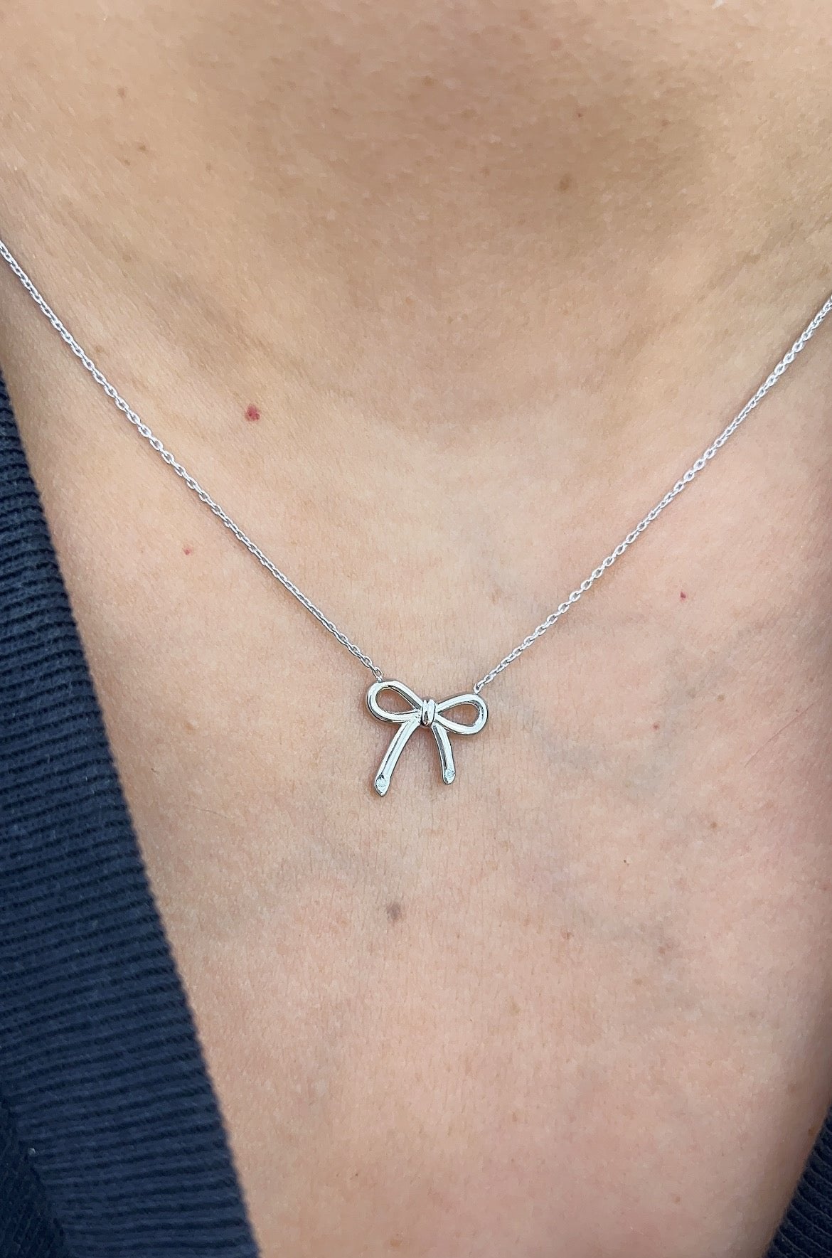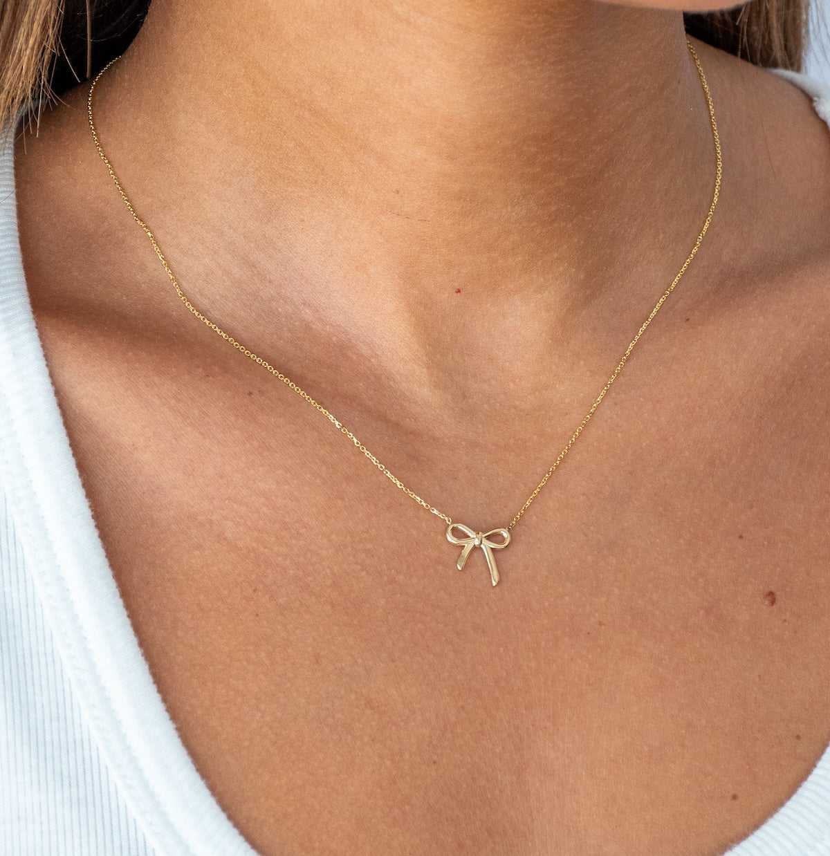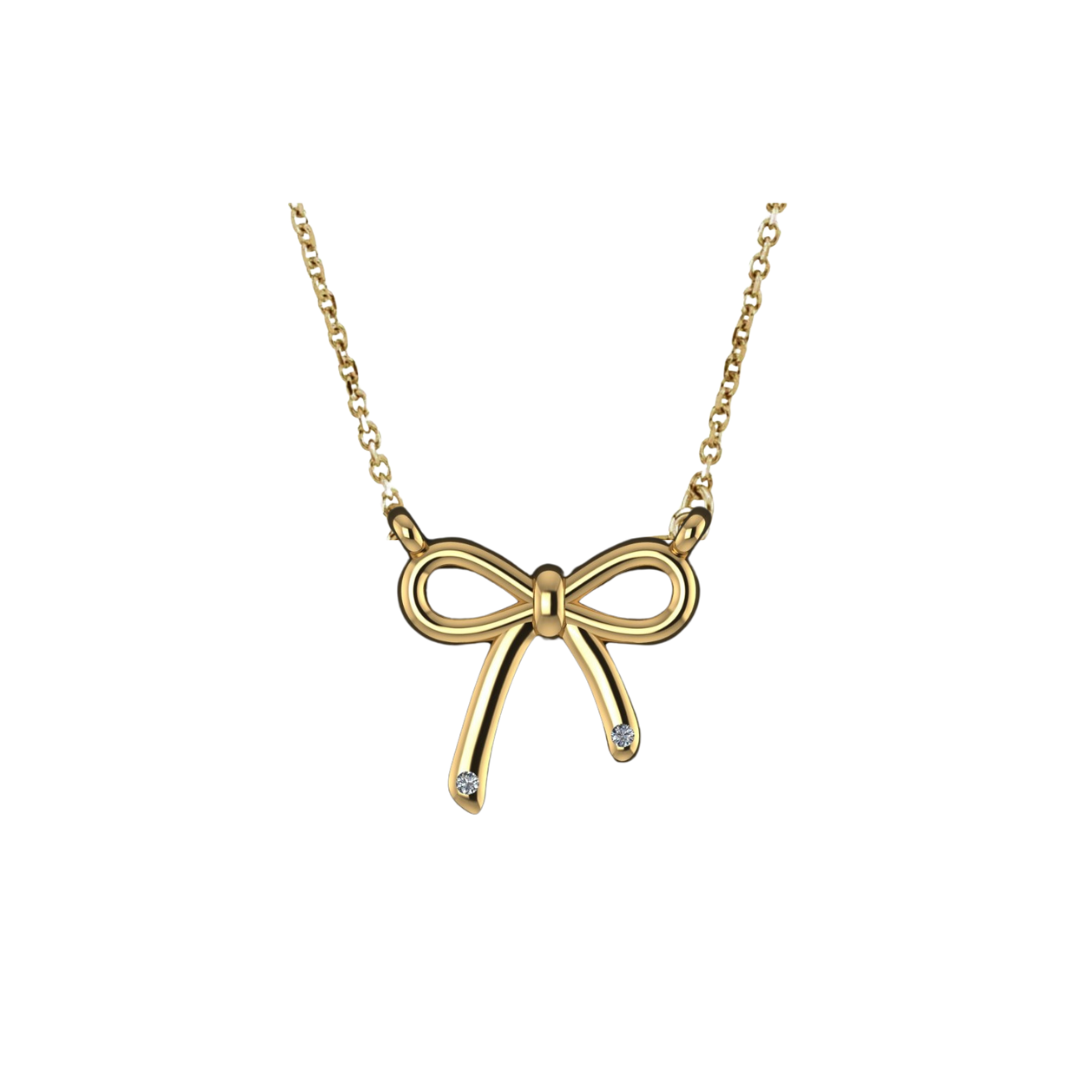 Designed in collaboration with Emily Hertz of Born on Fifth, the Gold and Diamond Bow Necklace has 2 round cut diamonds adorned at the tails of a 14K solid gold bow. It is the sweetest addition to your stack.