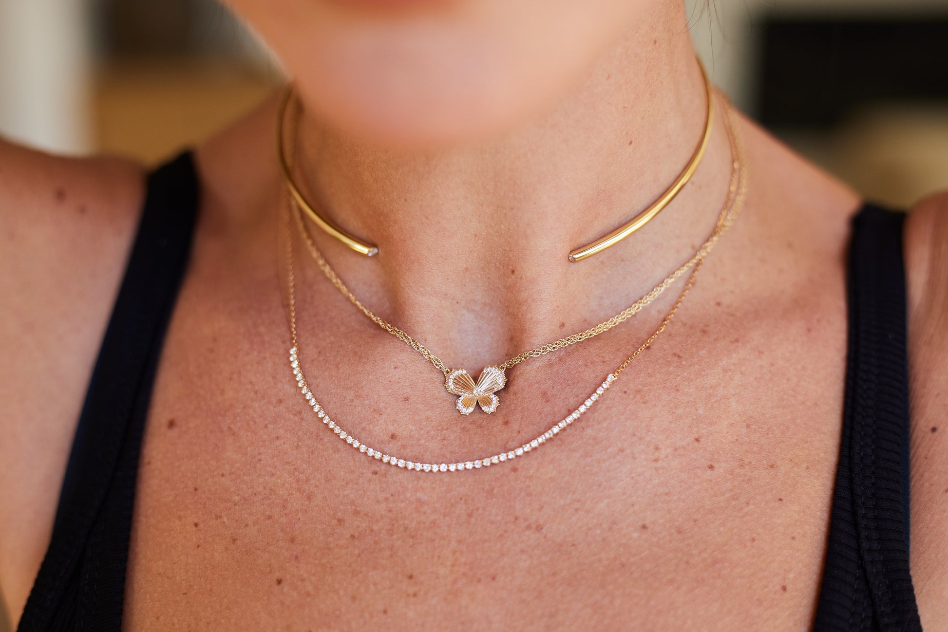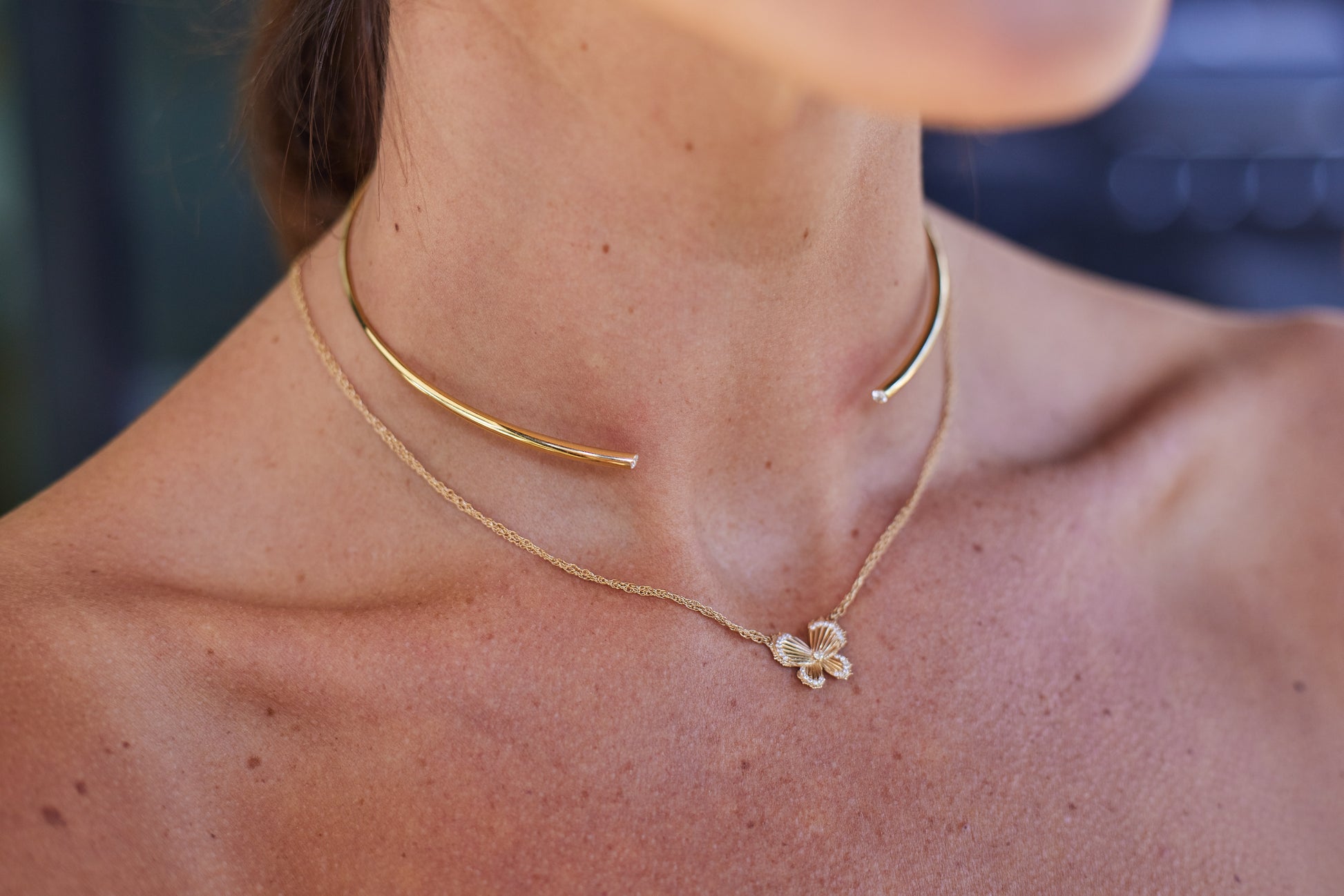 This 18k yellow gold collar necklace features two round diamonds, emitting a chic style that captures attention effortlessly. The ultimate layering necklace.
