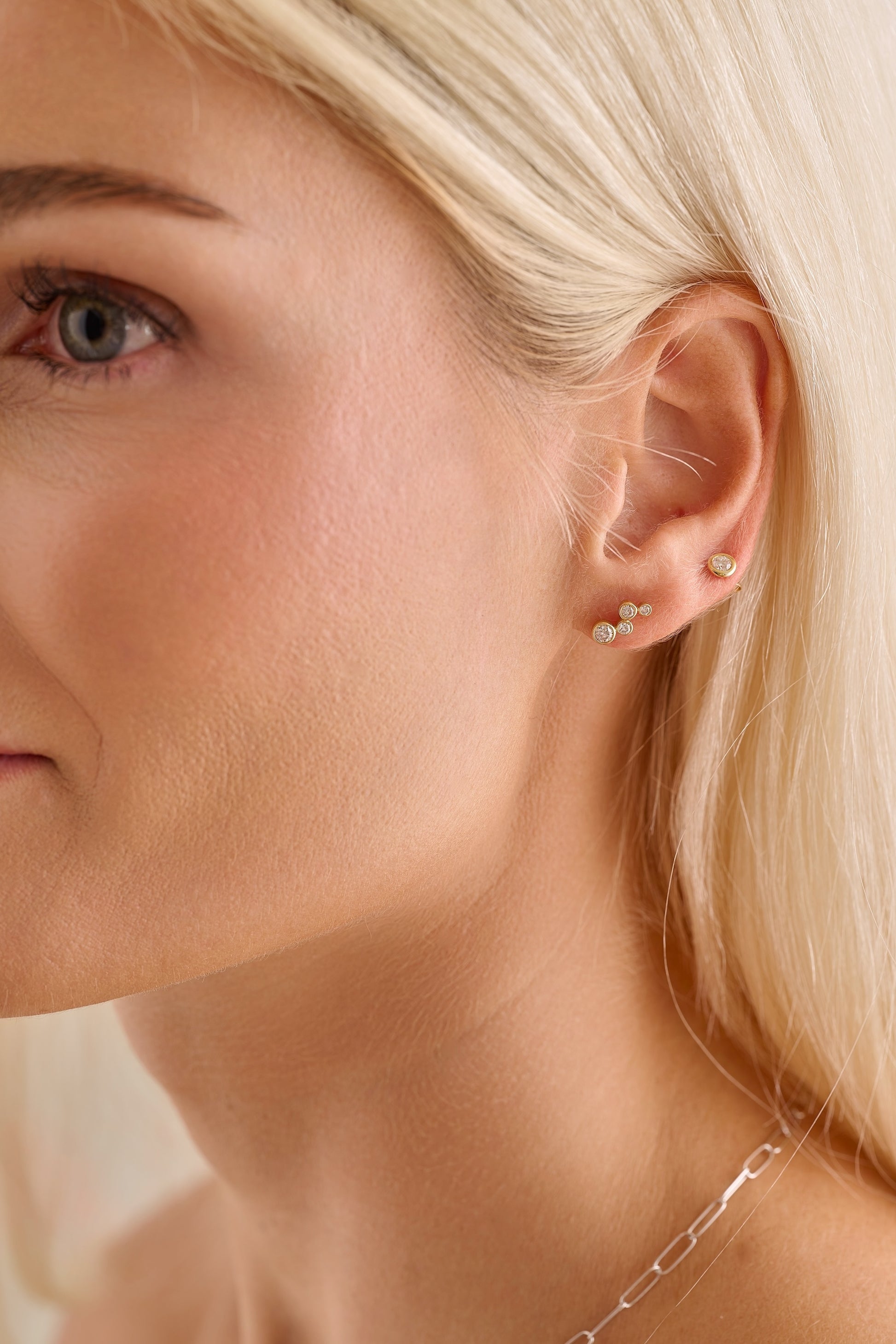 Meet the Diamond Bezel Climbers. Four round cut diamonds are set in a gold bezel cluster to form the perfect stud for your earstack or styling alone.