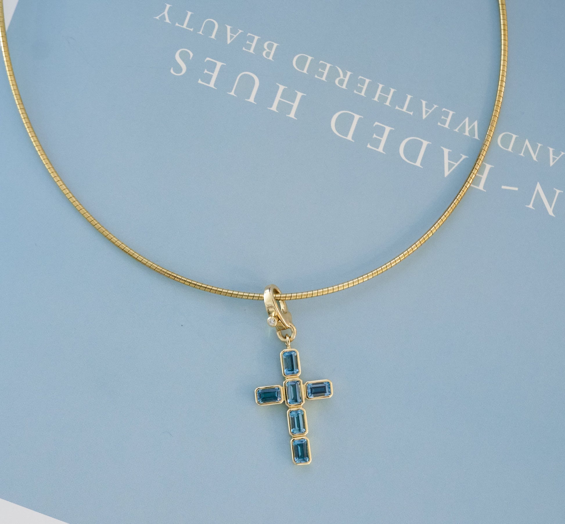 In collaboration with Becca & Ali Sisto, the London Blue Topaz Cross Pendant balances bold color with refined craftsmanship. A vivid London blue topaz is bezel-set in a clean, sculptural cross silhouette, finished with a single diamond accent at the bail for just a hint of brilliance. Layer it with other charms on the Silk Color Cord or 14K Gold Wire Necklace—or let it shine on its own as a quietly powerful statement.