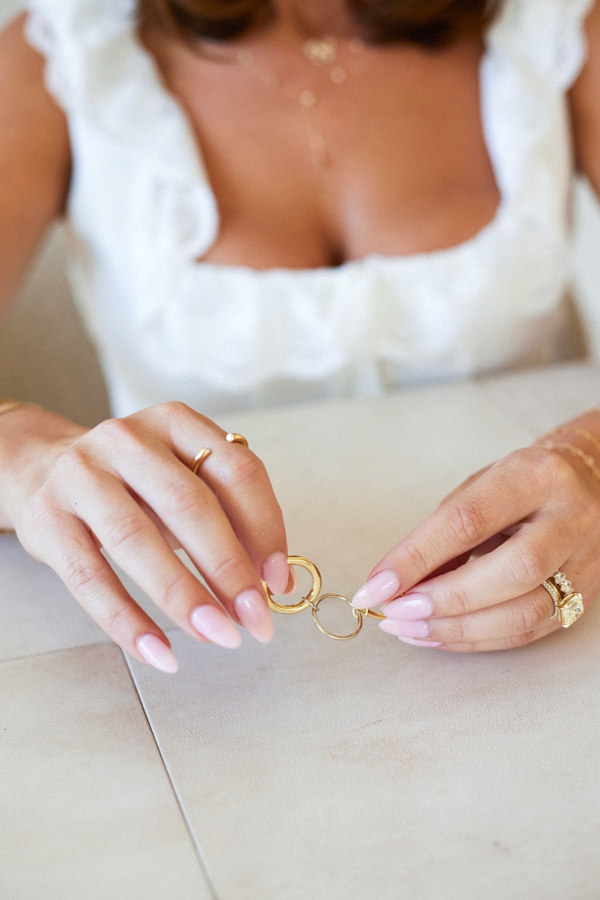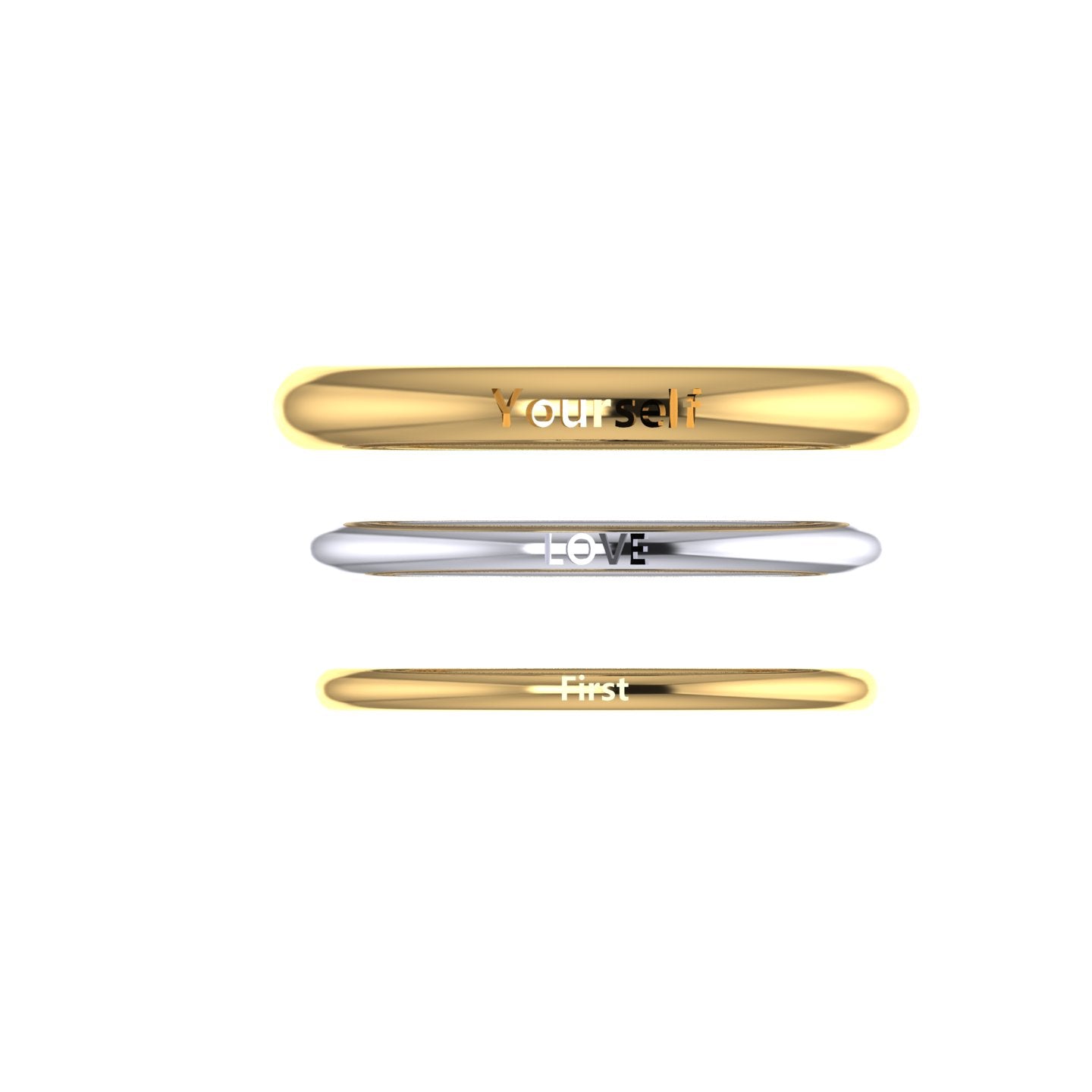 The 14K Love Yourself Trinity Ring is three gold bands connected by two 14K jump rings. Inscribed in each band is the message "Love Yourself First" as a reminder as a reminder of your personal growth transforming into the best version of YOU!