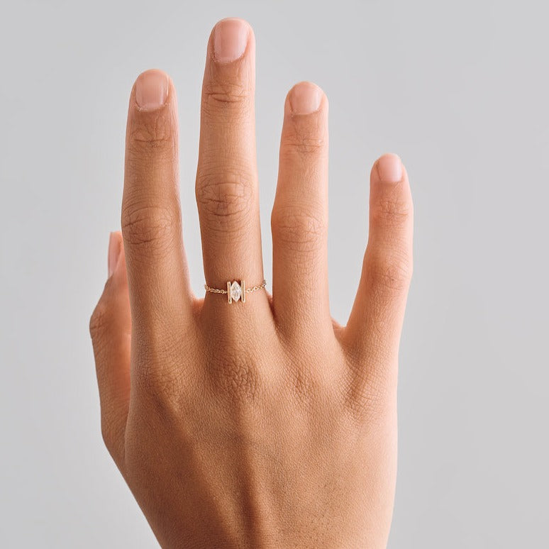 This Marquise Diamond Chain Ring has an adjustable clasp that allows you to wear on any finger - pinkie, middle, ring, index, thumb. This ring is the finishing touch to your stacking collection and a piece you won't ever want to take off.