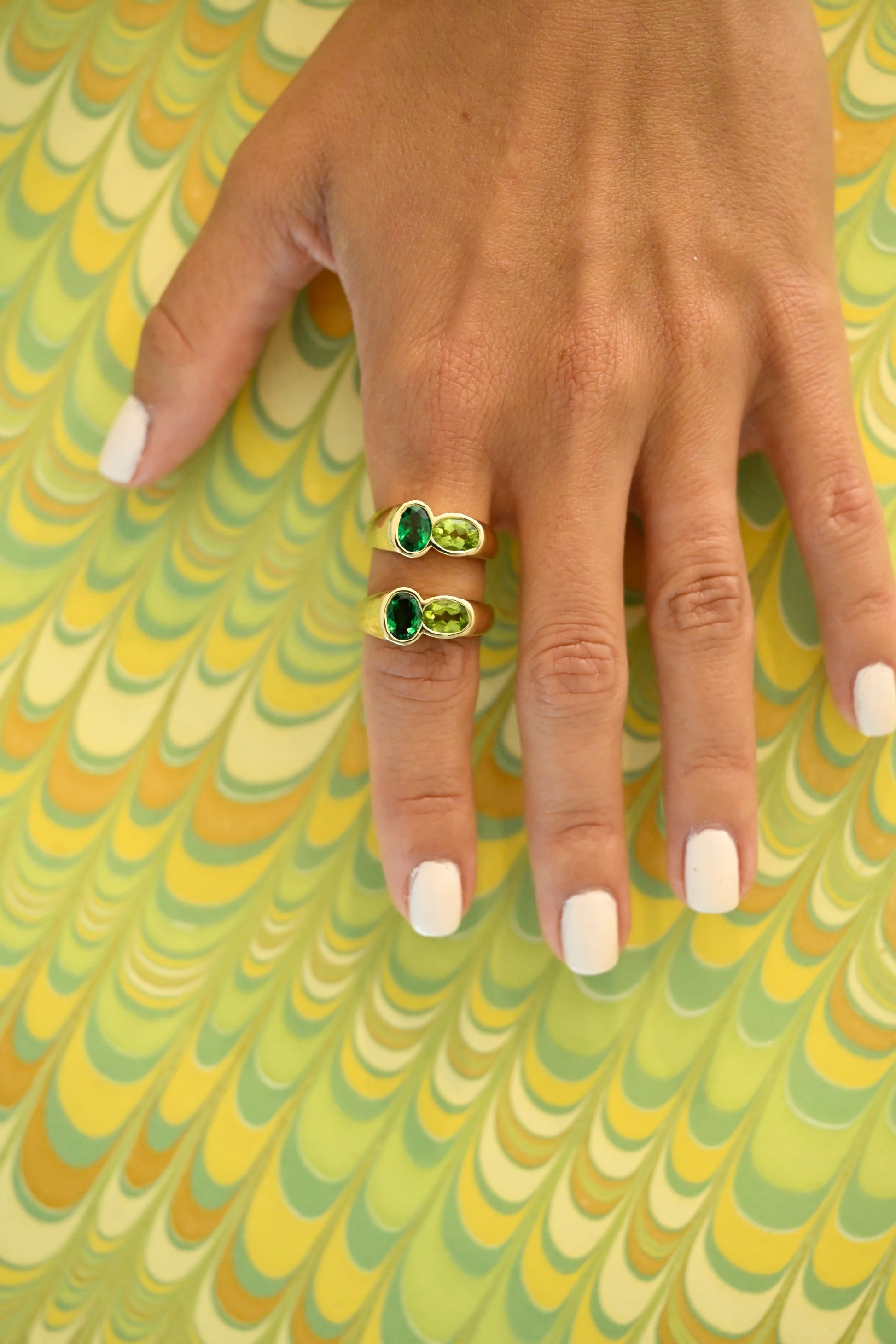 Inspired by Ali’s cult-favorite matcha milkshake, this two-stone toi et moi ring pairs a vivid tsavorite with a juicy peridot—Ali’s birthstone—for a look that’s fresh, fun, and full of meaning. Each oval-cut gem is bezel set in solid 14K gold, designed to move with you and shine all summer long. A playful twist on timeless elegance.