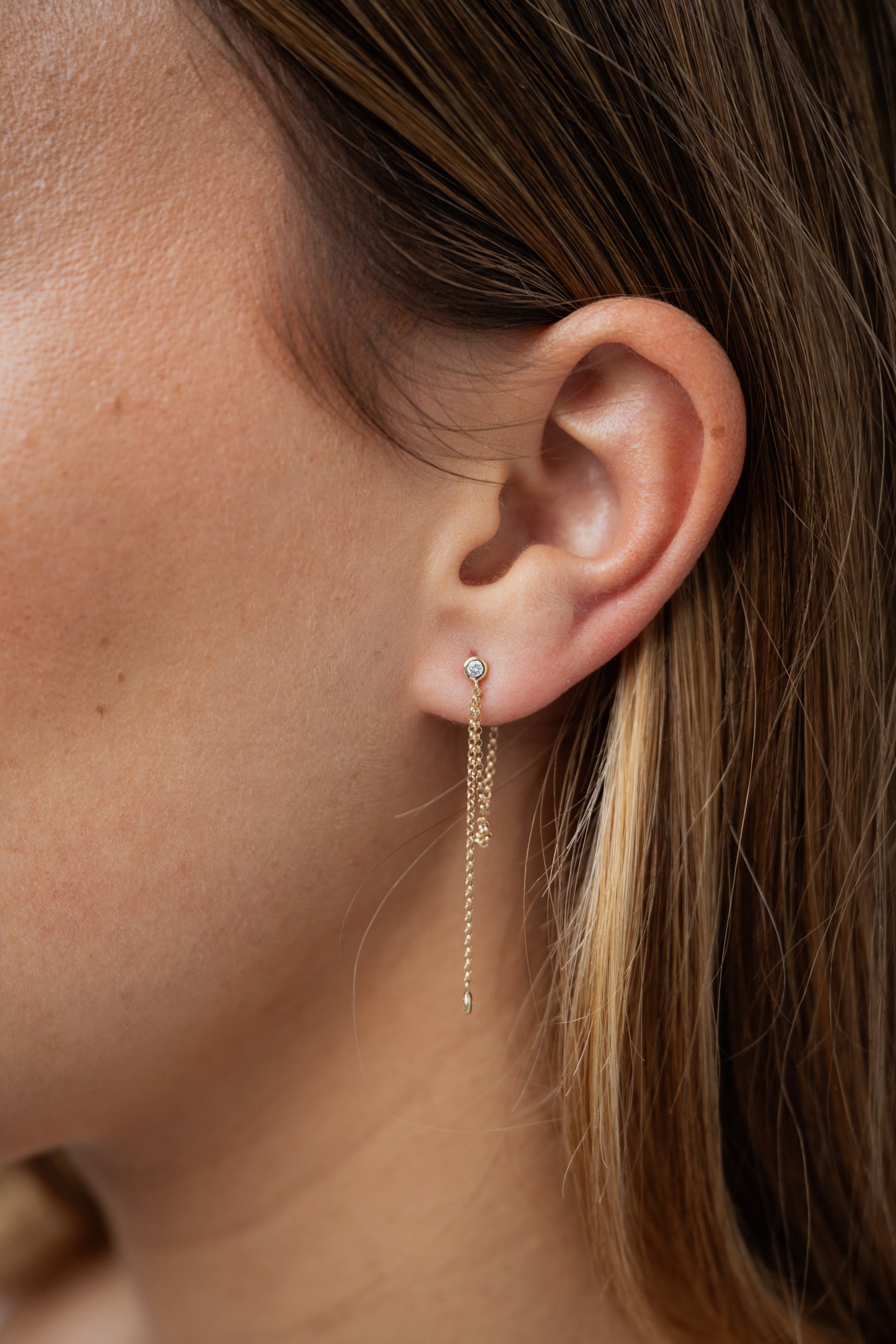 In collaboration with Becca & Ali Sisto, the Diamond Bezel Chain Drop Earrings bring fluid elegance to your summer earscape. A bezel-set diamond anchors each fine gold chain, adding shimmer and length that pairs beautifully with studs, huggies, or other drops from the collection. Wear them to elevate your layers or let them sway solo—either way, they’re made to move with you.