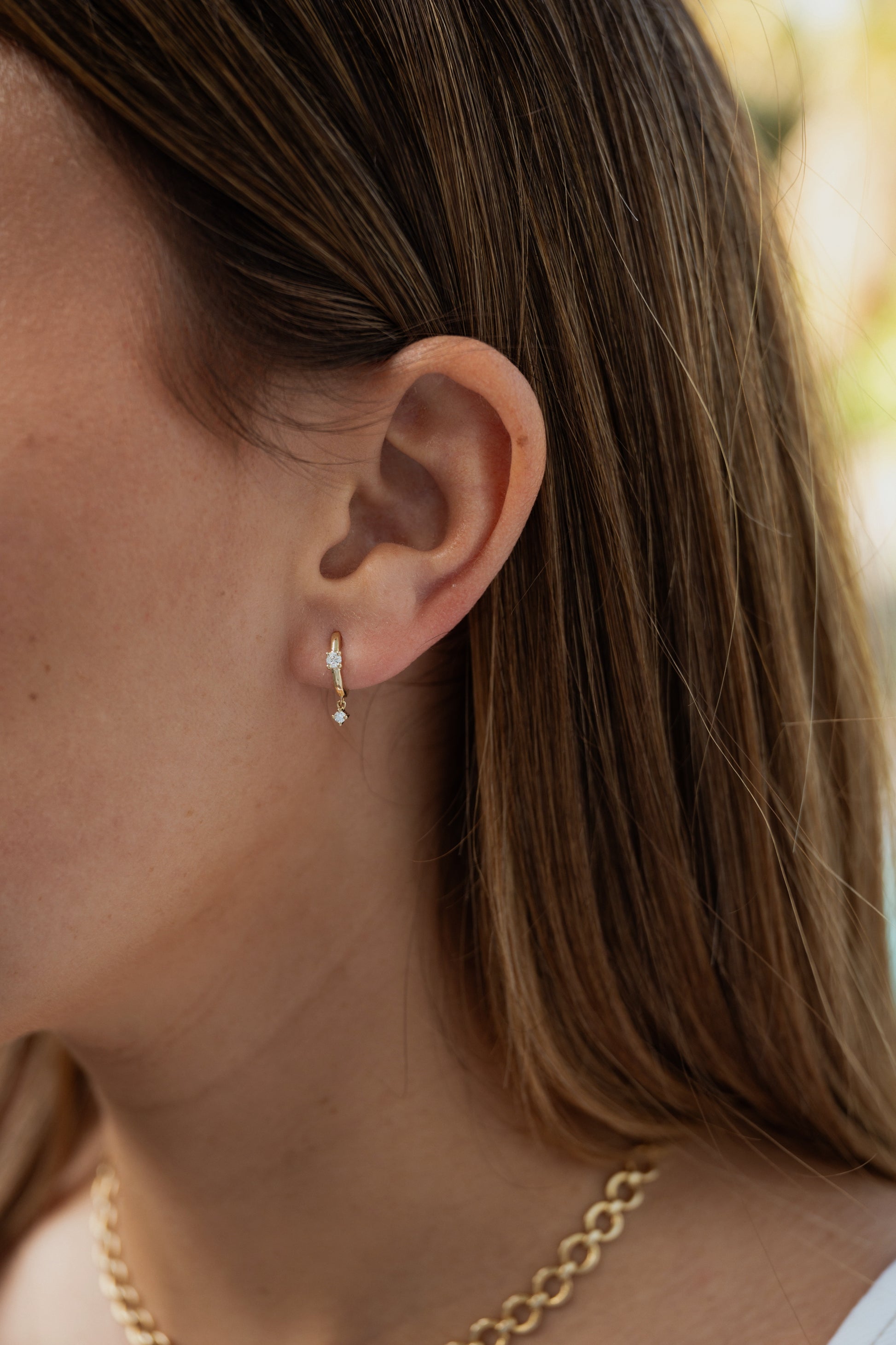In collaboration with Becca & Ali Sisto, the Mini Diamond Drop Huggies bring effortless sparkle to sunlit days and summer nights. A delicate diamond drop sways from each petite hoop, catching the light with every move. Perfect for layering into your earscape or wearing solo for a hint of brilliance, they’re your go-to for warm-weather elegance.