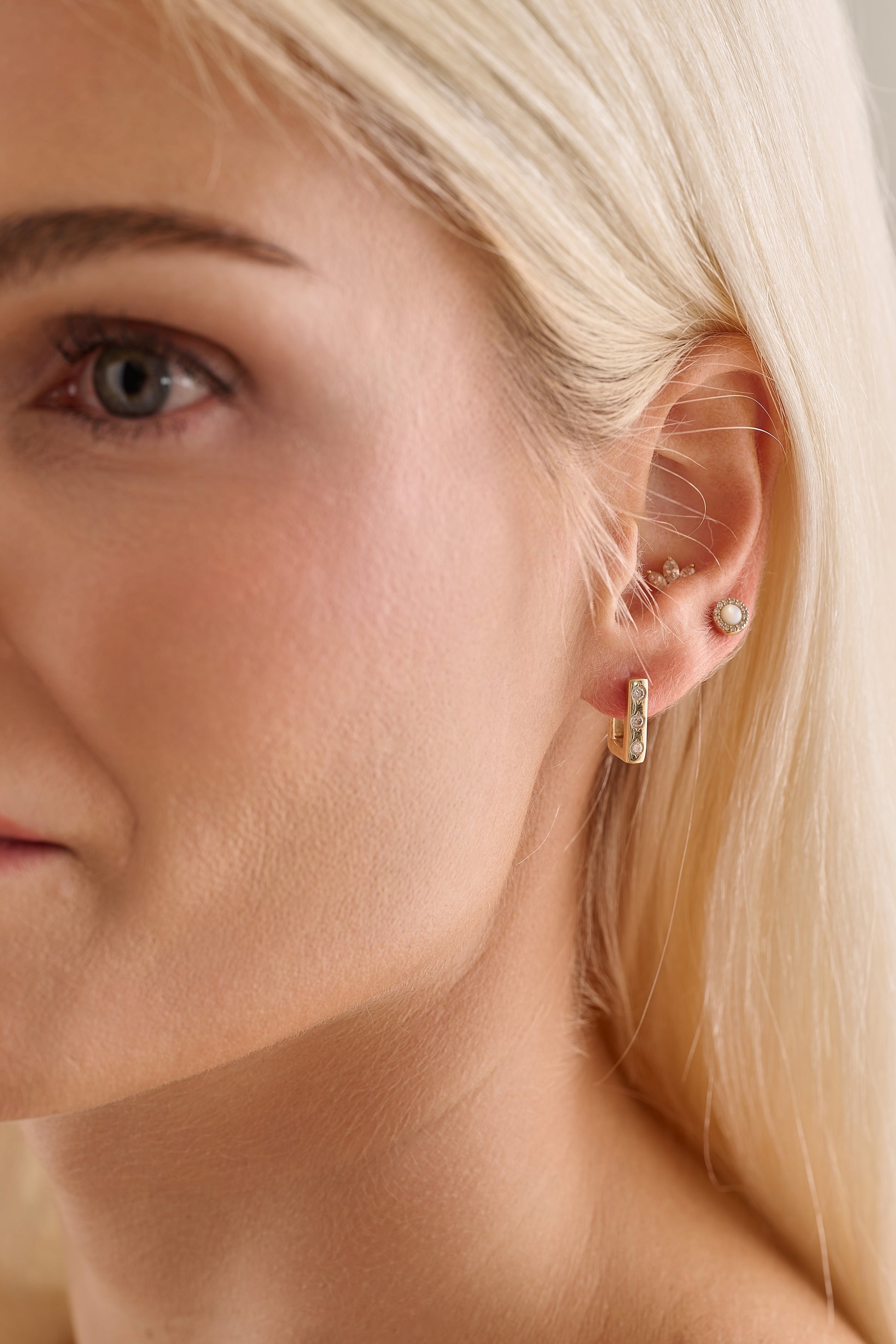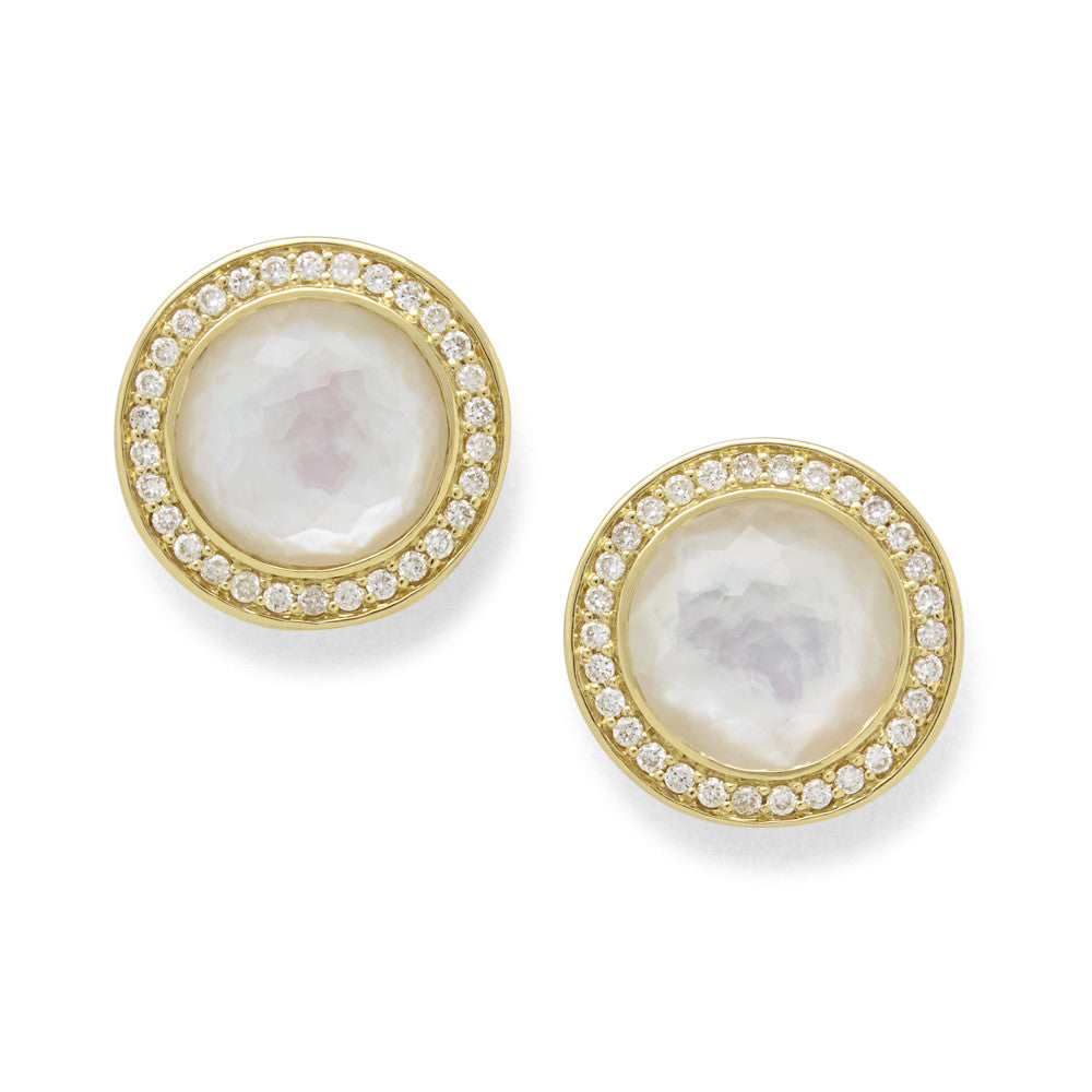 Meet everyone's latest favorite petite stud earring. Feminine details elevate these earrings to the next level. Mother of pearl surrounded by a halo of bright white diamonds these studs are sure to bring a smile to your face each time you reach for them.