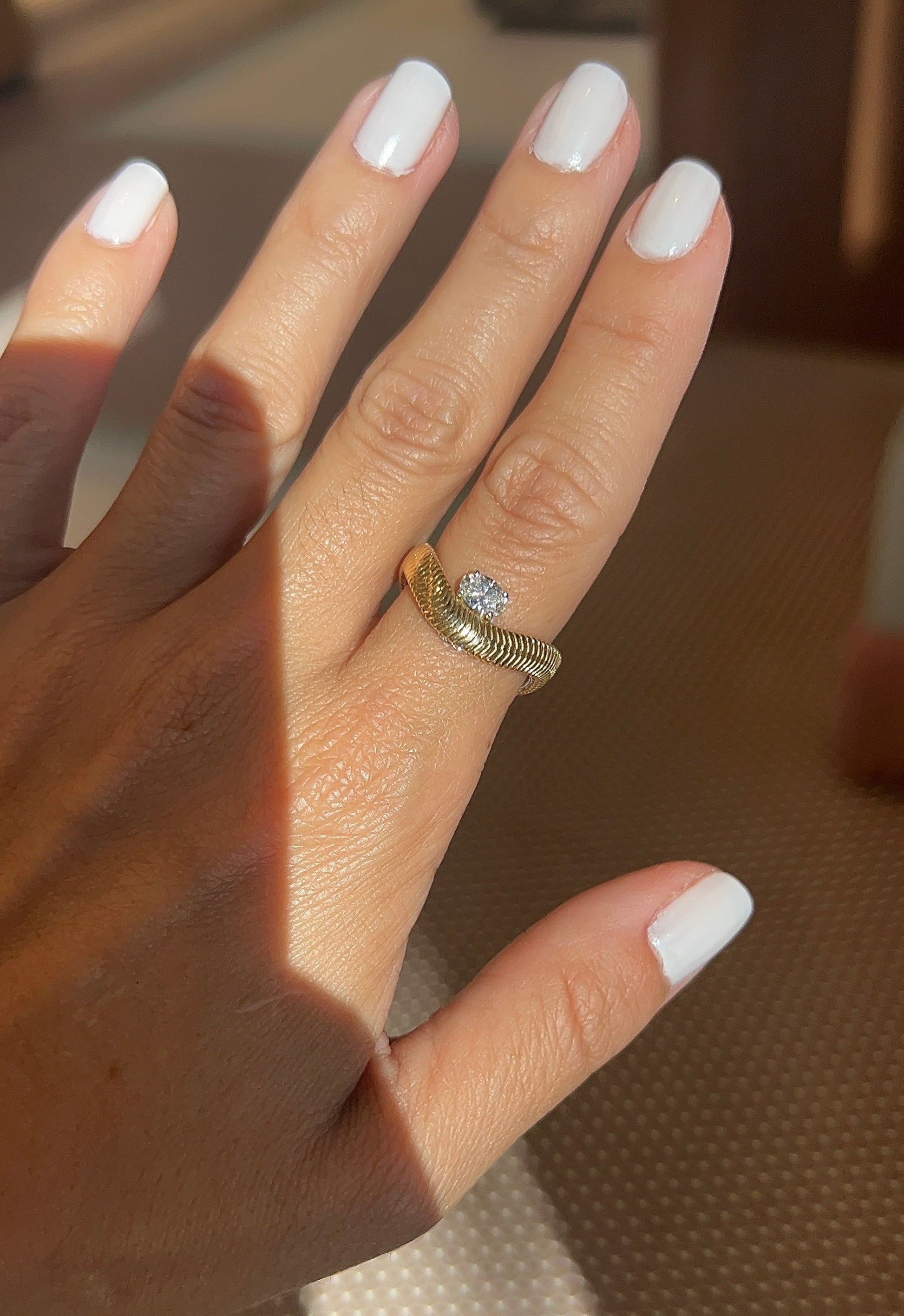 Graceful and modern, the Diamond Oval Feelings Ring features a curved design adorned with a luminous oval diamond on a sleek snake-chain band. A sophisticated, fluid piece that captures light and elegance from every angle.