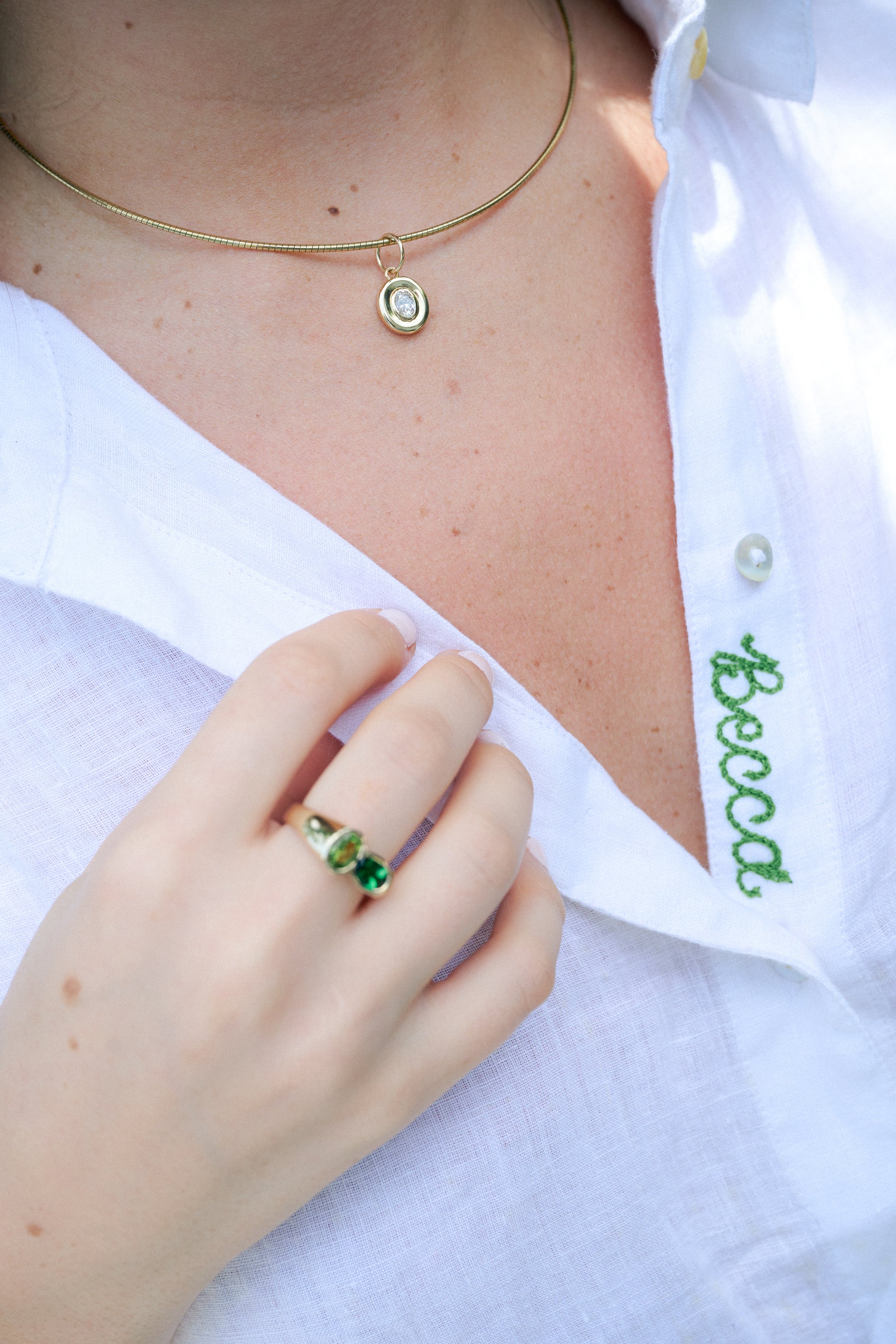In collaboration with Becca & Ali Sisto, the Oval Diamond Center Pendant was designed to mark life’s most meaningful moments with quiet brilliance. A single 0.5 carat oval-cut diamond, set in 14K gold, offers timeless elegance with just the right edge. Wear it solo as a statement or layer it onto any chain to make it your own—this piece was made to move with you.