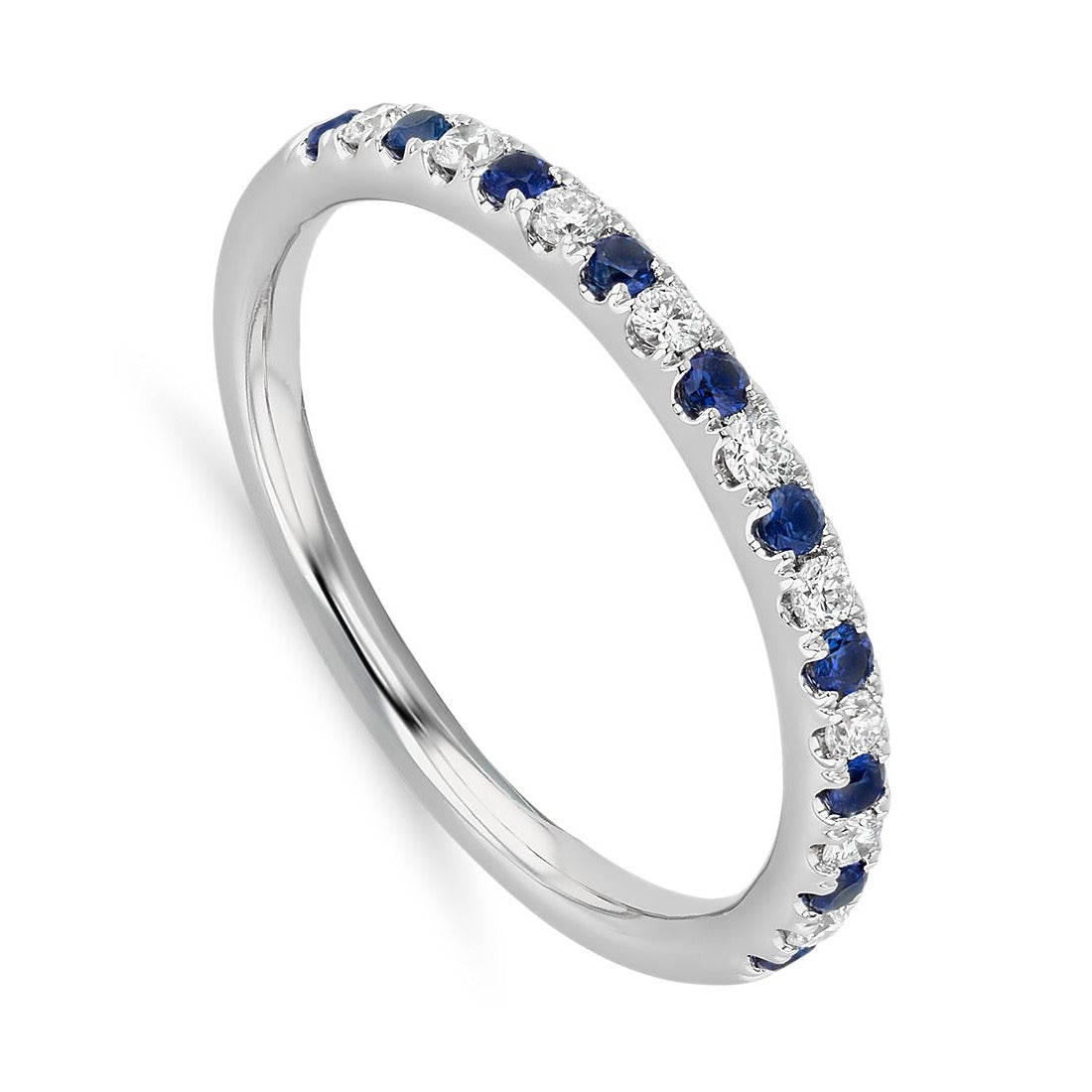Your Something Blue! Delicate and brilliant, this sapphire and diamond ring is crafted in a petite design of white gold, featuring alternating pavé set diamonds and sapphires.