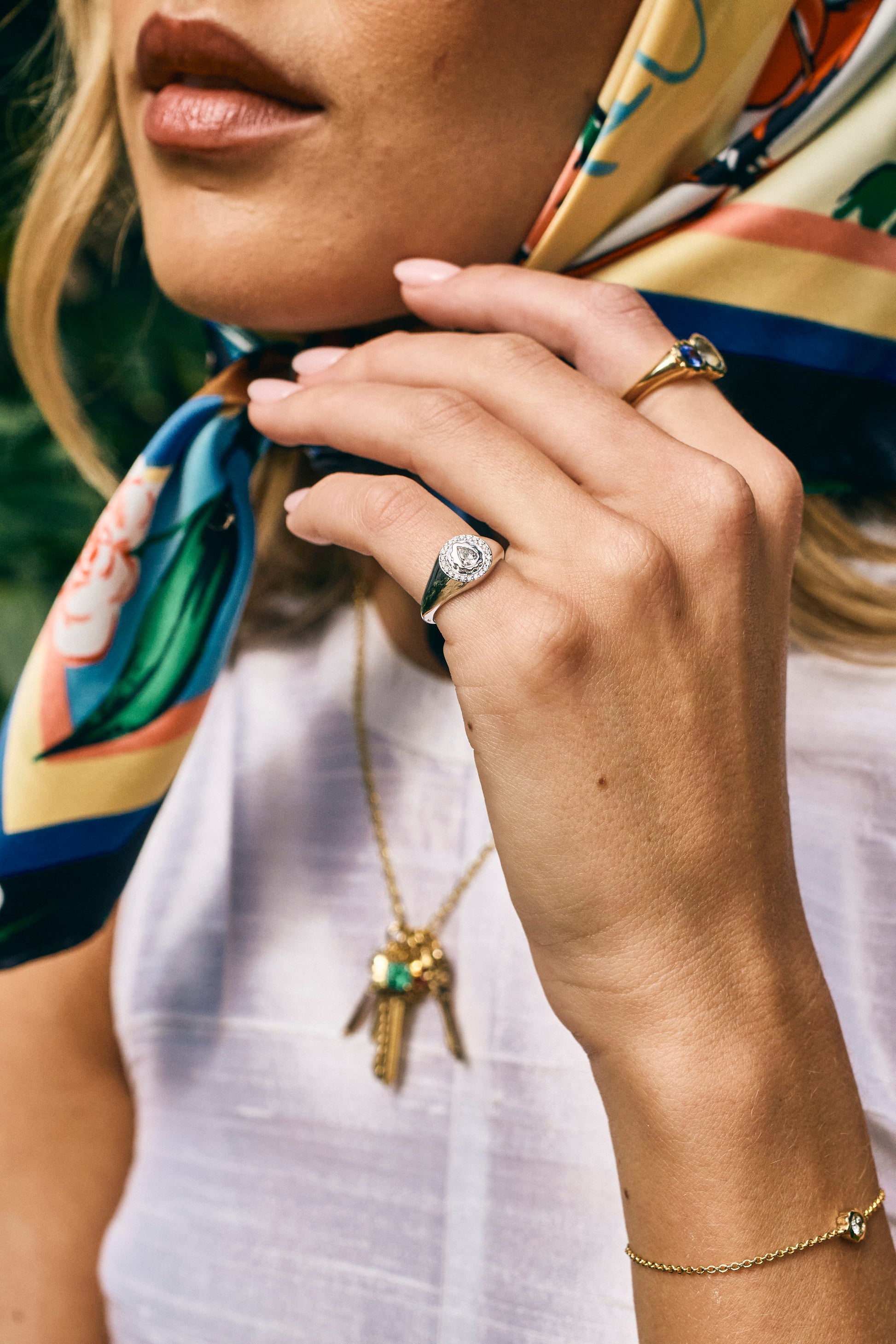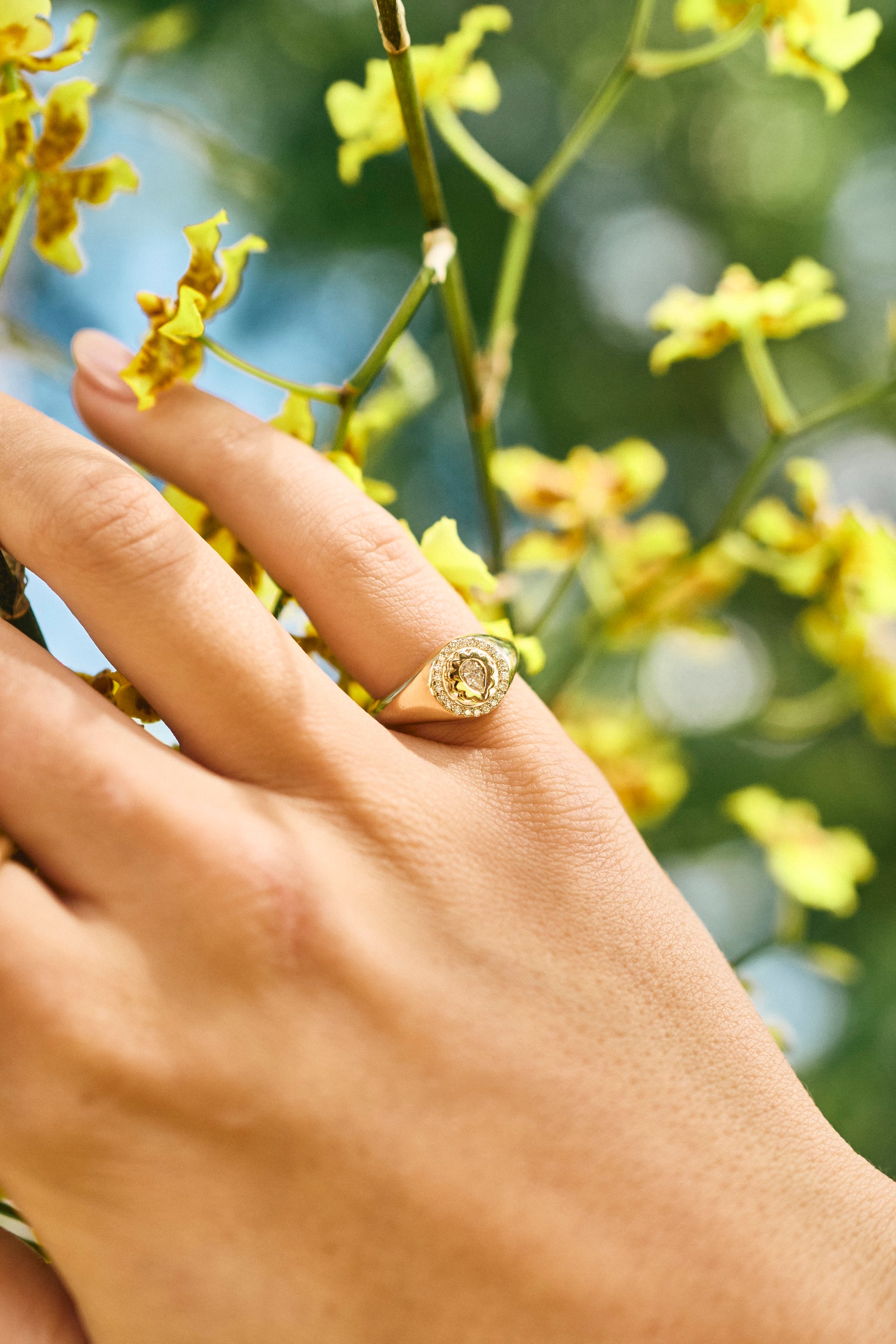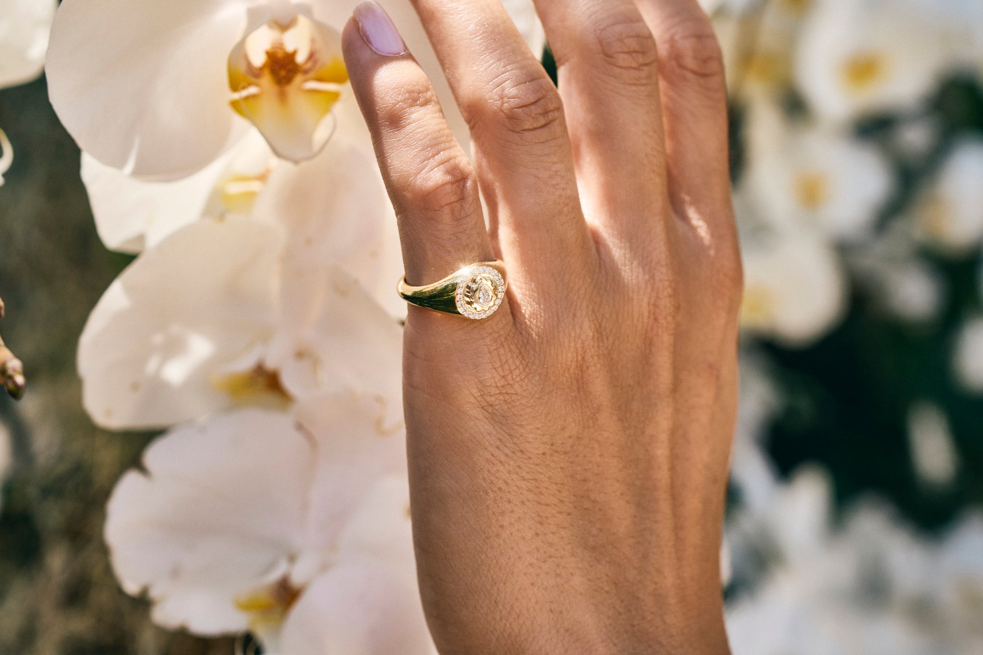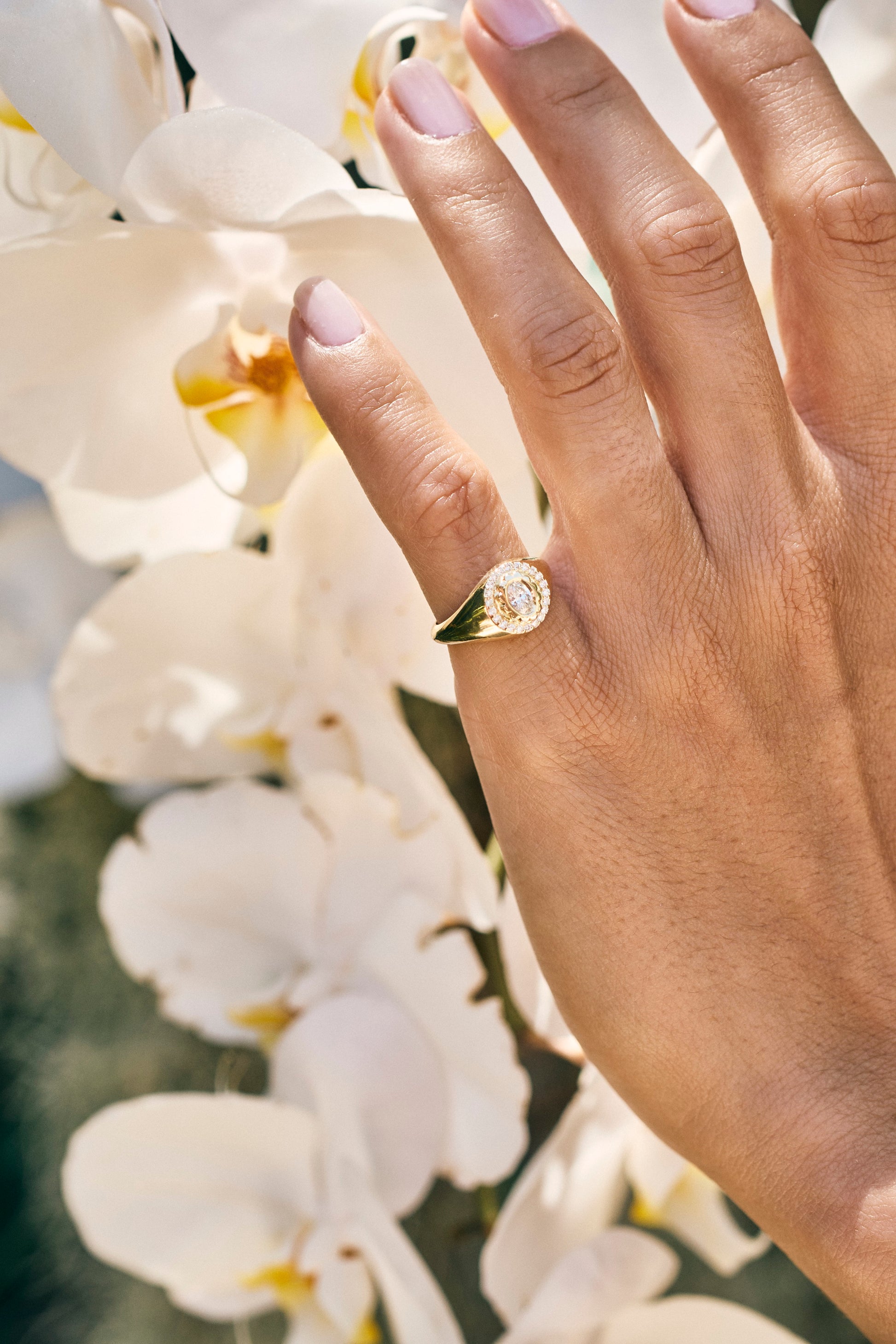 The Diamond Scallop Pinky Ring is the epitome of elegance in a petite yet powerful design. Featuring a brilliant fancy shape diamond at its center, with a halo of diamonds around the scallop flush design. This ring radiates timeless sophistication with its elongated shape that maximizes sparkle.