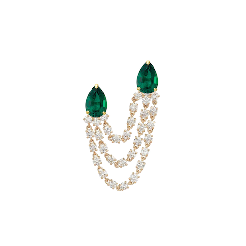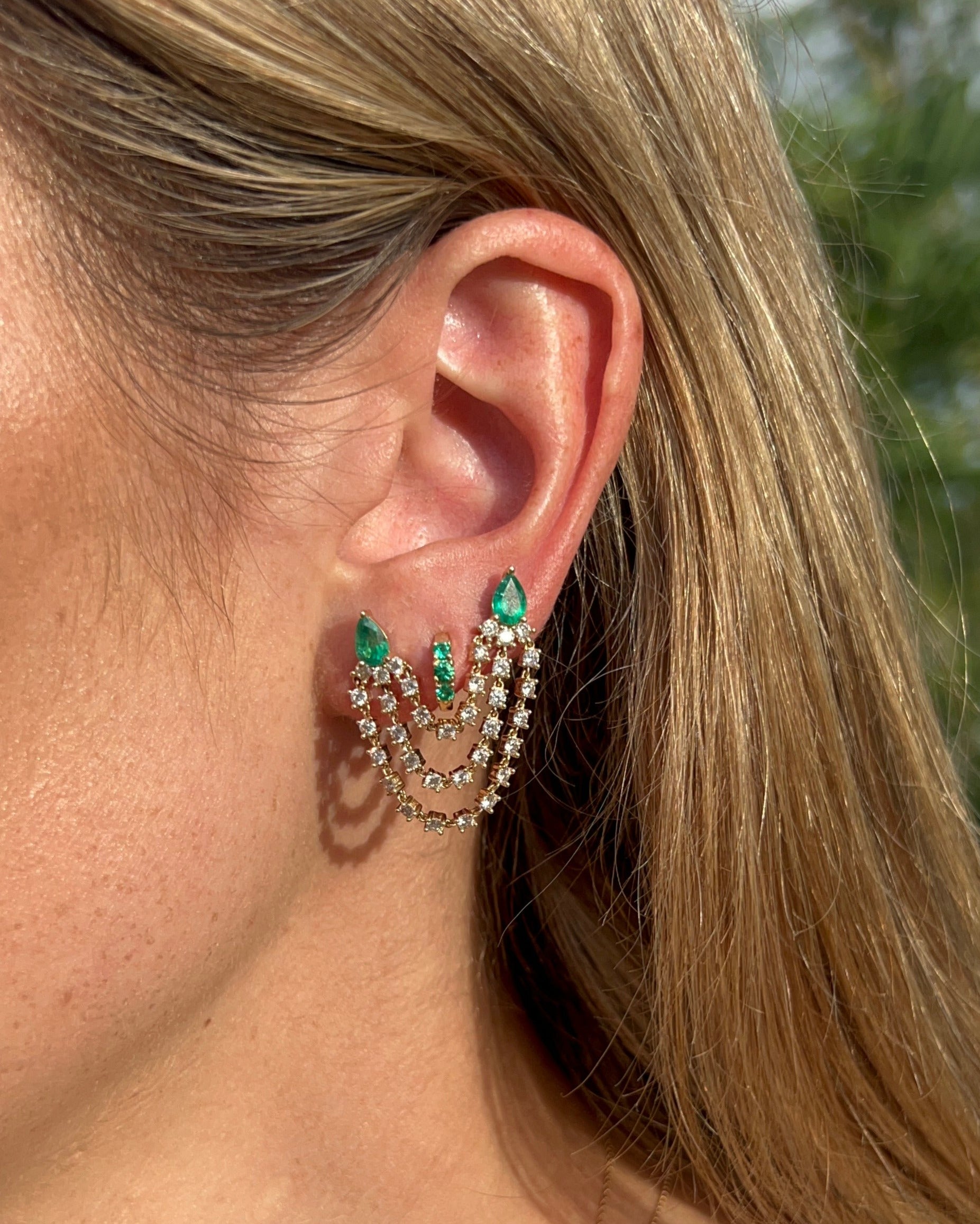 Take the earring stacking trend by storm with the ultimate jump rope earring. Featuring two pear shaped emeralds anchoring the earring and 3 rows of diamonds draping below the lobe. There are endless ways to style this single earring; we love it solo on one ear with a mixture of mini studs on the other!