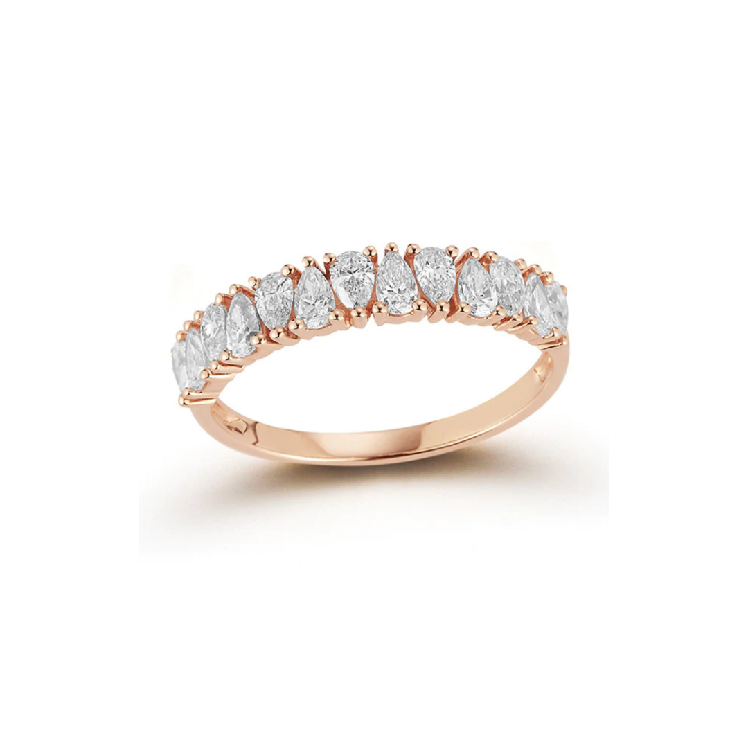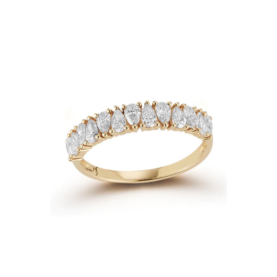 Alternating pear-shaped diamonds are prong-set in a gold shank. With just shy of a full carat of diamonds, we think this diamond ring will work alone, in a stack, or even as your beloved wedding band!