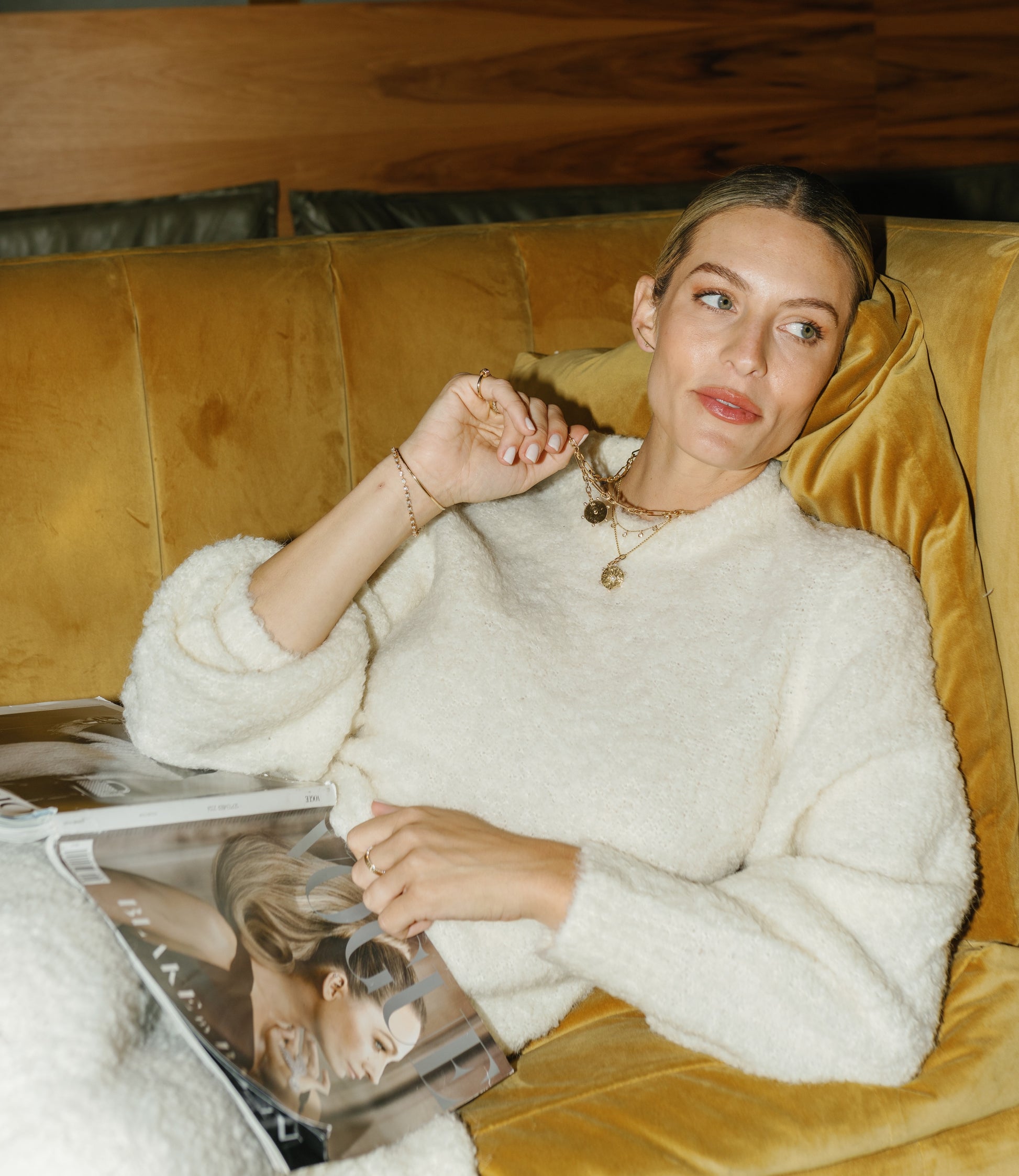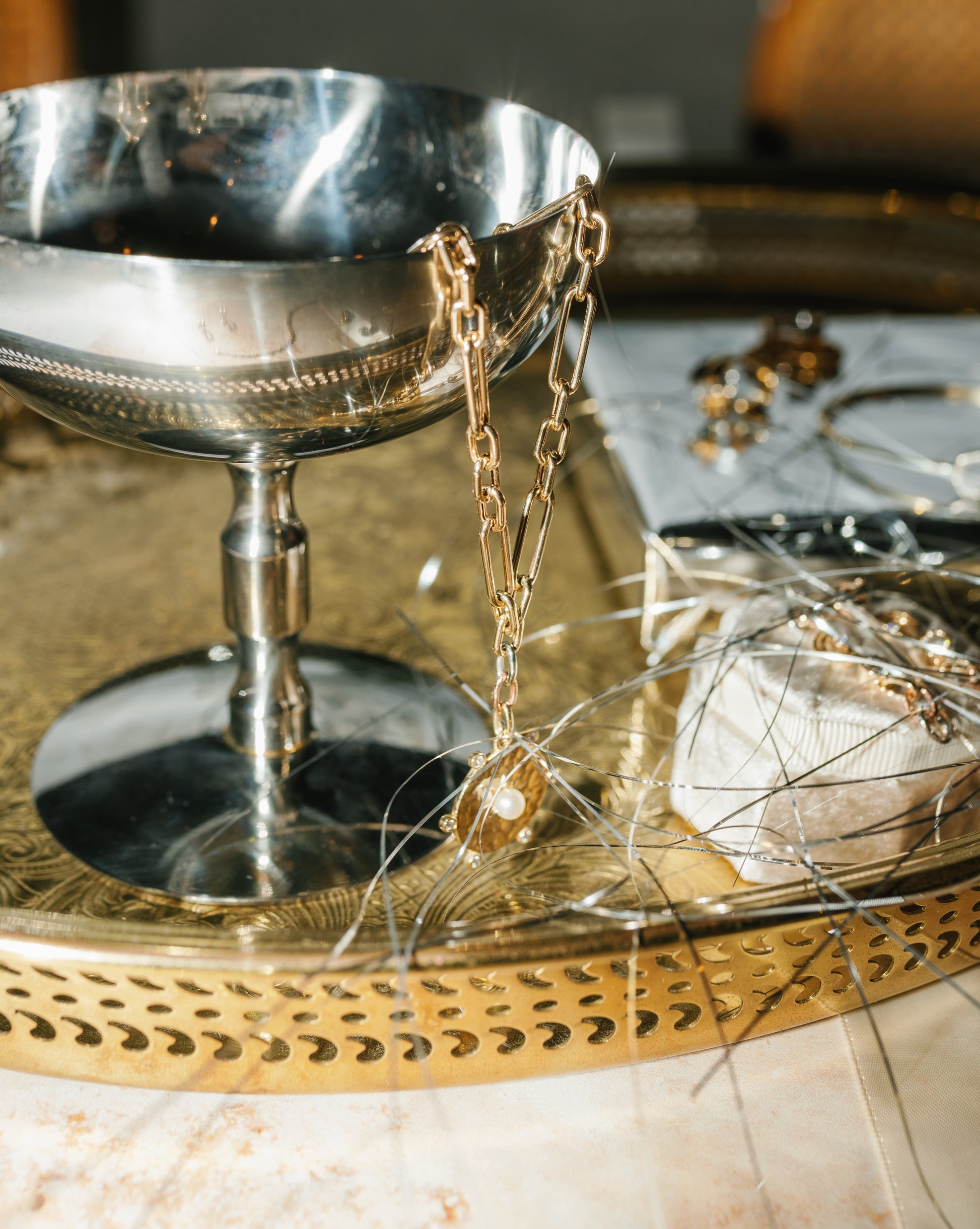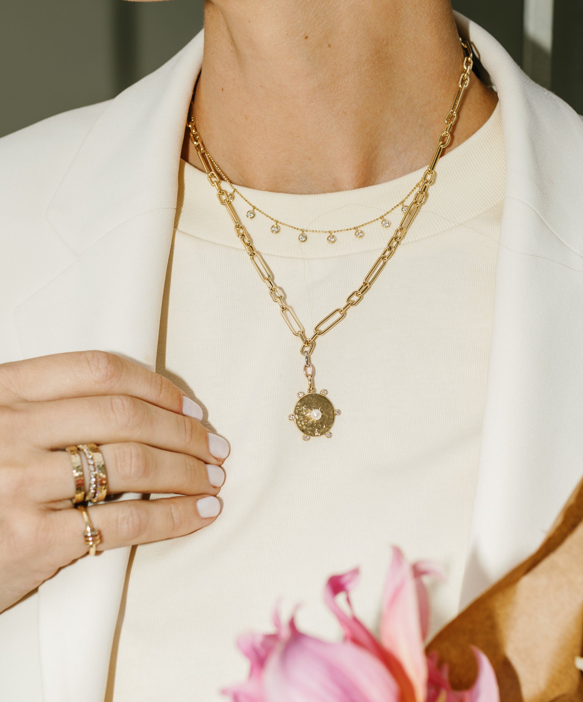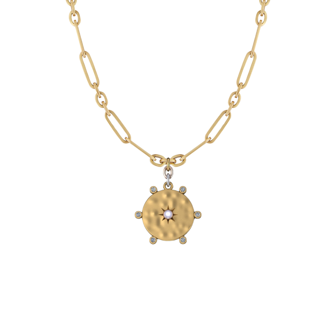 In collaboration with M.G. Style, the Alys Pearl Pendant Necklace showcases a radiant pearl at its heart, elegantly encircled by a hammered gold pendant. Inspired by M.G.'s wedding in Alys Beach, FL, the design features six bezel-set diamonds gracefully surrounding the pearl, evoking the nautical essence and timeless beauty of her special day.