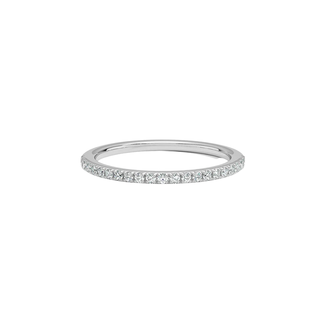 This petite diamond ring features pavé diamonds in elegantly sculpted prongs that extend one half of the way around the band. It is a beautiful complement to many delicate engagement rings.