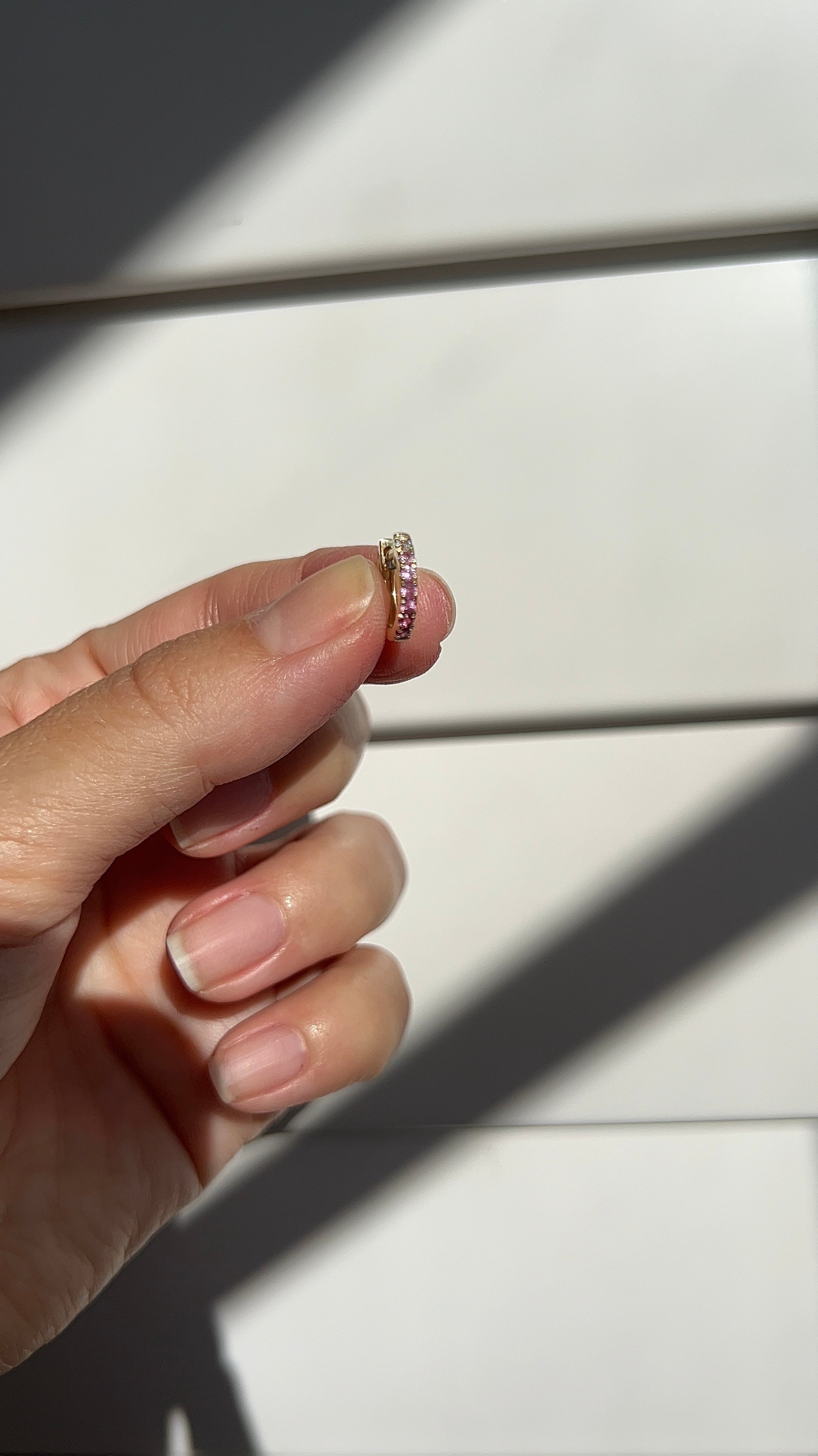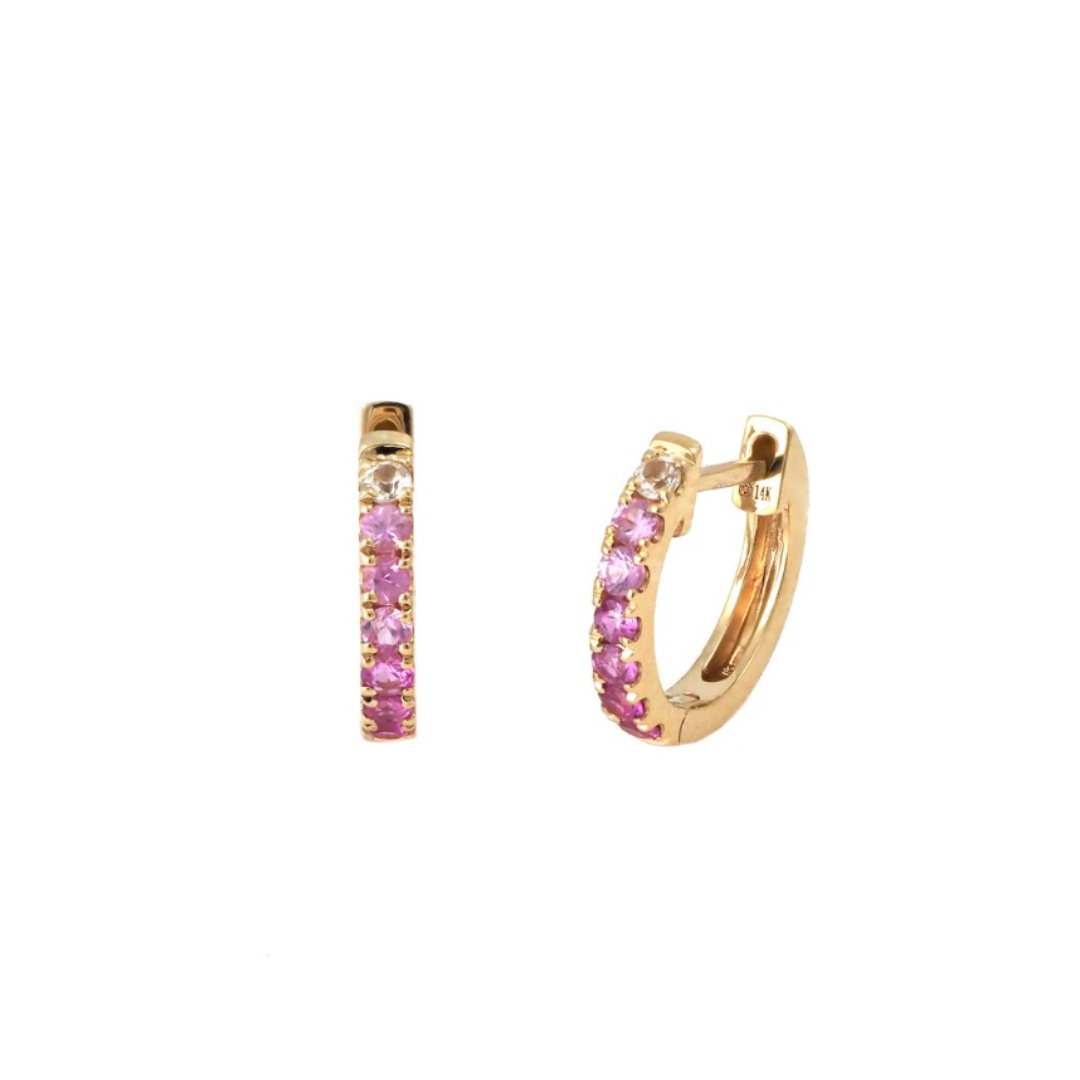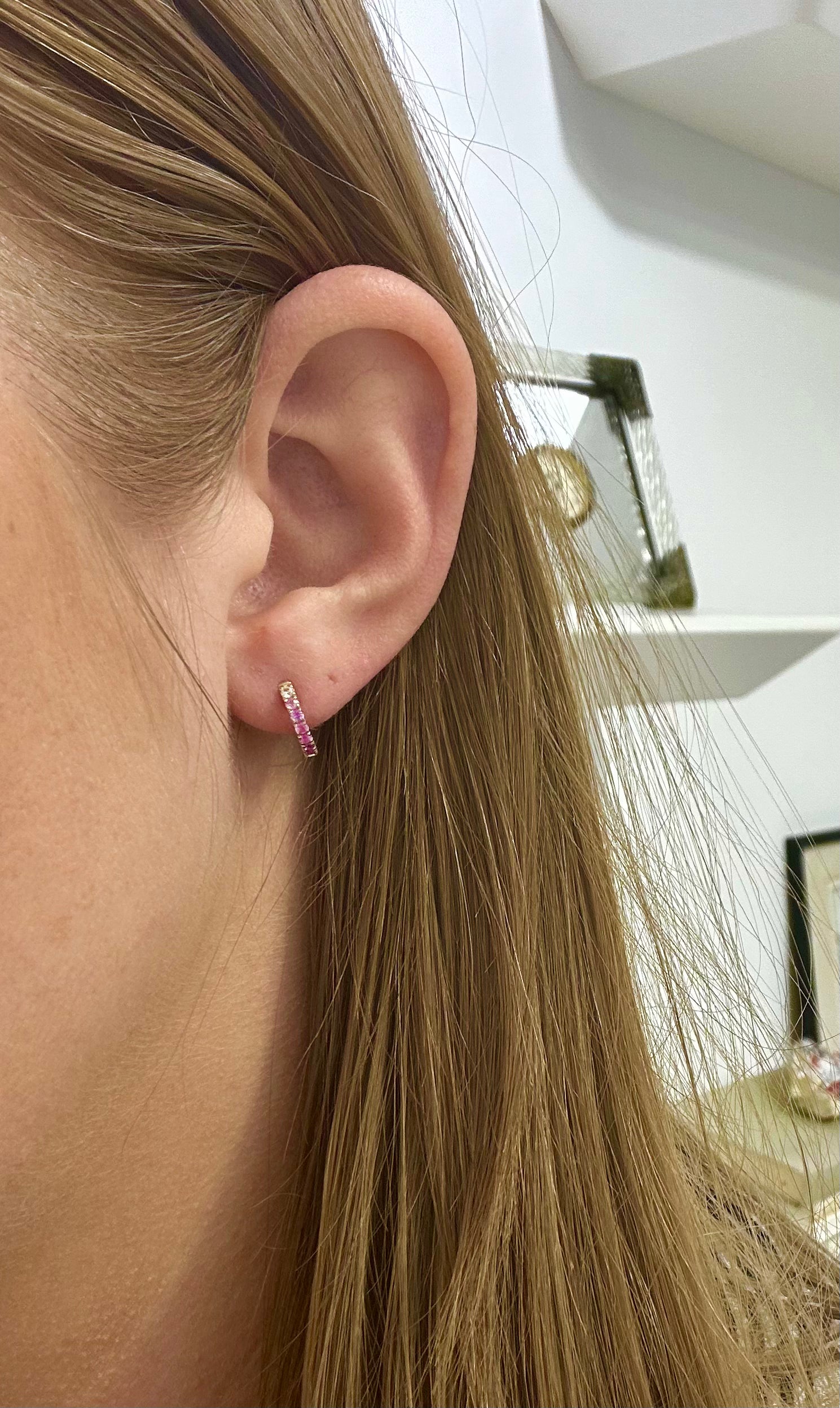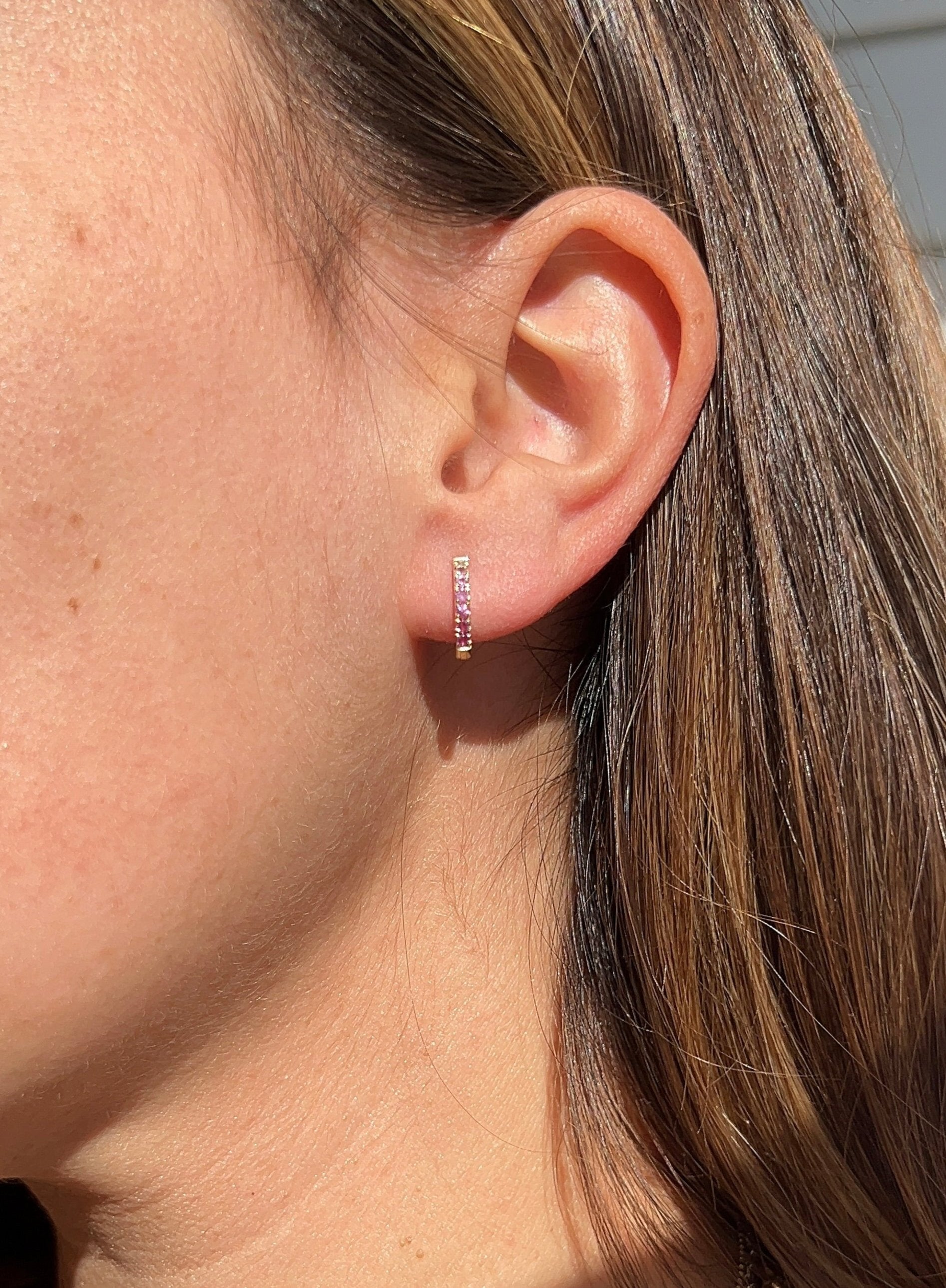 These Ombre Pink Sapphire Huggies showcase a stunning gradient of sapphires, transitioning from deep rose to soft baby pink. Each sapphire is meticulously set to create a seamless ombré effect, bringing a fresh pop of color to these chic, close-fitting hoops.