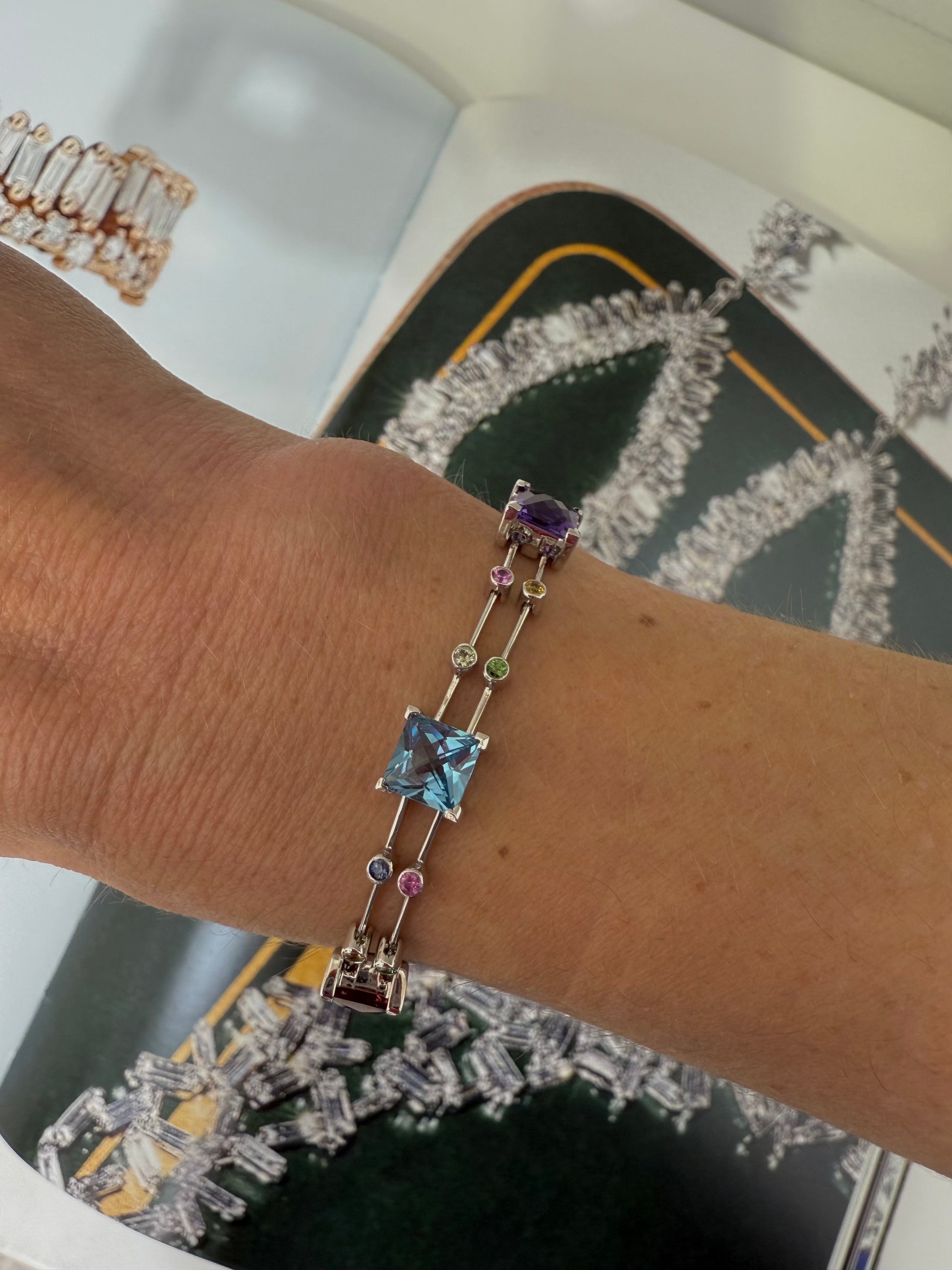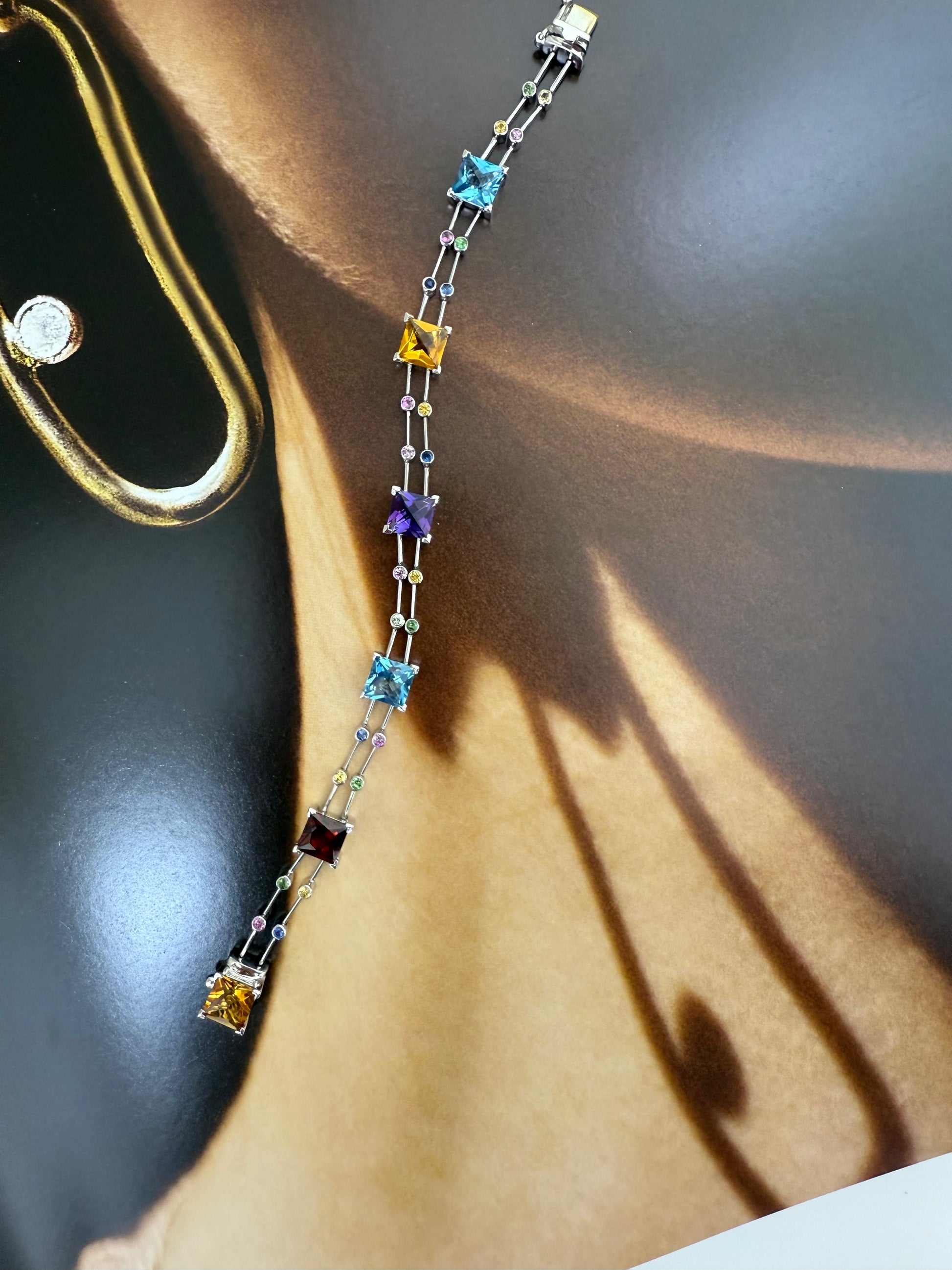 A celebration of color and elegance, our Rainbow Gemstone Bracelet showcases a mesmerizing sequence of Citrine, Garnet, Amethyst, and Blue Topaz, each meticulously set in radiant 14K white gold. The alternating square-cut gemstones create a harmonious blend of warm and cool tones, making it a versatile statement piece. Wear it alone for a refined pop of color or layer it for a bold, luminous look.