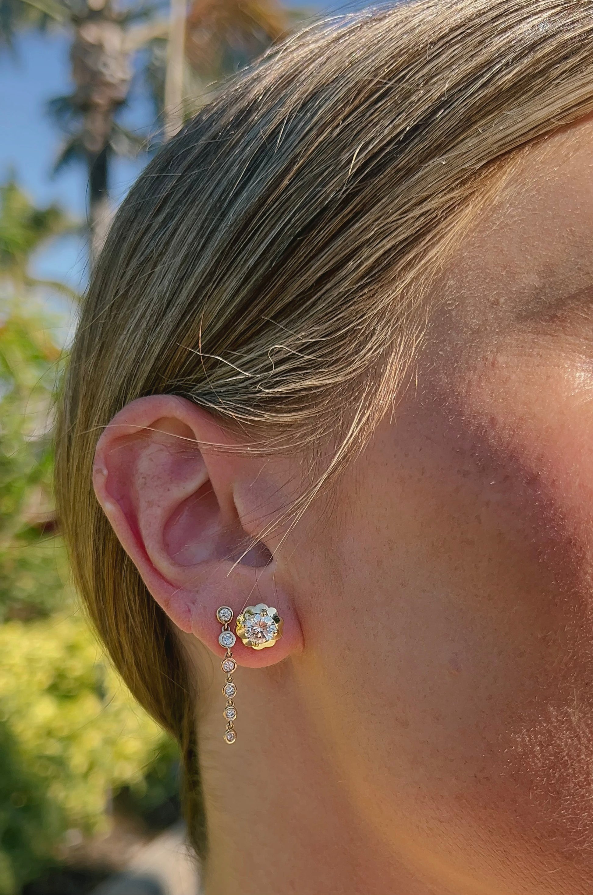 The Scalloped Round Diamond Studs showcase stunning round cut diamonds set in a unique bezel setting with our signature delicate scalloped edge. The elegant design enhances the brilliance of the diamonds, offering a sophisticated, modern twist on a classic stud. Perfect for any occasion, these earrings add a touch of timeless luxury and refined sparkle to your jewelry collection.