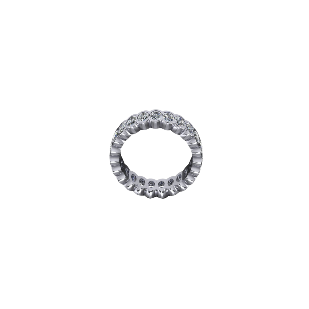 A modern symbol of forever. This striking band features a continuous loop of oval diamonds, each precisely nestled into a shared bezel setting that demands exacting craftsmanship. The seamless design highlights each stone’s brilliance while creating a fluid, sculptural silhouette. Perfect as a wedding band or heirloom, it’s a testament to enduring love and meticulous artistry.
