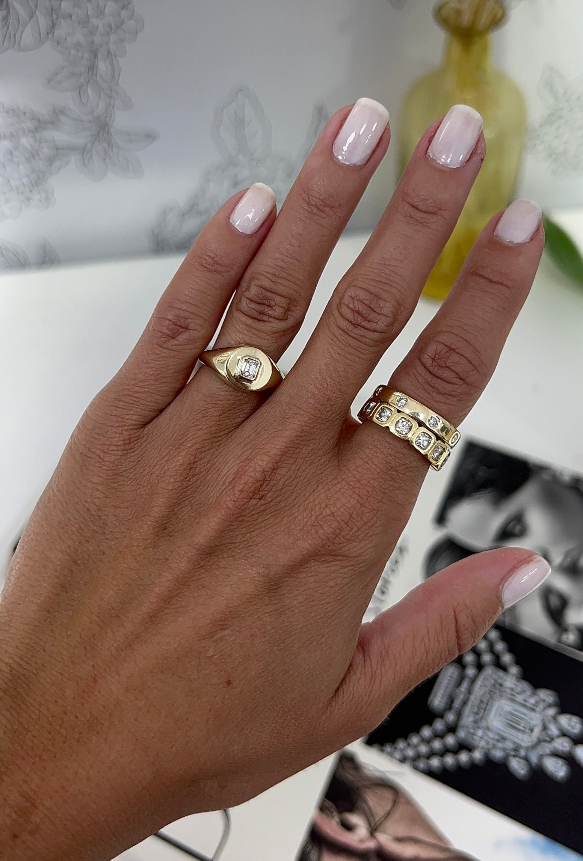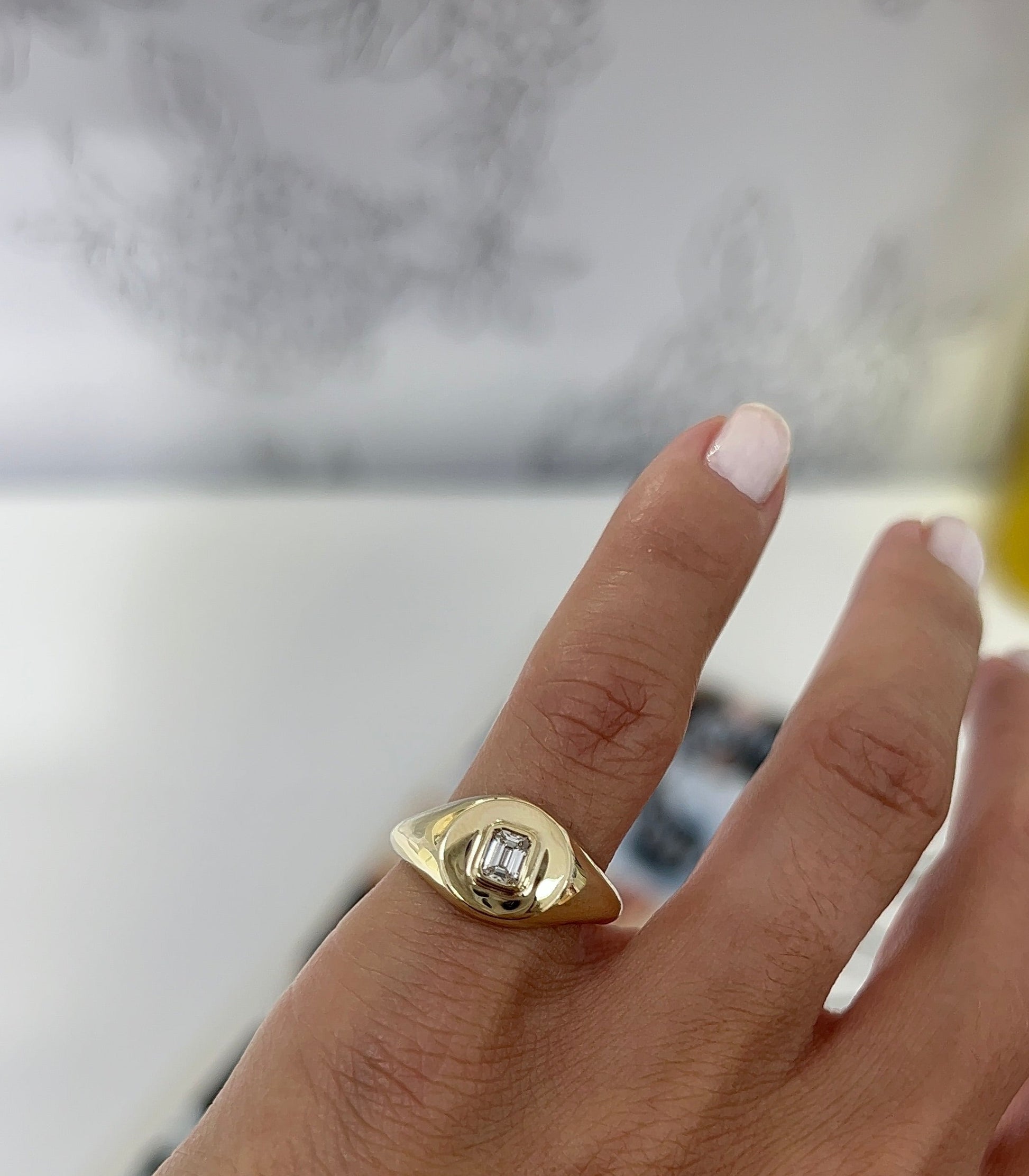 This modern take on a quintessential jewelry style is already a HN favorite. For a fresh take on this classic style, we flush-set an emerald cut diamond for a little extra sparkle. This ring is perfect worn alone on a pointer or pinky!