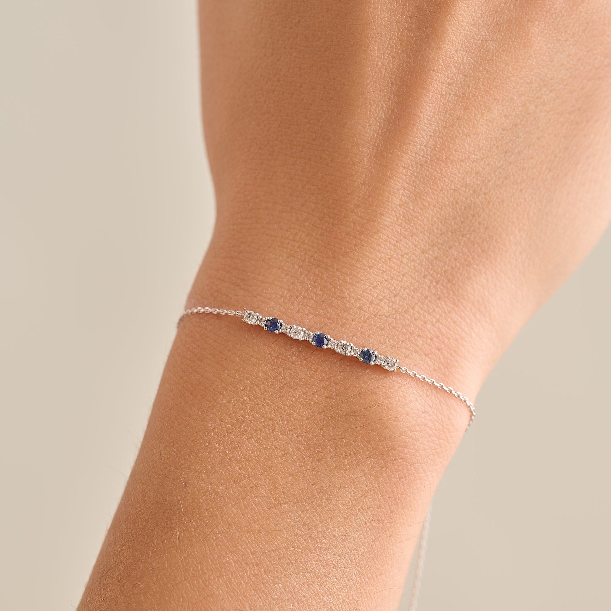 Beautifully handcrafted round diamonds and blue sapphires on an 18k solid gold cable link chain adjustable bracelet. Available in 18k yellow and white gold. Uber chic and timeless bracelet, perfect by itself or stacked.