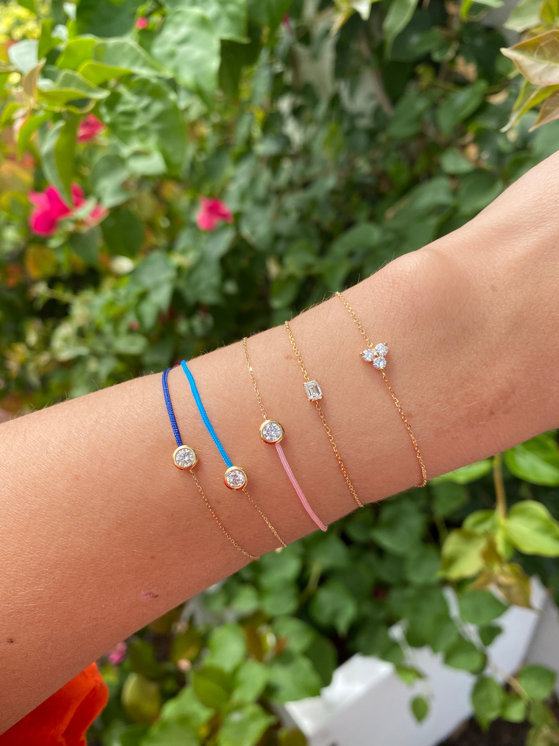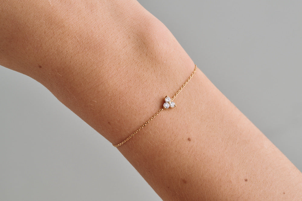 Beautifully handcrafted trio of round diamonds on an 18k solid gold cable link chain adjustable bracelet. Available in 18k yellow and white gold. Uber chic and timeless bracelet, perfect by itself or stacked.