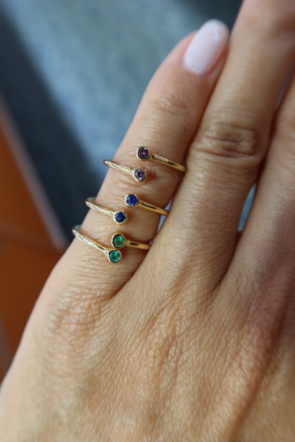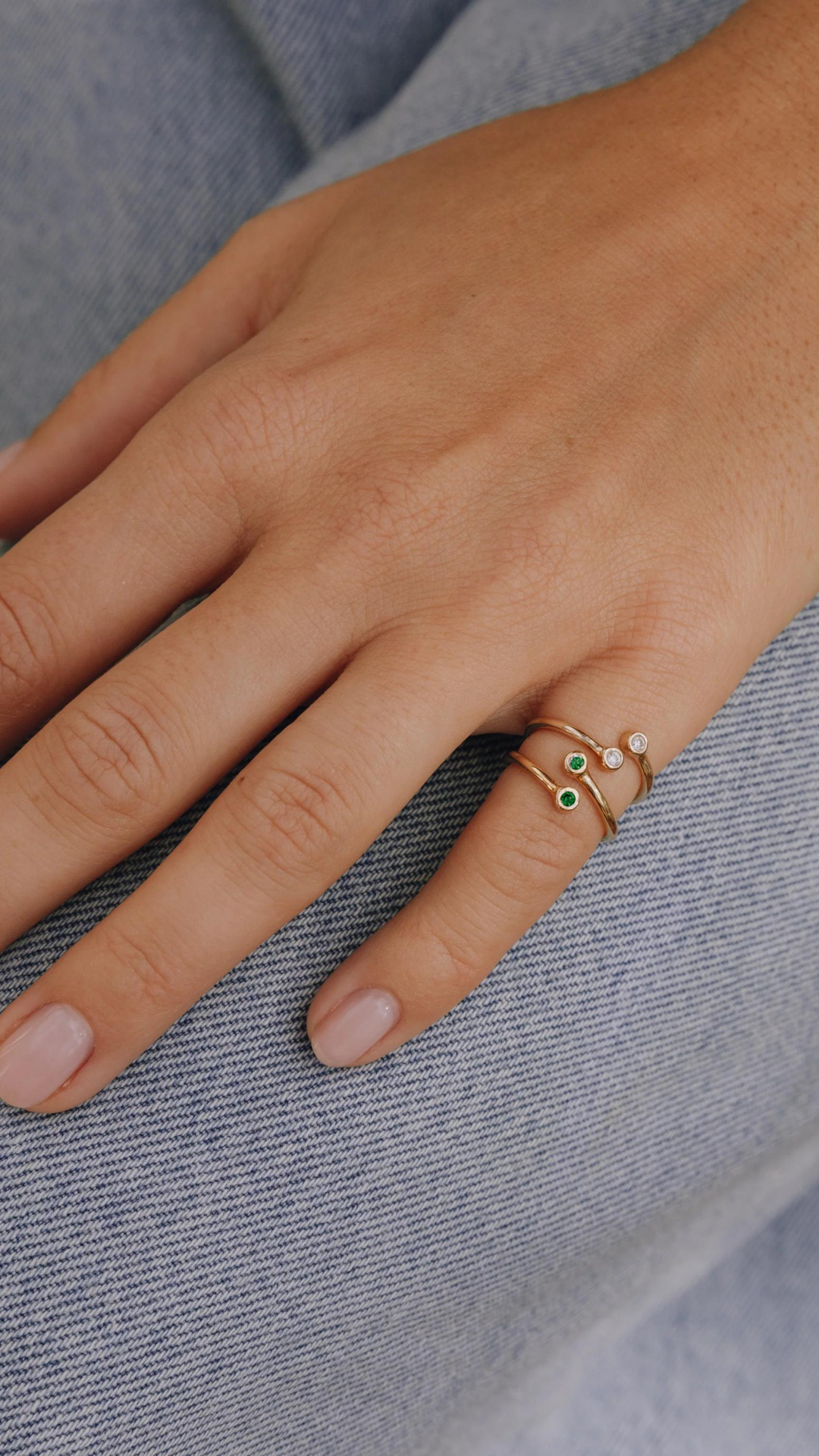 Our best-seller now comes in colored gemstones! Two round cut natural, untreated gemstones are are bezel set on a solid gold twist ring. Gift to yourself or your bestie for life!