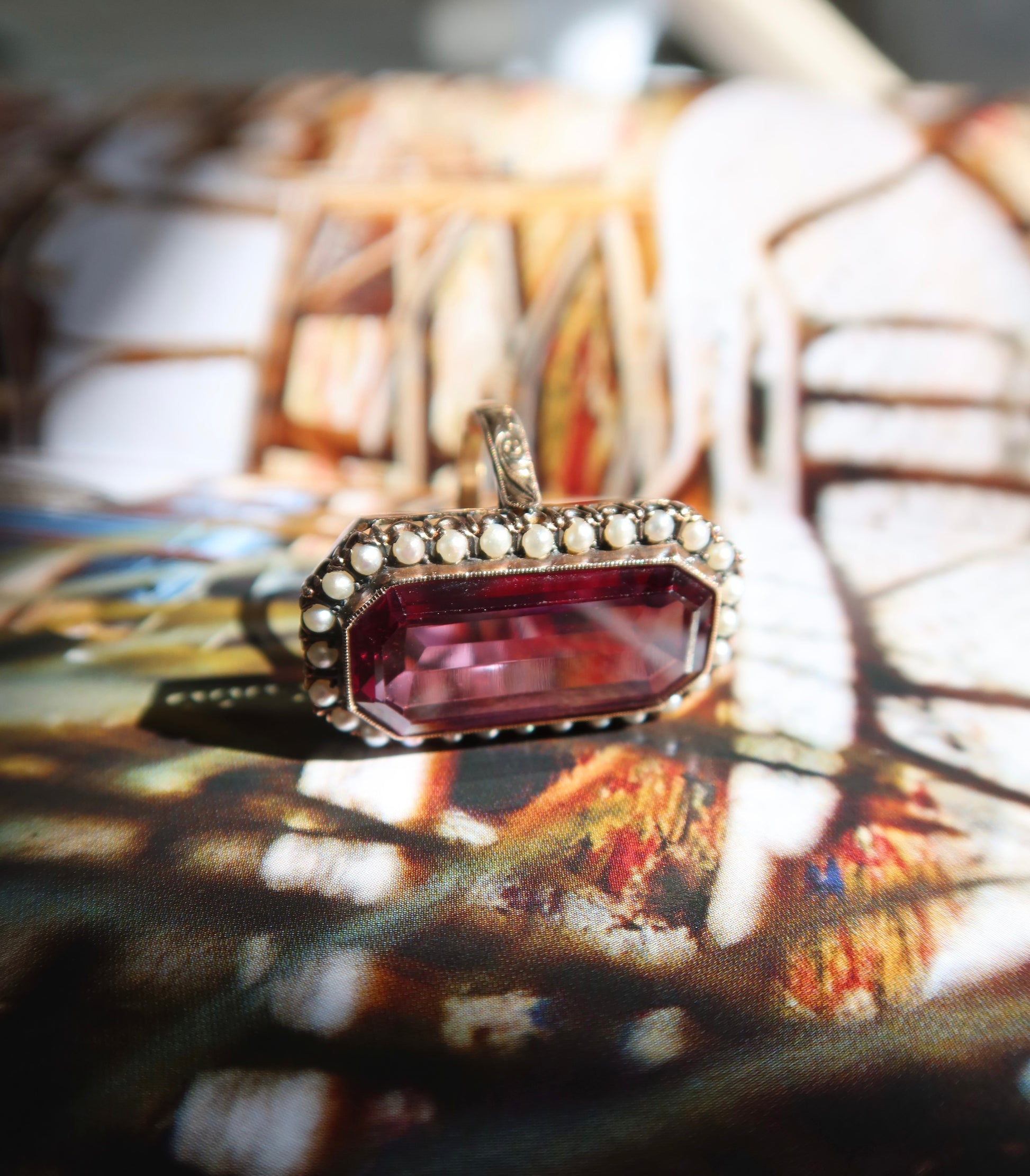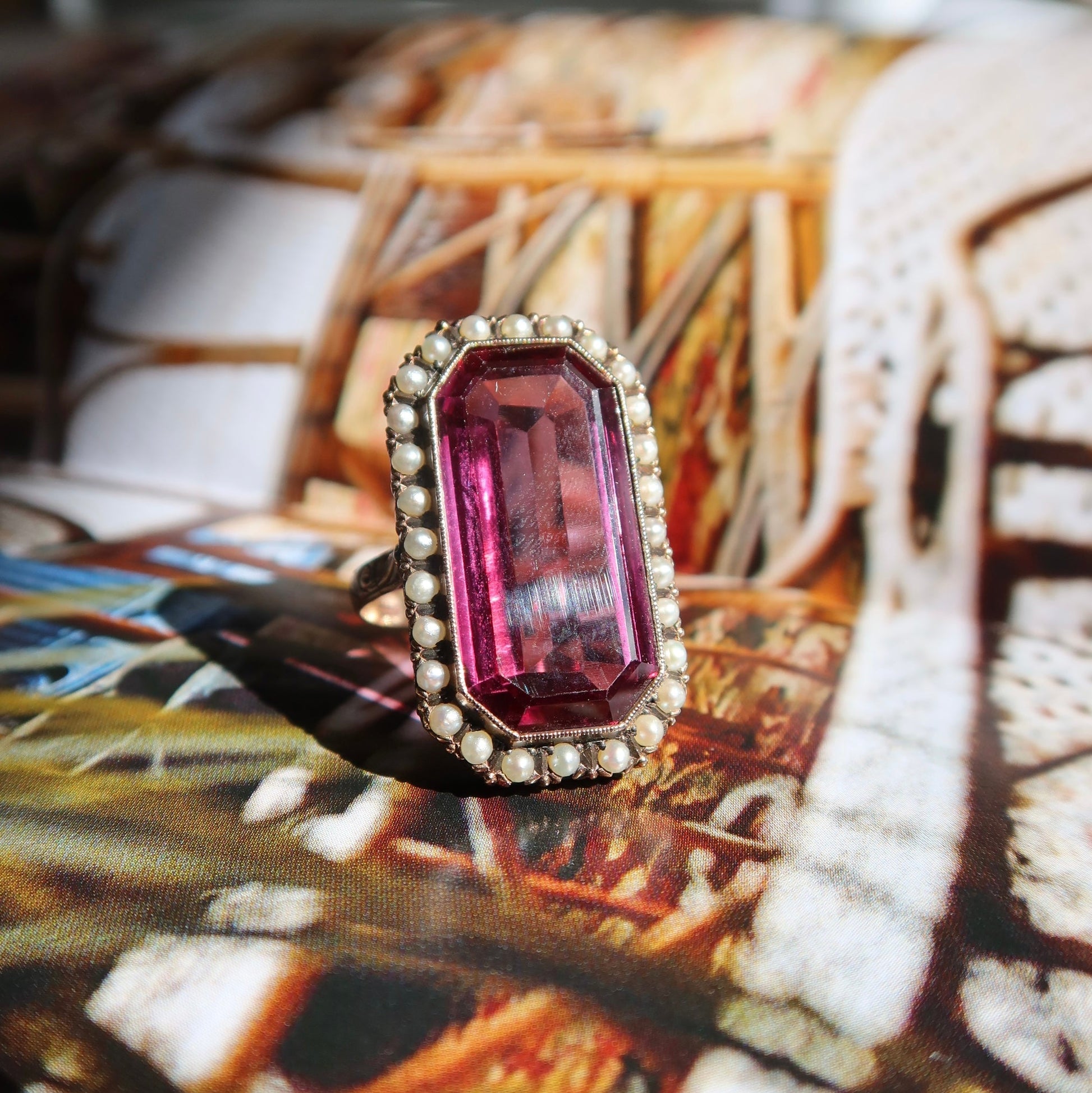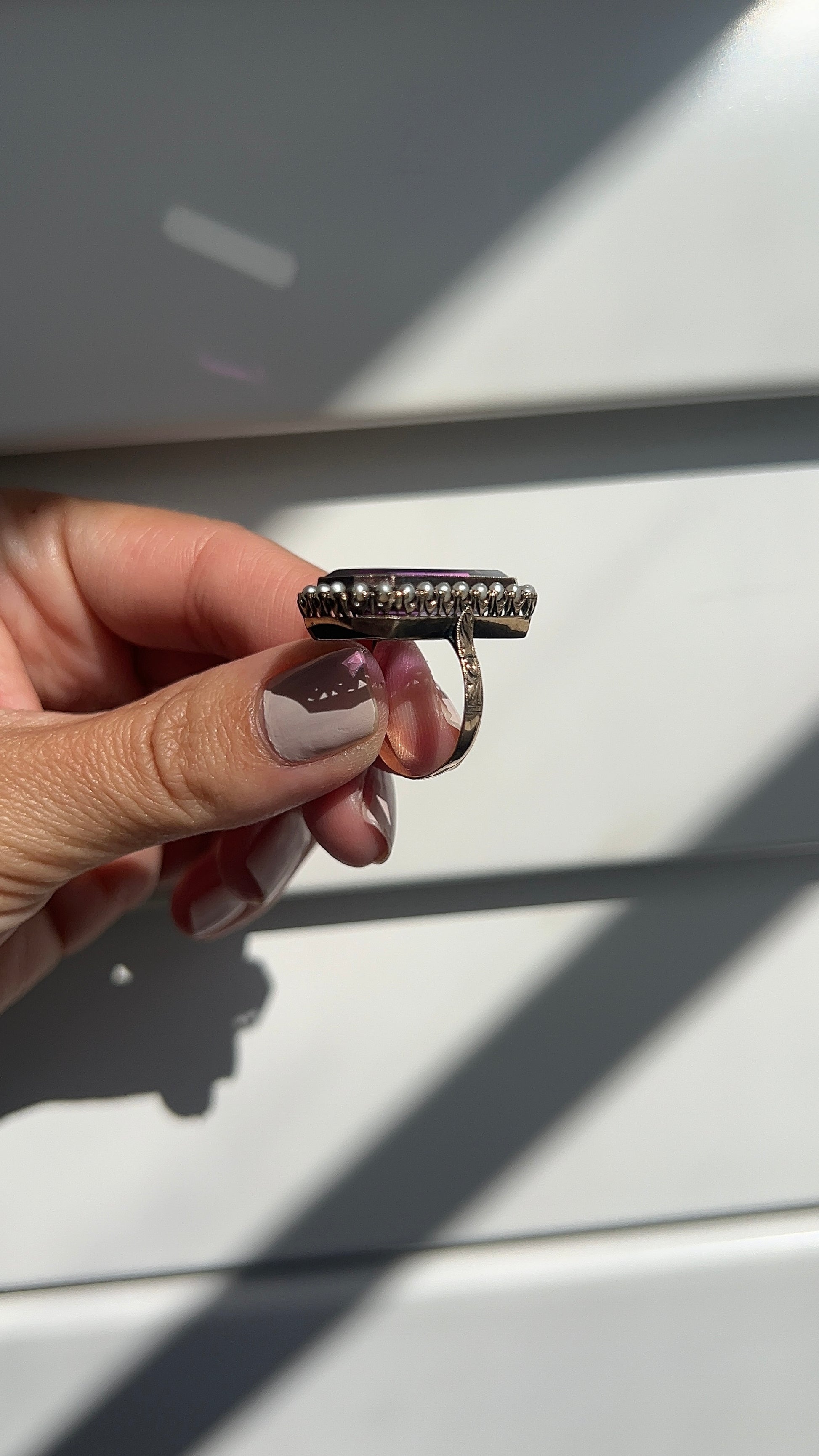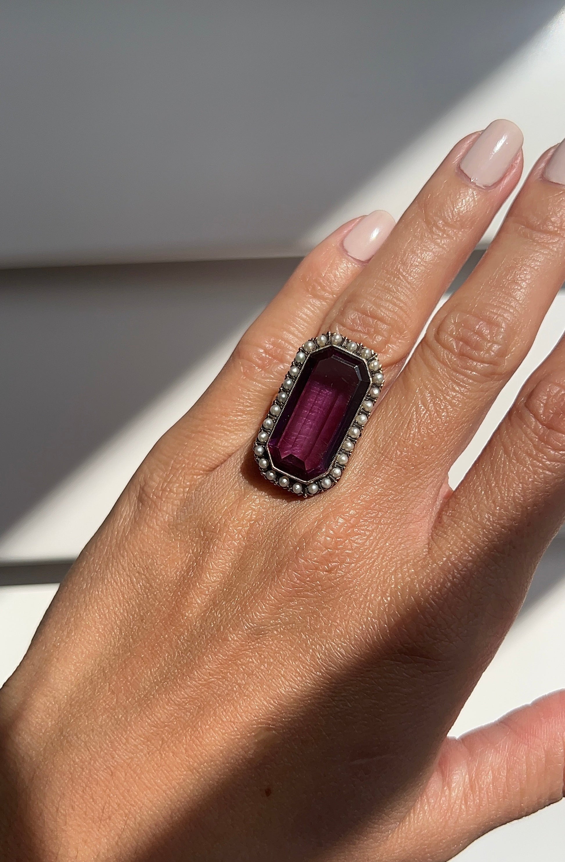 This Vintage Pearl and Amethyst Cocktail Ring showcases a captivating amethyst centerpiece, radiating deep purple hues, encircled by a halo of luminous pearls. The intricate vintage setting enhances its timeless elegance, making it a true statement of sophistication. Perfect for special occasions or adding a touch of vintage glamour to your collection, this ring is a classic treasure.